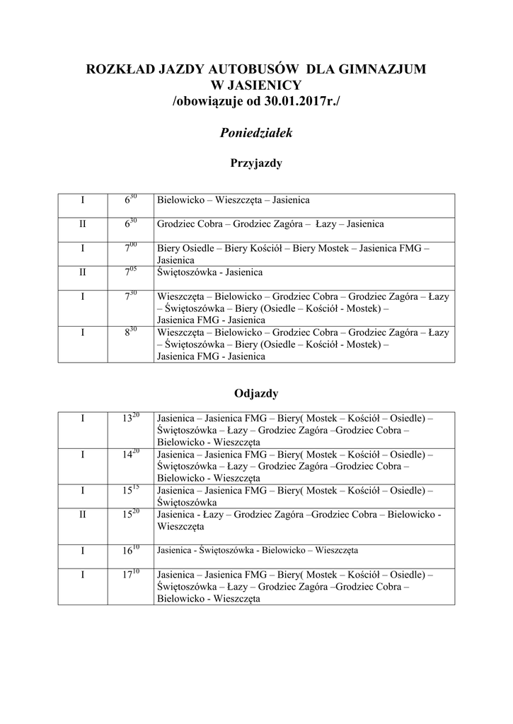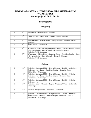 ROZKŁAD JAZDY AUTOBUSÓW DLA GIMNAZJUM W JASIENICY /obowiązuje od 30.01.2017r./ Poniedziałek Przyjazdy I 630 Bielowicko – Wieszczęta – Jasienica II 630 Grodziec Cobra – Grodziec Zagóra – Łazy – Jasienica I 700 II 705 Biery Osiedle – Biery Kościół – Biery Mostek – Jasienica FMG – Jasienica Świętoszówka - Jasienica I 730 I 830 Wieszczęta – Bielowicko – Grodziec Cobra – Grodziec Zagóra – Łazy – Świętoszówka – Biery (Osiedle – Kościół - Mostek) – Jasienica FMG - Jasienica Wieszczęta – Bielowicko – Grodziec Cobra – Grodziec Zagóra – Łazy – Świętoszówka – Biery (Osiedle – Kościół - Mostek) – Jasienica FMG - Jasienica Odjazdy I 1320 I 1420 I 1515 II 1520 I 1610 Jasienica - Świętoszówka - Bielowicko – Wieszczęta I 1710 Jasienica – Jasienica FMG – Biery( Mostek – Kościół – Osiedle) – Świętoszówka – Łazy – Grodziec Zagóra –Grodziec Cobra – Bielowicko - Wieszczęta Jasienica – Jasienica FMG – Biery( Mostek – Kościół – Osiedle) – Świętoszówka – Łazy – Grodziec Zagóra –Grodziec Cobra – Bielowicko - Wieszczęta Jasienica – Jasienica FMG – Biery( Mostek – Kościół – Osiedle) – Świętoszówka – Łazy – Grodziec Zagóra –Grodziec Cobra – Bielowicko - Wieszczęta Jasienica – Jasienica FMG – Biery( Mostek – Kościół – Osiedle) – Świętoszówka Jasienica - Łazy – Grodziec Zagóra –Grodziec Cobra – Bielowicko Wieszczęta Wtorek Przyjazdy I 630 Bielowicko – Wieszczęta – Jasienica II 630 Grodziec Cobra – Grodziec Zagóra – Łazy – Jasienica I 700 II 705 Biery Osiedle – Biery Kościół – Biery Mostek – Jasienica FMG Jasienica Świętoszówka – Jasienica I 830 Wieszczęta – Bielowicko – Grodziec Cobra – Grodziec Zagóra – Łazy – Świętoszówka – Biery (Osiedle – Kościół - Mostek) – Jasienica FMG - Jasienica Odjazdy I 1320 II 1320 I 1420 I 1515 II 1520 II 1610 II 1710 Jasienica – Jasienica FMG – Biery( Mostek – Kościół – Osiedle) – Świętoszówka Jasienica - Łazy – Grodziec Zagóra –Grodziec Cobra – Bielowicko Wieszczęta Jasienica – Jasienica FMG – Biery( Mostek – Kościół – Osiedle) – Świętoszówka – Łazy – Grodziec Zagóra –Grodziec Cobra – Bielowicko - Wieszczęta Jasienica – Jasienica FMG – Biery( Mostek – Kościół – Osiedle) – Świętoszówka Jasienica - Łazy – Grodziec Zagóra –Grodziec Cobra – Bielowicko Wieszczęta Jasienica – Jasienica FMG – Biery( Mostek – Kościół – Osiedle) – Świętoszówka – Łazy – Grodziec Zagóra –Grodziec Cobra – Bielowicko - Wieszczęta Jasienica – Jasienica FMG – Biery( Mostek – Kościół – Osiedle) – Świętoszówka – Łazy – Grodziec Zagóra –Grodziec Cobra – Bielowicko - Wieszczęta Środa Przyjazdy I 630 Bielowicko - Wieszczęta – Jasienica II 630 Grodziec Cobra – Grodziec Zagóra – Łazy – Jasienica I 700 II 705 Biery Osiedle – Biery Kościół – Biery Mostek – Jasienica FMG Jasienica Świętoszówka – Jasienica I 730 Wieszczęta – Bielowicko – Grodziec Cobra – Grodziec Zagóra – Łazy – Świętoszówka – Biery (Osiedle – Kościół - Mostek) – Jasienica FMG - Jasienica Odjazdy I 1320 II 1320 I 1420 II 1420 I 1515 I 1610 Jasienica – Jasienica FMG – Biery( Mostek – Kościół – Osiedle) – Świętoszówka Jasienica - Łazy – Grodziec Zagóra –Grodziec Cobra – Bielowicko Wieszczęta Jasienica – Jasienica FMG – Biery( Mostek – Kościół – Osiedle) – Świętoszówka Jasienica - Łazy – Grodziec Zagóra –Grodziec Cobra – Bielowicko Wieszczęta Jasienica – Jasienica FMG – Biery( Mostek – Kościół – Osiedle) – Świętoszówka – Łazy – Grodziec Zagóra –Grodziec Cobra – Bielowicko - Wieszczęta Jasienica – Jasienica FMG – Biery( Mostek – Kościół – Osiedle) – Świętoszówka – Łazy – Grodziec Zagóra –Grodziec Cobra – Bielowicko - Wieszczęta Czwartek Przyjazdy I 630 Bielowicko - Wieszczęta - Jasienica II 630 Grodziec Cobra – Grodziec Zagóra – Łazy - Jasienica I 700 II 705 Biery Osiedle – Biery Kościół – Biery Mostek – Jasienica FMG Jasienica Świętoszówka – Jasienica I 730 II 830 Wieszczęta – Bielowicko – Grodziec Cobra – Grodziec Zagóra – Łazy – Świętoszówka – Biery (Osiedle – Kościół - Mostek) – Jasienica FMG - Jasienica Wieszczęta – Bielowicko – Grodziec Cobra – Grodziec Zagóra – Łazy – Świętoszówka – Biery (Osiedle – Kościół - Mostek) – Jasienica FMG - Jasienica Odjazdy I 1320 I 1420 I 1515 II 1520 I 1610 I 1710 Jasienica – Jasienica FMG – Biery( Mostek – Kościół – Osiedle) – Świętoszówka – Łazy – Grodziec Zagóra –Grodziec Cobra – Bielowicko - Wieszczęta Jasienica – Jasienica FMG – Biery( Mostek – Kościół – Osiedle) – Świętoszówka – Łazy – Grodziec Zagóra –Grodziec Cobra – Bielowicko - Wieszczęta Jasienica – Jasienica FMG – Biery( Mostek – Kościół – Osiedle) – Świętoszówka Jasienica - Łazy – Grodziec Zagóra –Grodziec Cobra – Bielowicko Wieszczęta Jasienica - Jasienica FMG - Biery (Mostek - Osiedle) – Grodziec Leśniczówka – Grodziec Cobra - Roztropice Jasienica – Jasienica FMG – Biery( Mostek – Kościół – Osiedle) – Świętoszówka – Łazy – Grodziec Zagóra –Grodziec Cobra – Bielowicko - Wieszczęta Piątek Przyjazdy I 630 Bielowicko- Wieszczęta - Jasienica II 630 Grodziec Cobra – Grodziec Zagóra – Łazy - Jasienica I 700 II 705 Biery Osiedle – Biery Kościół – Biery Mostek – Jasienica FMG Jasienica Świętoszówka – Jasienica I 730 I 830 Wieszczęta – Bielowicko – Grodziec Cobra – Grodziec Zagóra – Łazy – Świętoszówka – Biery (Osiedle – Kościół - Mostek) – Jasienica FMG - Jasienica Wieszczęta – Bielowicko – Grodziec Cobra – Grodziec Za