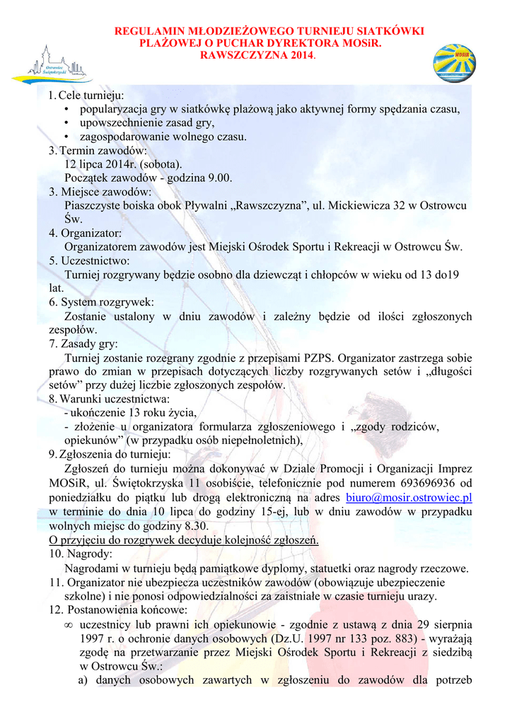 REGULAMIN MŁODZIEŻOWEGO TURNIEJU SIATKÓWKI PLAŻOWEJ O PUCHAR DYREKTORA MOSiR. RAWSZCZYZNA 2014. 1. Cele turnieju: • popularyzacja gry w siatkówkę plażową jako aktywnej formy spędzania czasu, • upowszechnienie zasad gry, • zagospodarowanie wolnego czasu. 3. Termin zawodów: 12 lipca 2014r. (sobota). Początek zawodów - godzina 9.00. 3. Miejsce zawodów: Piaszczyste boiska obok Pływalni „Rawszczyzna”, ul. Mickiewicza 32 w Ostrowcu Św. 4. Organizator: Organizatorem zawodów jest Miejski Ośrodek Sportu i Rekreacji w Ostrowcu Św. 5. Uczestnictwo: Turniej rozgrywany będzie osobno dla dziewcząt i chłopców w wieku od 13 do19 lat. 6. System rozgrywek: Zostanie ustalony w dniu zawodów i zależny będzie od ilości zgłoszonych zespołów. 7. Zasady gry: Turniej zostanie rozegrany zgodnie z przepisami PZPS. Organizator zastrzega sobie prawo do zmian w przepisach dotyczących liczby rozgrywanych setów i „długości setów” przy dużej liczbie zgłoszonych zespołów. 8. Warunki uczestnictwa: - ukończenie 13 roku życia, - złożenie u organizatora formularza zgłoszeniowego i „zgody rodziców, opiekunów” (w przypadku osób niepełnoletnich), 9. Zgłoszenia do turnieju: Zgłoszeń do turnieju można dokonywać w Dziale Promocji i Organizacji Imprez MOSiR, ul. Świętokrzyska 11 osobiście, telefonicznie pod numerem 693696936 od poniedziałku do piątku lub drogą elektroniczną na adres [email protected] w terminie do dnia 10 lipca do godziny 15-ej, lub w dniu zawodów w przypadku wolnych miejsc do godziny 8.30. O przyjęciu do rozgrywek decyduje kolejność zgłoszeń. 10. Nagrody: Nagrodami w turnieju będą pamiątkowe dyplomy, statuetki oraz nagrody rzeczowe. 11. Organizator nie ubezpiecza uczestników zawodów (obowiązuje ubezpieczenie szkolne) i nie ponosi odpowiedzialności za zaistniałe w czasie turnieju urazy. 12. Postanowienia końcowe: • uczestnicy lub prawni ich opiekunowie - zgodnie z ustawą z dnia 29 sierpnia 1997 r. o ochronie danych osobowych (Dz.U. 1997 nr 133 poz. 883) - wyrażają zgodę na przetwarzanie przez Miejski Ośrodek Sportu i Rekreacji z siedzibą w Ostrowcu Św.: a) danych osobowych zawartych w zgłoszeniu do zawodów dla potrzeb przeprowadzenia imprezy oraz dla celów informacyjnych, b) wizerunku utrwalonego na materiałach multimedialnych będących dokumentacją z imprezy do celów informacyjnych oraz promocji działalności organizatora. • uczestnicy turnieju potwierdzają własnoręcznym podpisem akceptację zasad regulaminu na formularzu zgłoszeniowym, • uczestnicy są zobowiązani do zabezpieczenia przed kradzieżą lub zgubieniem przedmiotów wartościowych będących ich własnością. 13. Organizator zastrzega sobie wyłączność interpretacji niniejszego regulaminu oraz zastrzega sobie możliwość modyfikacji zasad rozgrywek. www.mosir.ostrowie.pl