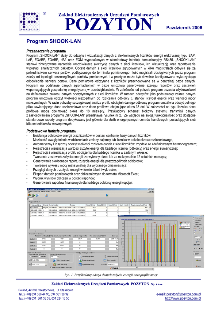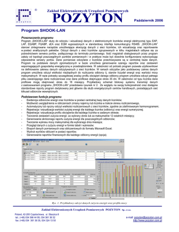 Zak ad Elektronicznych Urz dze Pomiarowych POZYTON Pa dziernik 2006 Program SHOOK-LAN Przeznaczenie programu Program „SHOOK-LAN” s5u6y do odczytu i wizualizacji danych z elektronicznych liczników energii elektrycznej typu EAP, LAP, EQABP, FQABP, sEA oraz EQM wyposa6onych w standardowy interfejs komunikacyjny RS485. „SHOOK-LAN” stanowi zintegrowane narz dzie umo6liwiaj@ce akwizycj danych z sieci liczników, ich wizualizacj oraz raportowanie w postaci analitycznych pakietów. Odczyt danych z sieci liczników zgrupowanych w kilku magistralach odbywa si za poBrednictwem serwera portów, pod5@czonego do terminala pomiarowego. IloBD magistrali obs5ugiwanych przez program zale6y od topologii poszczególnych punktów pomiarowych i w praktyce mo6e byD dowolnie konfigurowana wykorzystuj@c odpowiednie serwery portów. Dane pomiarowe odczytane z liczników przechowywane s@ w centralnej bazie danych. Program na podstawie danych zgromadzonych w bazie umo6liwia generowanie szeregu raportów oraz zestawieF wspomagaj@cych gospodark energetyczn@ w przedsi biorstwie. W zale6noBci od potrzeb program pozwala u6ytkownikowi na definiowanie zakresu danych odczytywanych z sieci liczników. W ramach odczytów jako podstawowy zakres danych program umo6liwia odczyt wielkoBci niezb dnych do rozliczania odbiorcy tj. stanów liczyde5 energii oraz wartoBci mocy maksymalnych. W razie potrzeby szczegó5owej analizy profilu obci@6eF danego odbiorcy program umo6liwia odczyt pe5nego pliku zawieraj@cego dane rozliczeniowe oraz dane profilowe obejmuj@ce okres 35 dni. W zale6noBci od typu licznika dane profilowe mog@ obejmowaD okres do 18 miesi cy. Przyk5adowy schemat blokowy systemu transmisji danych z zastosowaniem programu „SHOOK-LAN” przedstawia rysunek nr 2. Ze wzgl du na swoj@ funkcjonalnoBD oraz dost pne standardowe raporty program dedykowany jest g5ównie dla s5u6b energetycznych centrów handlowych, posiadaj@cych sieD kilkuset odbiorców wewn trznych. Podstawowe funkcje programu - Ewidencja odbiorców energii oraz liczników w postaci centralnej bazy danych liczników; Mo6liwoBD uwzgl dnienia w obliczeniach zmiany najemcy lub licznika w trakcie okresu rozliczeniowego, Automatyczny lub r czny odczyt wielkoBci rozliczeniowych z sieci liczników, zgodnie ze zdefiniowanym harmonogramem; Rejestracja i wizualizacja wartoBci zu6ytej energii dla ka6dego licznika (odbiorcy) oraz energii sumarycznej; Rejestracja i wizualizacja profilu obci@6enia dla ka6dego licznika w zadanym okresie; Tworzenie zestawieF zu6ycia energii: za wybrany okres lub za maksymalnie 12 ostatnich miesi cy; Generowanie skróconego raportu zu6ycia energii dla poszczególnych odbiorców; Tworzenie wykresu mocy maksymalnej dla wybranego dnia miesi@ca; Przegl@d danych o zu6yciu energii w formie tabeli i wykresów; Eksport danych pomiarowych oraz obliczeniowych do formatu Microsoft Excel; Wydruk wyników obliczeF w postaci raportów; Generowanie raportów finansowych dla ka6dego odbiorcy energii (opcja); Rys. 1. Przyk adowy odczyt danych zu ycia energii oraz profilu mocy Zak ad Elektronicznych Urz dze Pomiarowych POZYTON Sp. z o.o. Poland, 42-200 Cz stochowa, ul. Staszica 8 tel.: (+48) 034 366 44 95, 034 361 38 32 fax: (+48) 034 361 38 35, 034 324 13 50 e-mail: [email protected] http://www.pozyton.com.pl Wewn trzny uk ad pomiarowy energii elektrycznej L1 L2 1 00 00 100 00 im p /k W h imp /k W h 1 00 00 100 00 im p /k V arh Lic z n ki cz te rok wa d ra ntow y k il ow a to god zi n i k il ow a ro god z in p r' du tró jfa z o w eg o z na d ajn iki em im p u ls ó w imp /k Varh Li cz nik cz te rok w ad ra n tow y k li o wa to go dz in i k il o wa ro g odz in p r' du tr ój fa z ow e go z nad ajn ik ie m im pu ls ów 15 06 L31 100 00 Ilo./ liczników max 31 szt. imp /k W h 100 00 imp /k Varh L icz nik c z te rok w ad ra n tow y k il o wa to go dz in i k il o wa ro g odz in p r' du tr ój fa z ow e go z nad ajn ik ie m im pu ls ów 06 06 Terminal pomiarowy odbiorcy energii elektrycznej 15 15 06 06 06 Program SHOOK-LAN SERWER PORTÓW RS 485 Wewn trzny uk ad pomiarowy energii elektrycznej L2 L31 100 00 100 00 1 00 00 Ilo./ liczników max 31 szt. imp /k W h im p /k W h 1 00 00 100 00 im p /k V arh Lic z n ki cz te rok wa d ra ntow y k il ow a to god zi n i imp /k Varh Li cz nik cz te rok w ad ra n tow y k li o wa to go dz in i k il o wa ro g odz in p r' du tr ój fa z ow e go z nad ajn ik ie m im pu ls ów k il ow a ro god z in p r' du tró jfa z o w eg o z na d ajn iki em im p u ls ó w 15 06 imp /k W h 06 Rozliczeniowy uk ad pomiarowy energii elektrycznej L2 100 00 1 00 00 im p /k W h imp /k W h im p/k W h imp /k Varh Li cz nik cz te rok w ad ra n tow y k il o wa to go dz in i k il o wa ro g odz in p r' du tr ój fa z ow e go z nad ajn ik ie m im pu ls ów 06 06 100 00 imp /k W h 1 00 00 100 00 imp /k Varh L icz nik c z te rok w ad ra n tow y k il ow at ogod zin i k il ow ar og od z in k li o wa to go dz in i k il o wa ro g odz in pr 'du tró jfa z o we g o z na da jn ikie m im p uls ó w p r' du tr ój fa z ow e go z nad ajn ik ie m im pu ls ów 15 15 15 L4 im p/k V arh L ic z n ik cz ter ok wa dr an tow y 100 00 1 00 00 im p /k V arh Lic z n ki cz te rok wa d ra ntow y k il ow a to god zi n i k il ow a ro god z in p r' du tró jfa z o w eg o z na d ajn iki em im p u ls ó w 06 L3 1 00 00 06 06 15 06 06 Lokalna sie komputerowa (Intranet) 06 06 06 RS 485 L1 Sie Internet (www, e-mail) 15 15 06 LAN 100 00 imp /k Varh L icz nik c z te rok w ad ra n tow y k li o wa to go dz in i k il o wa ro g odz in p r' du tr ój fa z ow e go z nad ajn ik ie m im pu ls ów 06 RS485 lub CLO MODEM PSTN lub GSM Transmisja danych do odbiorcy energii L1 - Automatyczne wysy anie danych pomiarowych z liczników w postaci za 'cznika do poczty elektronicznej - Odczyt danych za pomoc' przegl'darki stron WWW Sie telefoniczna PSTN lub GSM RS 232 RS 232 ETH Stanowisko komputerowe w spó ce dystrybucyjnej ETHERNET RS 232 Transmisja danych do spó ki dystrybucyjnej Rys. nr 2. Przyk adowy