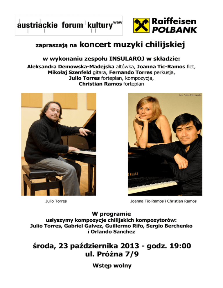 zapraszają na koncert muzyki chilijskiej w wykonaniu zespołu INSULAROJ w składzie: Aleksandra Demowska-Madejska altówka, Joanna Tic-Ramos flet, Mikołaj Szenfeld gitara, Fernando Torres perkusja, Julio Torres fortepian, kompozycja, Christian Ramos fortepian Julio Torres Joanna Tic-Ramos i Christian Ramos W programie usłyszymy kompozycje chilijskich kompozytorów: Julio Torres, Gabriel Galvez, Guillermo Rifo, Sergio Berchenko i Orlando Sanchez środa, 23 października 2013 - godz. 19:00 ul. Próżna 7/9 Wstęp wolny