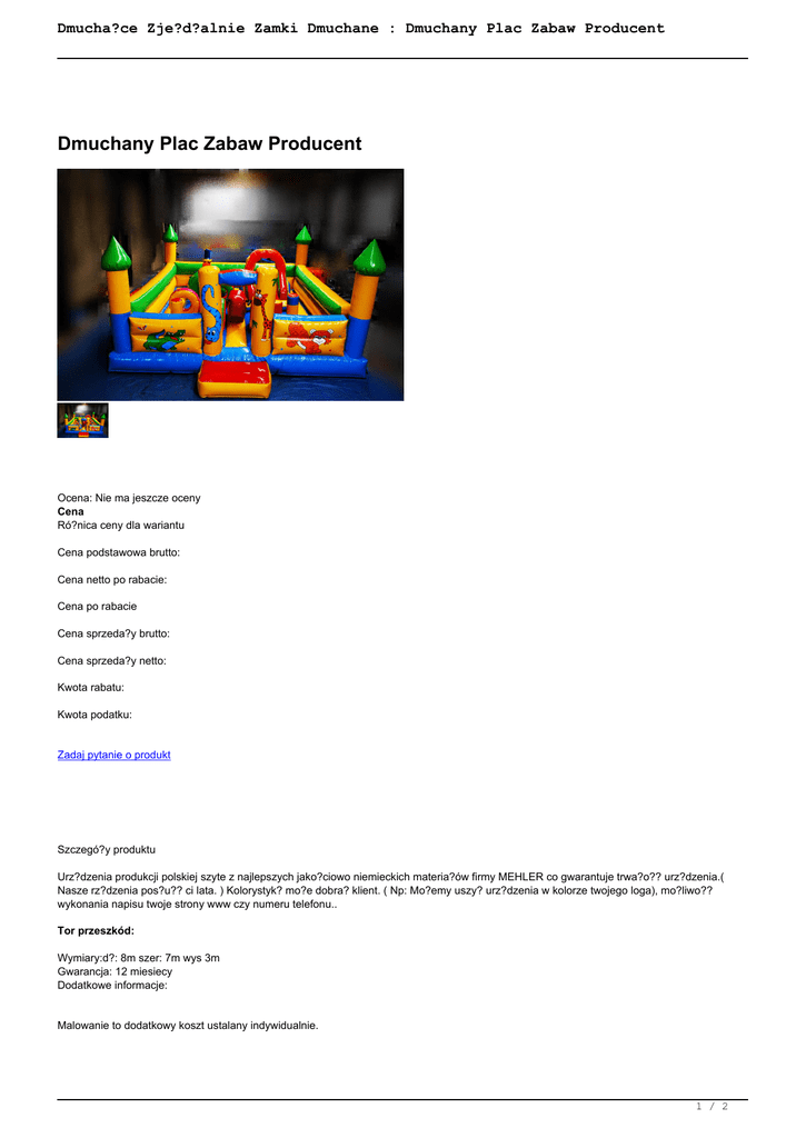 Dmucha?ce Zje?d?alnie Zamki Dmuchane : Dmuchany Plac Zabaw Producent Dmuchany Plac Zabaw Producent Ocena: Nie ma jeszcze oceny Cena Ró?nica ceny dla wariantu Cena podstawowa brutto: Cena netto po rabacie: Cena po rabacie Cena sprzeda?y brutto: Cena sprzeda?y netto: Kwota rabatu: Kwota podatku: Zadaj pytanie o produkt Szczegó?y produktu Urz?dzenia produkcji polskiej szyte z najlepszych jako?ciowo niemieckich materia?ów firmy MEHLER co gwarantuje trwa?o?? urz?dzenia.( Nasze rz?dzenia pos?u?? ci lata. ) Kolorystyk? mo?e dobra? klient. ( Np: Mo?emy uszy? urz?dzenia w kolorze twojego loga), mo?liwo?? wykonania napisu twoje strony www czy numeru telefonu.. Tor przeszkód: Wymiary:d?: 8m szer: 7m wys 3m Gwarancja: 12 miesiecy Dodatkowe informacje: Malowanie to dodatkowy koszt ustalany indywidualnie. 1 / 2 Dmucha?ce Zje?d?alnie Zamki Dmuchane : Dmuchany Plac Zabaw Producent 2 / 2 Powered by TCPDF (www.tcpdf.org)