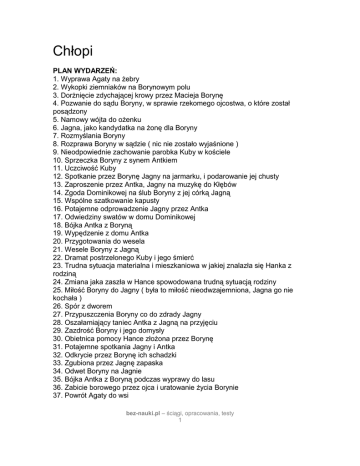 Chłopi PLAN WYDARZEŃ: 1. Wyprawa Agaty na żebry 2. Wykopki ziemniaków na Borynowym polu 3. Dorżnięcie zdychającej krowy przez Macieja Borynę 4. Pozwanie do sądu Boryny, w sprawie rzekomego ojcostwa, o które został posądzony 5. Namowy wójta do ożenku 6. Jagna, jako kandydatka na żonę dla Boryny 7. Rozmyślania Boryny 8. Rozprawa Boryny w sądzie ( nic nie zostało wyjaśnione ) 9. Nieodpowiednie zachowanie parobka Kuby w kościele 10. Sprzeczka Boryny z synem Antkiem 11. Uczciwość Kuby 12. Spotkanie przez Borynę Jagny na jarmarku, i podarowanie jej chusty 13. Zaproszenie przez Antka, Jagny na muzykę do Kłębów 14. Zgoda Dominikowej na ślub Boryny z jej córką Jagną 15. Wspólne szatkowanie kapusty 16. Potajemne odprowadzenie Jagny przez Antka 17. Odwiedziny swatów w domu Dominikowej 18. Bójka Antka z Boryną 19. Wypędzenie z domu Antka 20. Przygotowania do wesela 21. Wesele Boryny z Jagną 22. Dramat postrzelonego Kuby i jego śmierć 23. Trudna sytuacja materialna i mieszkaniowa w jakiej znalazła się Hanka z rodziną 24. Zmiana jaka zaszła w Hance spowodowana trudną sytuacją rodziny 25. Miłość Boryny do Jagny ( była to miłość nieodwzajemniona, Jagna go nie kochała ) 26. Spór z dworem 27. Przypuszczenia Boryny co do zdrady Jagny 28. Oszałamiający taniec Antka z Jagną na przyjęciu 29. Zazdrość Boryny i jego domysły 30. Obietnica pomocy Hance złożona przez Borynę 31. Potajemne spotkania Jagny i Antka 32. Odkrycie przez Borynę ich schadzki 33. Zgubiona przez Jagnę zapaska 34. Odwet Boryny na Jagnie 35. Bójka Antka z Boryną podczas wyprawy do lasu 36. Zabicie borowego przez ojca i uratowanie życia Borynie 37. Powrót Agaty do wsi bez-nauki.pl – ściągi, opracowania, testy 1 38. Zajęcie się chorym Boryną przez Hankę 39. Konflikt Jagny z Hanką 40. Pierwsze spotkanie Jagny z synem organistów - Jasiem 41. Romans Jagny z wójtem 42. Powrót chłopów z więzienia 43. Starania Hanki o uwolnienie z więzienie męża 44. Symboliczna śmierć Macieja Boryny 45. Pogrzeb Boryny i urządzona stypa 46. Propozycja dziedzica złożona chłopom 47. Zgoda chłopów na warunki dziedzica 48. Zauroczenie Jagny Jasiem 49. Kłótnia Jagny z Hanką przy podziale majątku 50. Wypędzenie z domu Jagny przez Hankę 51. Powrót Antka z więzienia 52. Rachunek sumienia uczyniony przez Antka 53. Ostatnie intymne spotkanie Jagny i Antka 54. Sfałszowanie głosowania i decyzja o powołaniu szkoły w Lipcach 55. Spotkanie Jagny z Jasiem. Zauroczenie chłopakiem 56. Śmierć Agaty wsród najbliższych 57. Plotki o romansie księżyka z Jagną 58. Przyłapanie przez organiścinę Jagny i Jasia na kolejnym spotkaniu 59. Rozdarcie Jasia i pójście w pielgrzymkę 60. Aresztowanie wójta i związane z tym problemy chłopów 61. Oskarżenie Jagny o sytuację w jakiej znaleźli się chłopi 62. Sąd nad Jagną i wywiezienie jej na kupie gnoju ze wsi bez-nauki.pl – ściągi, opracowania, testy 2