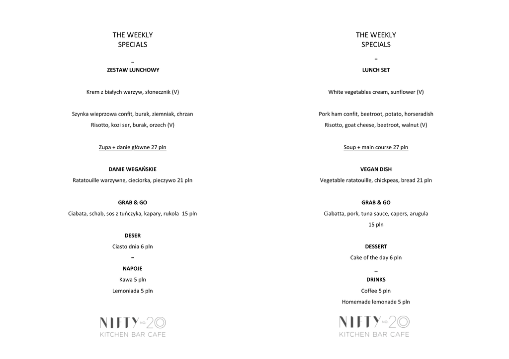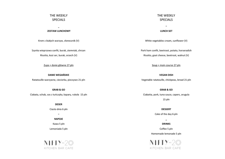 THE WEEKLY SPECIALS THE WEEKLY SPECIALS − − ZESTAW LUNCHOWY LUNCH SET Krem z białych warzyw, słonecznik (V) White vegetables cream, sunflower (V) Szynka wieprzowa confit, burak, ziemniak, chrzan Pork ham confit, beetroot, potato, horseradish Risotto, kozi ser, burak, orzech (V) Risotto, goat cheese, beetroot, walnut (V) Zupa + danie główne 27 pln Soup + main course 27 pln DANIE WEGAŃSKIE VEGAN DISH Ratatouille warzywne, cieciorka, pieczywo 21 pln Vegetable ratatouille, chickpeas, bread 21 pln GRAB & GO GRAB & GO Ciabata, schab, sos z tuńczyka, kapary, rukola 15 pln Ciabatta, pork, tuna sauce, capers, arugula 15 pln DESER Ciasto dnia 6 pln DESSERT − Cake of the day 6 pln NAPOJE _ Kawa 5 pln DRINKS Lemoniada 5 pln Coffee 5 pln Homemade lemonade 5 pln