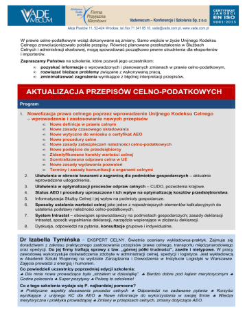 Aleja Piastów 11, 52-424 Wrocław, tel./fax 71 341 85 10, [email protected], www.vade.com.pl W prawie celno-podatkowym wciąż dokonywane są zmiany. Samo wejście w życie Unijnego Kodeksu Celnego zrewolucjonizowało polskie przepisy. Również planowane przekształcenia w Służbach Celnych i administracji skarbowej, mogą spowodować początkowo pewne utrudnienia dla eksporterów i importerów. Zapraszamy Państwa na szkolenie, które pozwoli jego uczestnikom: • • • pozyskać informacje o wprowadzonych i planowanych zmianach w prawie celno-podatkowym, rozwiązać bieżące problemy związane z wykonywaną pracą, zminimalizować zagrożenia wynikające z błędnej interpretacji przepisów. AKTUALIZACJA PRZEPISÓW CELNO-PODATKOWYCH Program 1. Nowelizacja prawa celnego poprzez wprowadzenie Unijnego Kodeksu Celnego – wprowadzenie i zastosowanie nowych przepisów 2. 3. 4. 5. 6. 7. 8. • Nowe definicje w prawie celnym • Nowe zasady czasowego składowania • Nowe wytyczne do wniosku o certyfikat AEO • Nowe procedury celne • Nowe zasady zabezpieczeń należności celno-podatkowych • Nowe podejście do przedsiębiorcy • Zidentyfikowane korekty wartości celnej • Scentralizowana odprawa celna w UE • Nowe zasady wydawania pozwoleń • Terminy i zasady komunikacji z organami celnymi Ułatwienia w obrocie towarami z zagranicą dla podmiotów gospodarczych – aktualnie wprowadzone udogodnienia. Ułatwienia w optymalizacji procesów odpraw celnych – CUDO, pozwolenia krajowe. Status AEO i procedury uproszczone i ich wpływ na optymalizację kosztów przedsiębiorstwa. Informatyzacja Służby Celnej i jej wpływ na podmioty gospodarcze. Sposoby ustalania wartości celnej jako jeden z najważniejszych elementów kalkulacyjnych do ustalenia podstawy należności celno-podatkowych. System Intrastat − obowiązek sprawozdawczy na podmiotach gospodarczych; zasady deklaracji Intrastat, sposób wypełniania deklaracji, narzędzia wspierające w złożeniu deklaracji. Dyskusja, odpowiedzi na pytania, konsultacje grupowe i indywidualne. Dr Izabella Tymińska − EKSPERT CELNY. Świetnie oceniany wykładowca-praktyk. Zajmuje się doradztwem z zakresu praktycznego zastosowania przepisów prawa celnego, transportu międzynarodowego oraz spedycji. Do jej firmy trafiają sprawy z tzw. „górnej półki trudności”, zawiłe i nietypowe. W pracy zawodowej wykorzystuje doświadczenia zdobyte w administracji celnej, spedycji i logistyce. Jest wykładowcą w Akademii Sztuki Wojennej na wydziale Zarządzania i Dowodzenia w Instytucie Logistyki w Warszawie. Zajęcia prowadzi z energią i humorem. Co powiedzieli uczestnicy poprzedniej edycji szkolenia: ♣ Dla mnie nowa prowadząca była „strzałem w dziesiątkę”. ♣ Bardzo dobre pod kątem merytorycznym ♣ Godne polecenia ♣ Super pozytywy ♣ Polecę to szkolenie! Co z tego szkolenia wydaje się P. najbardziej pomocne? ♣ Praktyczne aspekty stosowania procedur celnych ♣ Odpowiedzi na zadawane pytania ♣ Korzyści wynikające z unijnego KC dla AEO ♣ Nowe informacje do wykorzystania w swojej firmie ♣ Wiedza merytoryczna i praktyka prowadzącej ♣ Zmiany w przepisach celnych, zmiany dotyczące AEO. Temat Miejsce POZNAŃ, Biurowiec, ul. Taczaka 24 (róg Ratajczaka), II p. lok. 206; pieszo 15 min od Dworca PKP. Termin 03 kwietnia 2017 r. Zajęcia w godzinach 09:00 – 16:00. Finanse Koszt uczestnictwa jednej osoby: 593 zł netto. Do powyższej ceny należy doliczyć 23 % VAT. W cenie uwzględniono koszty: • 8 godzin intensywnych zajęć, • materiałów szkoleniowych i pomocniczych, • serwisu kawowego oraz lunchu, • imiennego zaświadczenia o ukończeniu szkolenia. Płatność Zgłoszenia Spółka Vademecum posiada certyfikaty: AKTUALIZACJA PRZEPISÓW CELNO-PODATKOWYCH. SZJ ISO 9001:2015 Bank Ochrony Środowiska S.A. O/Wrocław 89 1540 1030 2001 7753 1706 0002 z podaniem numeru 2017/04/034. Zgłoszenia przyjmujemy e’mailem, faksem, telefonicznie lub pocztą pod adresem: Vademecum – Konferencje i Szkolenia Sp. z o.o., Aleja Piastów 11, 52-424 Wrocław tel./fax: (071) 341 85 10, e-mail: [email protected] Pisemne potwierdzenie realizacji szkolenia prześlemy faksem lub e'mailem do Działu Szkoleń 7 dni przed datą rozpoczęcia zajęć. Znak jakości MSUES nr 86/2014 Vademecum Sp. z o.o., Al Piastów 11, 52-424 Wrocław, tel./fax (071) 341 85 10, e-mail: [email protected] ZGŁOSZENIE na szkolenie nr 2017/04/034 – POZNAŃ, 03 kwietnia 2017 r. AKTUALIZACJA PRZEPISÓW CELNO-PODATKOWYCH ZGŁASZAJĄCY Pełna nazwa firmy .................................................................................................................................................................. ................................................................................................................................................................................................. Dokładny adres tel.: (0- .................................................................................................................................................................. ) .............................. fax: ........................... e-mail: ............................................ NIP:.......................................... Imię i nazwisko osoby zgłaszanej na szkolenie – stanowisko 1. ......................................................................................– .................................................................................................... 2. ......................................................................................– .................................................................................................... Imię i nazwisko osoby dokonującej zgłoszenia – stanowisko .........................................................................................– .................................................................................................... Data zg