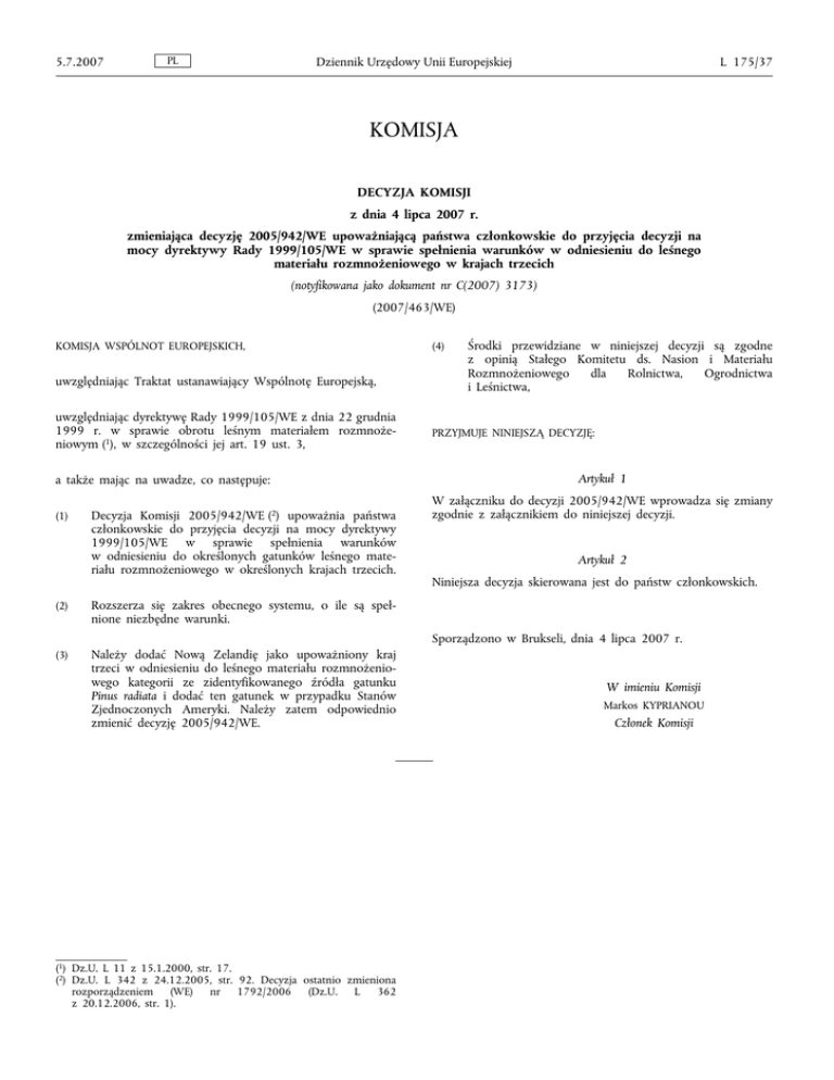 5.7.2007 PL Dziennik Urzędowy Unii Europejskiej L 175/37 KOMISJA DECYZJA KOMISJI z dnia 4 lipca 2007 r. zmieniająca decyzję 2005/942/WE upoważniającą państwa członkowskie do przyjęcia decyzji na mocy dyrektywy Rady 1999/105/WE w sprawie spełnienia warunków w odniesieniu do leśnego materiału rozmnożeniowego w krajach trzecich (notyfikowana jako dokument nr C(2007) 3173) (2007/463/WE) KOMISJA WSPÓLNOT EUROPEJSKICH, uwzględniając Traktat ustanawiający Wspólnotę Europejską, uwzględniając dyrektywę Rady 1999/105/WE z dnia 22 grudnia 1999 r. w sprawie obrotu leśnym materiałem rozmnożeniowym (1), w szczególności jej art. 19 ust. 3, a także mając na uwadze, co następuje: (1) Decyzja Komisji 2005/942/WE (2) upoważnia państwa członkowskie do przyjęcia decyzji na mocy dyrektywy 1999/105/WE w sprawie spełnienia warunków w odniesieniu do określonych gatunków leśnego materiału rozmnożeniowego w określonych krajach trzecich. (2) Rozszerza się zakres obecnego systemu, o ile są spełnione niezbędne warunki. (3) Należy dodać Nową Zelandię jako upoważniony kraj trzeci w odniesieniu do leśnego materiału rozmnożeniowego kategorii ze zidentyfikowanego źródła gatunku Pinus radiata i dodać ten gatunek w przypadku Stanów Zjednoczonych Ameryki. Należy zatem odpowiednio zmienić decyzję 2005/942/WE. (4) Środki przewidziane w niniejszej decyzji są zgodne z opinią Stałego Komitetu ds. Nasion i Materiału Rozmnożeniowego dla Rolnictwa, Ogrodnictwa i Leśnictwa, PRZYJMUJE NINIEJSZĄ DECYZJĘ: Artykuł 1 W załączniku do decyzji 2005/942/WE wprowadza się zmiany zgodnie z załącznikiem do niniejszej decyzji. Artykuł 2 Niniejsza decyzja skierowana jest do państw członkowskich. Sporządzono w Brukseli, dnia 4 lipca 2007 r. (1) Dz.U. L 11 z 15.1.2000, str. 17. (2) Dz.U. L 342 z 24.12.2005, str. 92. Decyzja ostatnio zmieniona rozporządzeniem (WE) nr 1792/2006 (Dz.U. L 362 z 20.12.2006, str. 1). W imieniu Komisji Markos KYPRIANOU Członek Komisji L 175/38 PL Dziennik Urzędowy Unii Europejskiej 5.7.2007 ZAŁĄCZNIK W załączniku do decyzji 2005/942/WE wprowadza się następujące zmiany: 1) W tabeli pomiędzy wpisami dotyczącymi Chorwacji i Norwegii wprowadza się co następuje: „Kraj pochodzenia Nowa Zelandia Gatunek Pinus radiata D. Don Kategoria SI Rodzaj materiału podstawowego SS, St” 2) Wpis w tabeli dotyczącej Stanów Zjednoczonych Ameryki otrzymuje brzmienie: „Kraj pochodzenia Stany Zjednoczone Ameryki (Waszyngton, Oregon, Kalifornia) Gatunek Kategoria Rodzaj materiału podstawowego Abies grandis Lindl. SI, Q, T SS, St, SO, PF Picea sitchensis Carr. SI SS, St Pinus contorta Loud. SI SS, St Pinus radiata D. Don SI SS, St Pseudotsuga menziesii Franco SI, Q, T SS, St, SO, PF”