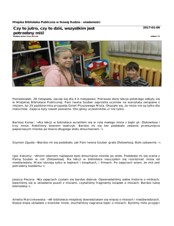 Miejska Biblioteka Publiczna w Nowej Rudzie - wiadomości Czy to jutro, czy to dziś, wszystkim jest potrzebny miś! Dodane przez: Anna Buczek 2017-01-09 odsłon: 24 Poniedziałek, 28 listopada, zaczął się dla 4 b nietypowo. Pierwsze dwie lekcje polskiego odbyły się w Miejskiej Bibliotece Publicznej. Pani Iwona Szuber zaprosiła uczniów na warsztaty związane z misiem, bo 25 października przypada Dzień Pluszowego Misia. Okazało się, że misie nie są tylko dla maluchów. Zajęcia były nawet poważne. Oto głosy uczestników…i nie tylko. Bartosz Konar: „ Na lekcji w bibliotece wcieliłem się w rolę małego misia z bajki pt. Złotowłosa i trzy misie. Robiliśmy bowiem teatrzyk. Bardzo mi się też podobało zadanie przesunięcia papierowych misiów po blacie długiego stołu dmuchaniem.” Szymon Zguda:” Bardzo mi się podobało, jak Pani Iwona Szuber grała Złotowłosą. Było zabawnie.” Igor Kałużny: „ Moim zdaniem najlepsze było dmuchanie misiów po stole. Podobała mi się scena z Panią Szuber w roli Złotowłosej. Na lekcji w bibliotece nauczyłem się rozróżniać misia od niedźwiedzia. Misie istnieją tylko w bajkach i książkach, i filmach. Po zajęciach wiem, że miś jest potrzebny każdemu”. Jessica Pecora: „Na zajęciach czułam się bardzo dobrze. Opowiadaliśmy sobie historie o miśkach, bawiliśmy się w układanie puzzli z misiami, czytaliśmy fragmenty książek o misiach. Bardzo lubię bibliotekę”. Amelia Marcinkowska: „ W bibliotece miejskiej dowiedziałam się więcej o misiach i niedźwiedziach. Nasza klasa układała z klocków misie, słuchaliśmy nagrania bajki o misiach. Byliśmy miło przyjęci przez Panią Małgorzatę Ciechanowską- dostaliśmy nawet słodycze, bo w bajkach misie je lubią”. Julianna Wienke: „ Mój ulubiony miś to Kubuś Puchatek. Na lekcjach w bibliotece dużo dowiedziałam się o misiach. Najbardziej podobało mi się, jak odgrywaliśmy scenkę. Byłam w niej ja, pani od polskiego i kilkoro uczniów. Wyszła miło i śmiesznie.” Wiktor Kałużny:” W bibliotece mieliśmy lekcje i rozmawialiśmy o naszych ulubionych misiach, które występują w filmach i książkach. Mnie najbardziej podobało się, jak układaliśmy puzzle z obrazkami misiów. Moja grupa zajęła pierwsze miejsce!” Kamila Rogańska: „ Mnie się nudziło na początku, pani zauważyła, że liczę lampy na suficie… Ale później się zaciekawiłam. Układałam z puzzli miśka i przeglądałam książki o misiach. Były też zagadki.” Roksana Podgórna:” Myślałam, że misie istnieją! Lecz są to postacie fantastyczne. Prawdziwe są niedźwiedzie. Moja ulubioną historią jest Złotowłosa i trzy misie. Było na lekcji przedstawienie, grała tam Pani od polskiego i kilku uczniów z mojej klasy. Odbyły się także wyścigi miśków papierowych.” Ewelina Skierska:” Podobało mi się w bibliotece. Temat był o misiach. Było ciekawie. Nauczyłam się, że miś to postać fantastyczna. Misie a niedźwiedzie to różnica. Czytaliśmy książki, rozmawialiśmy o misiach z bajek- Kolargolu, Uszatku… Było też przedstawienie i występowała tam nasza pani od polskiego. W bibliotece było niesamowicie.” Oskar Sawicki:” Poszedłem z klasą do biblioteki, ponieważ był Dzień Pluszowego Misia. Było układanie puzzli, słuchanie audiobooka, kilka pytań na temat misia, dmuchanie papierowych postaci i teatrzyk. Szczerze polecam!” Wiktoria Wycisk: „Nie było mnie na zajęciach w bibliotece. Ale wyobrażam sobie, że było bajecznie, ponieważ uwielbiam misie, są milutkie i puchate.” Powered by TCPDF (www.tcpdf.org)