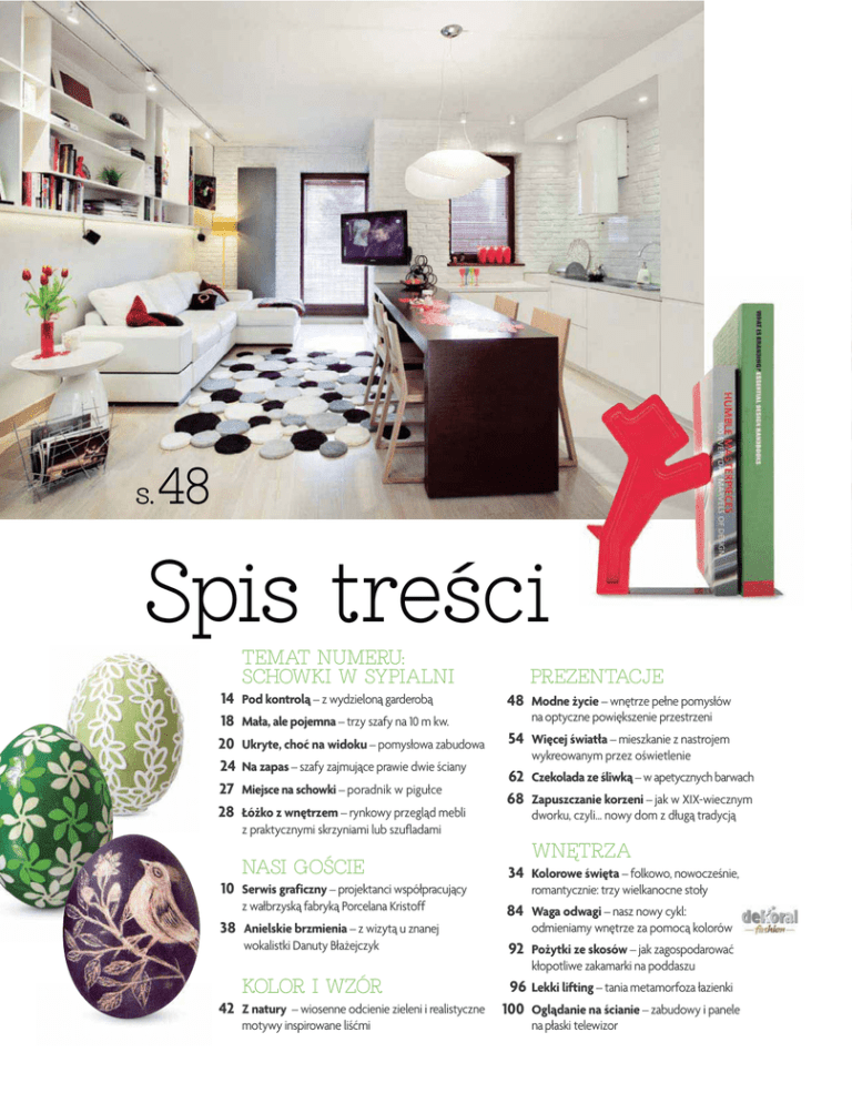 s. 48 Spis treści TEMAT NUMERU: SCHOWKI W SYPIALNI 14 18 20 24 27 28 Pod kontrolą – z wydzieloną garderobą Mała, ale pojemna – trzy szafy na 10 m kw. Ukryte, choć na widoku – pomysłowa zabudowa Na zapas – szafy zajmujące prawie dwie ściany Miejsce na schowki – poradnik w pigułce Łóżko z wnętrzem – rynkowy przegląd mebli z praktycznymi skrzyniami lub szufladami NASI GOŚCIE 10 Serwis graficzny – projektanci współpracujący z wałbrzyską fabryką Porcelana Kristoff 38 Anielskie brzmienia – z wizytą u znanej wokalistki Danuty Błażejczyk PREZENTACJE 48 Modne życie – wnętrze pełne pomysłów na optyczne powiększenie przestrzeni 54 Więcej światła – mieszkanie z nastrojem wykreowanym przez oświetlenie 62 Czekolada ze śliwką – w apetycznych barwach 68 Zapuszczanie korzeni – jak w XIX-wiecznym dworku, czyli... nowy dom z długą tradycją WNĘTRZA 34 Kolorowe święta – folkowo, nowocześnie, romantycznie: trzy wielkanocne stoły 84 Waga odwagi – nasz nowy cykl: odmieniamy wnętrze za pomocą kolorów 92 Pożytki ze skosów – jak zagospodarować kłopotliwe zakamarki na poddaszu KOLOR I WZÓR 42 Z natury – wiosenne odcienie zieleni i realistyczne motywy inspirowane liśćmi 96 Lekki lifting – tania metamorfoza łazienki 100 Oglądanie na ścianie – zabudowy i panele na płaski telewizor s. s. 96 24 s. RYNEK 8 Sezon na rower – domowe drobiazgi nie tylko dla cyklistów 88 Dodatki tworzą styl – przedmioty, które pomogą podkreślić klimat kuchni: prowansalski, nowoczesny lub vintage 104 Tradycja w odkurzaniu – przegląd odkurzaczy workowych 108 W dwóch cenach – korzystne zakupy 110 Rozmaitości – dla domu i rodziny ZRÓB TO SAM 98 Pisanki – ozdabiamy jajka tradycyjnymi i nowoczesnymi technikami INNE 76 Architekt radzi – projekty mieszkań naszych czytelników 112 W maju – wybrane tematy następnego numeru 112 Prenumerata – „Cztery Kąty” taniej i prosto do domu 113 Adresy – sklepy i producenci 42