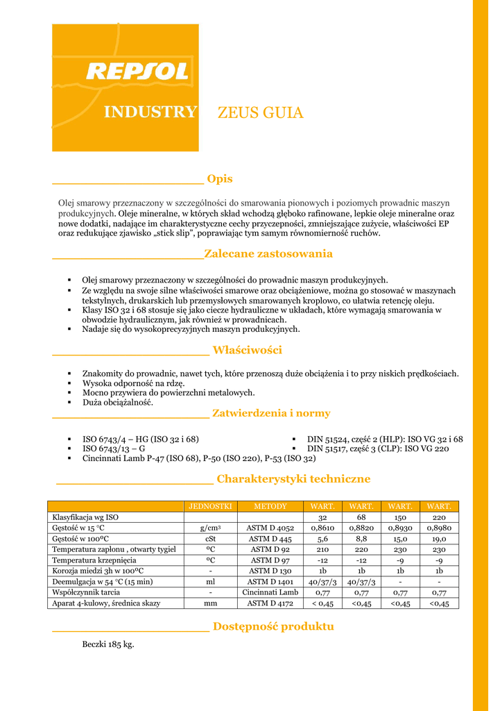 ZEUS GUIA ___________________________ Opis Olej smarowy przeznaczony w szczególności do smarowania pionowych i poziomych prowadnic maszyn produkcyjnych. Oleje mineralne, w których skład wchodzą głęboko rafinowane, lepkie oleje mineralne oraz nowe dodatki, nadające im charakterystyczne cechy przyczepności, zmniejszające zużycie, właściwości EP oraz redukujące zjawisko „stick slip”, poprawiając tym samym równomierność ruchów. ___________________________Zalecane zastosowania Olej smarowy przeznaczony w szczególności do prowadnic maszyn produkcyjnych. Ze względu na swoje silne właściwości smarowe oraz obciążeniowe, można go stosować w maszynach tekstylnych, drukarskich lub przemysłowych smarowanych kroplowo, co ułatwia retencję oleju. Klasy ISO 32 i 68 stosuje się jako ciecze hydrauliczne w układach, które wymagają smarowania w obwodzie hydraulicznym, jak również w prowadnicach. Nadaje się do wysokoprecyzyjnych maszyn produkcyjnych. ____________________________ Właściwości Znakomity do prowadnic, nawet tych, które przenoszą duże obciążenia i to przy niskich prędkościach. Wysoka odporność na rdzę. Mocno przywiera do powierzchni metalowych. Duża obciążalność. ____________________________ Zatwierdzenia i normy ISO 6743/4 – HG (ISO 32 i 68) DIN 51524, część 2 (HLP): ISO VG 32 i 68 ISO 6743/13 – G DIN 51517, część 3 (CLP): ISO VG 220 Cincinnati Lamb P-47 (ISO 68), P-50 (ISO 220), P-53 (ISO 32) ____________________________ Charakterystyki techniczne Klasyfikacja wg ISO Gęstość w 15 °C Gęstość w 100ºC Temperatura zapłonu , otwarty tygiel Temperatura krzepnięcia Korozja miedzi 3h w 100ºC Deemulgacja w 54 °C (15 min) Współczynnik tarcia Aparat 4-kulowy, średnica skazy JEDNOSTKI METODY g/cm3 cSt ºC ºC ml mm ASTM D 4052 ASTM D 445 ASTM D 92 ASTM D 97 ASTM D 130 ASTM D 1401 Cincinnati Lamb ASTM D 4172 WART. 32 0,8610 5,6 210 -12 1b 40/37/3 0,77 < 0,45 ____________________________ Dostępność produktu Beczki 185 kg. WART. 68 0,8820 8,8 220 -12 1b 40/37/3 0,77 <0,45 WART. 150 0,8930 15,0 230 -9 1b 0,77 <0,45 WART. 220 0,8980 19,0 230 -9 1b 0,77 <0,45