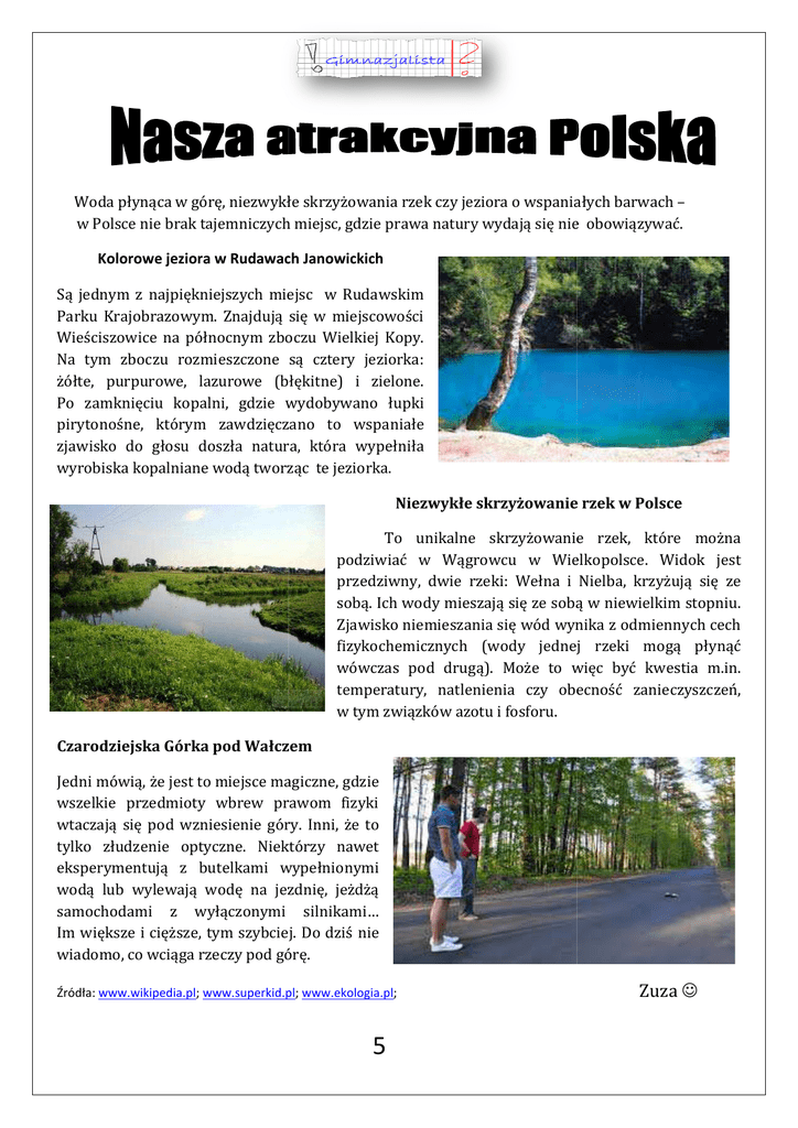 Woda płynąca w górę, niezwykłe skrzyżowania rzek czy jeziora o wspaniałych barwach – w Polsce nie brak tajemniczych miejsc, gdzie gdzie prawa natury wydają się nie obowiązywać. Kolorowe jeziora w Rudawach Janowickich Są jednym z najpiękniejszych miejsc w Rudawskim Parku Krajobrazowym. Znajdują się w miejscowości Wieściszowice na północnym zboczu Wielkiej Kopy. Na tym zboczu rozmieszczone są cztery jeziorka: żółte, purpurowe, lazurowe (błękitne) i zielone. Po zamknięciu kopalni, gdzie wydobywano łupki pirytonośne, którym zawdzięczano to wspaniałe zjawisko do głosu doszła natura, która wypełniła wyrobiska kopalniane wodą tworząc te jeziorka. Niezwykłe skrzyżowanie rzek w Polsce To unikalne skrzyżowanie rzek, które można podziwiać w Wągrowcu w Wielkopolsce. Widok jest przedziwny, dwie rzeki: Wełna i Nielba, krzyżują się ze sobą. Ich wody mieszają się ze sobą w niewielkim stopniu. stopniu Zjawisko niemieszania się wód wynika z odmiennych od cech fizykochemicznych (wody jednej rzeki mogą płynąć wówczas pod drugą).. Może to więc być kwestia m.in. temperatury, natlenienia czy obecność zanieczyszczeń, zanieczyszczeń w tym związków azotu i fosforu. Czarodziejska Górka pod Wałczem Jedni mówią, że jest to miejsce magiczne, gdzie wszelkie przedmioty wbrew prawom fizyki wtaczają się pod wzniesienie góry. Inni, że to tylko złudzenie optyczne. Niektórzy nawet eksperymentują z butelkami wypełnionymi wodą lub wylewają wodę na jezdnię, jeżdżą samochodami z wyłączonymi nymi silnikami… Im większee i cięższe, tym szybciej. Do D dziś nie wiadomo, co wciąga rzeczy pod górę. Źródła: www.wikipedia.pl; www.superkid.pl; www.superkid.pl www.ekologia.pl; 5 Zuza ☺