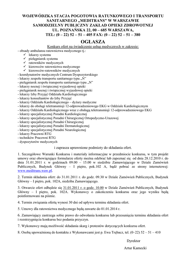 WOJEWÓDZKA STACJA POGOTOWIA RATUNKOWEGO I TRANSPORTU SANITARNEGO „MEDITRANS” W WARSZAWIE SAMODZIELNY PUBLICZNY ZAKŁAD OPIEKI ZDROWOTNEJ UL. POZNAŃSKA 22, 00 – 685 WARSZAWA, TEL: (0 – 22) 52 – 51 – 405 FAX: (0 – 22) 52 – 51 – 380 OGŁASZA Konkurs ofert na świadczenie usług medycznych w zakresie: - obsady ambulansu ratownictwa medycznego tj.: lekarzy systemu pielęgniarek systemu ratowników medycznych kierowców ratownictwa medycznego kierowców-ratowników medycznych - koordynatorów medycznych Centrum Dyspozytorskiego - lekarzy zespołu transportu sanitarnego typu „N” - pielęgniarek zespołu transportu sanitarnego typu „N” - lekarzy nocnej i świątecznej wyjazdowej opieki - pielęgniarek nocnej i świątecznej wyjazdowej opieki - lekarzy Izby Przyjęć Oddziału Kardiologicznego - lekarzy konsultantów do Izby Przyjęć - lekarzy Oddziału Kardiologicznego – dyŜury medyczne - lekarzy do obsługi teletransmisji 12-odprowadzeniowego EKG w Oddziale Kardiologicznym - lekarzy Oddziału Kardiologicznego wraz z obsługą teletransmisji 12-odprowadzeniowego EKG - lekarzy specjalistycznej Poradni Kardiologicznej - lekarzy specjalistycznej Poradni Chirurgicznej Ortopedyczno-Urazowej - lekarzy specjalistycznej Poradni Chirurgicznej - lekarzy specjalistycznej Poradni Dermatologicznej - lekarzy specjalistycznej Poradni Neurologicznej - lekarzy Pracowni RTG - techników Pracowni RTG - dyspozytorów medycznych i zaprasza uprawnione podmioty do składania ofert. 1. Szczegółowe Warunki Konkursu i materiały informacyjne w przedmiocie konkursu, w tym projekt umowy oraz obowiązujące formularze oferty moŜna odebrać lub zapoznać się od dnia 28.12.2010 r. do dnia 31.01.2011 r. w godzinach 09.00 – 15.00 w siedzibie Zamawiającego w Dziale Zamówień Publicznych, Budynek Główny – I piętro, pok.102 A, bądź pobrać ze strony internetowej: www.meditrans.waw.pl. 2. Termin składania ofert: do 31.01.2011 r. do godz. 09.30 w Dziale Zamówień Publicznych, Budynek Główny – I piętro, pok. 102A, siedziba Zamawiającego. 3. Otwarcie ofert odbędzie się 31.01.2011 r. o godz. 10.00 w Dziale Zamówień Publicznych, Budynek Główny – I piętro, pok. 102A. Wykonawcy o zakończeniu konkursu oraz jego wyniku będą poinformowani na piśmie. 4. Termin związania ofertą wynosi 30 dni od upływu terminu składania ofert. 5. Umowy dla ratownictwa medycznego będą zawarte do 01.01.2014 r. 6. Zamawiający zastrzega sobie prawo do odwołania konkursu lub przesunięcia terminu składania ofert i rozstrzygnięcia konkursu bez podania przyczyn. 7. Wykonawcy mają moŜliwość składania skarg i protestów dotyczących konkursu ofert. 8. Osobą upowaŜnioną do kontaktu z Wykonawcami jest p. Ewa Trębacz, tel. (0–22) 52 – 51 – 410 Dyrektor Artur Kamecki