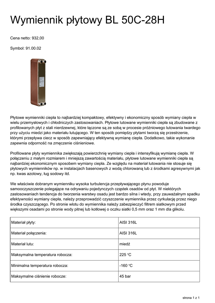 Wymiennik płytowy BL 50C-28H Cena netto: 932,00 Symbol: 91.00.02 Płytowe wymienniki ciepła to najbardziej kompaktowy, efektywny i ekonomiczny sposób wymiany ciepła w wielu przemysłowych i chłodniczych zastosowaniach. Płytowe lutowane wymienniki ciepła są zbudowane z profilowanych płyt z stali nierdzewnej, które łączone są ze sobą w procesie próżniowego lutowania twardego przy użyciu miedzi jako materiału lutującego. W ten sposób pomiędzy płytami tworzą się przestrzenie, którymi przepływa ciecz w sposób zapewniający efektywną wymianę ciepła. Dodatkowo, takie wykonanie zapewnia odporność na zmęczenie ciśnieniowe. Profilowane płyty wymiennika zwiększają powierzchnię wymiany ciepła i intensyfikują wymianę ciepła. W połączeniu z małym rozmiarem i mniejszą zawartością materiału, płytowe lutowane wymienniki ciepła są najbardziej ekonomicznym sposobem wymiany ciepła. Ze względu na materiał lutowania nie stosuje się płytowych wymienników np. w instalacjach basenowych z wodą chlorowaną lub z środkami agresywnymi jak np. kwas azotowy, ług sodowy itd. We właściwie dobranym wymienniku wysoka turbulencja przepływającego płynu powoduje samooczyszczenie polegające na odrywaniu pojedynczych cząstek osadów od płyt. W niektórych zastosowaniach tendencja do tworzenia warstwy osadu jest bardzo silna i wtedy, przy zauważalnym spadku efektywności wymiany ciepła, należy przeprowadzić czyszczenie wymiennika przez cyrkulację przez niego środka czyszczącego. Po stronie wlotu do wymiennika należy zabezpieczyć filtrem siatkowym przed większymi osadami po stronie wody pitnej lub kotłowej o oczku siatki 0,5 mm oraz 1 mm dla glikolu. Materiał płyty: AISI 316L Materiał połączenia: AISI 316L Materiał lutu: miedź Maksymalna temperatura robocza: 225 oC Minimalna temperatura robocza: -160 oC Maksymalne ciśnienie robocze: 45 bar strona 1 z 1