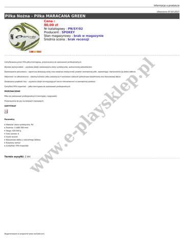 Informacje o produkcie Utworzono 07-03-2017 Piłka Nożna - Piłka MARACANA GREEN Cena : 80,00 zł Nr katalogowy : PN/SY/02 Producent : SPOKEY Stan magazynowy : brak w magazynie Średnia ocena : brak recenzji Wysoka wytrzymałość – uzyskana dzięki zastosowaniu skóry syntetycznej, wzmocnionej poliuretanem. p. pl Certyfikowana przez FIFA piłka treningowa, przeznaczona do zastosowań profesjonalnych. Zastosowanie poliuretanu – ogranicza absorpcję wody oraz zwiększa elastyczność powłoki zewnętrznej piłki, zapewniając równocześnie jej dobre odbicie. Odporność na odkształcenia – idealną kulistość piłka zawdzięcza 4 warstwom siateczki poliestrowo-bawełnianej oraz bezszwowej dętce. Certyfikat FIFA Inspected – piłka treningowa do zastosowań profesjonalnych. PRZEZNACZENIE Piłka do zastosowań profesjonalnych (treningów i rozgrywek). Przeznaczona do gry na boiskach trawiastych. CERTYFIKAT Materiał: skóra syntetyczna, PU ● Rozmiar: 5 (680-700 mm) ● Waga: 420-440 g ● Ilość warstw: 4 ● Szyta ręcznie ● Bezszwowa dętka z naturalnego lateksu ● Butylowy wentyl ● Certyfikat: FIFA Inspected w w Termin wysyłki: 2 dni w ● .e - pl Parametry ay sk le Zwiększona prędkość lotu – uzyskana dzięki zmniejszającym tarcie mikrootworom w zewnętrznej powłoce. Wygenerowano w programie www.oscGold.com