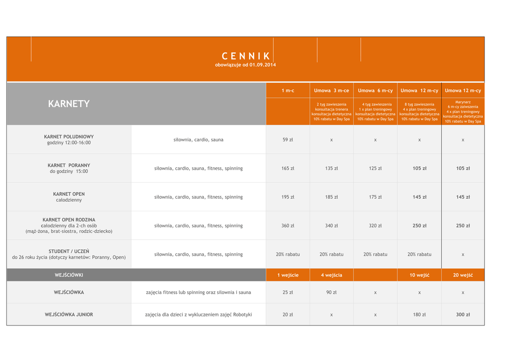CENNIK obowiązuje od 01.09.2014 1 m-c KARNETY Umowa 3 m-ce Umowa 6 m-cy 2 tyg zawieszenia konsultacja trenera konsultacja dietetyczna 10% rabatu w Day Spa 4 tyg zawieszenia 1 x plan treningowy konsultacja dietetyczna 10% rabatu w Day Spa Umowa 12 m-cy Umowa 12 m-cy Marynarz 8 tyg zawieszenia 6 m-cy zaiwszenia 4 x plan treningowy 4 x plan treningowy konsultacja dietetyczna konsultacja dietetyczna 10% rabatu w Day Spa 10% rabatu w Day Spa KARNET POŁUDNIOWY godziny 12:00-16:00 siłownia, cardio, sauna 59 zł x x x x KARNET PORANNY do godziny 15:00 siłownia, cardio, sauna, fitness, spinning 165 zł 135 zł 125 zł 105 zł 105 zł KARNET OPEN całodzienny siłownia, cardio, sauna, fitness, spinning 195 zł 185 zł 175 zł 145 zł 145 zł KARNET OPEN RODZINA całodzienny dla 2-ch osób (mąż-żona, brat-siostra, rodzic-dziecko) siłownia, cardio, sauna, fitness, spinning 360 zł 340 zł 320 zł 250 zł 250 zł STUDENT / UCZEŃ do 26 roku życia (dotyczy karnetów: Poranny, Open) siłownia, cardio, sauna, fitness, spinning 20% rabatu 20% rabatu 20% rabatu 20% rabatu x 1 wejście 4 wejścia 10 wejść 20 wejść WEJŚCIÓWKI WEJŚCIÓWKA zajęcia fitness lub spinning oraz silownia i sauna 25 zł 90 zł x x x WEJŚCIÓWKA JUNIOR zajęcia dla dzieci z wykluczeniem zajęć Robotyki 20 zł x x 180 zł 300 zł TRENINGI 1 trening 1 osoba 1 trening 2 osoby 10 treningów TRENING PERSONALNY 60 min 100 zł 150 zł 900 zł TRENING PERSONALNY dla klientów z umową na 3, 6, 12 m-cy 60 min 95 zł x 800 zł REHABILITACJA 60 min 80 zł x 700 zł PLAN TRENINGOWY zestaw ćwiczeń przygotowanych indywidualnie na podstawie przeprowadzonego wywiadu treningowego 50 zł 100 zł x DIETETYKA KONSULTACJA DIETETYKA wywiad zywieniowy, analiza składu ciała, analiza sposobu zywienia, przygotowanie indywidualnych zaleceń 50 zł ANALIZA SKŁADU CIAŁA analiza składu ciała z określeniem zapotrzebowania kalorycznego 25 zł INDYWIDUALNA DIETA 7 -DNI przygotowanie inywidualnej, 5 daniowej diety 7 dniowej wg zapotrzebowania kalorycznego 80 zł MIESIĘCZNY PROGRAM DIETETYCZNY dla jednej osoby a. wstępna konsultacja dietetyczna b. ułożenie 14-sto dniowej diety c. ułożenie indywidualnego planu treningowego d. ułozenie 14-sto dniowej diety e. kontrolna konsultacja dietetyczna 349 zł MIESIĘCZNY PROGRAM DIETETYCZNY dla dwóch osób a. wstępna konsultacja dietetyczna b. ułożenie 14-sto dniowej diety c. ułożenie indywidualnego planu treningowego d. ułozenie 14-sto dniowej diety e. kontrolna konsultacja dietetyczna 600 zł