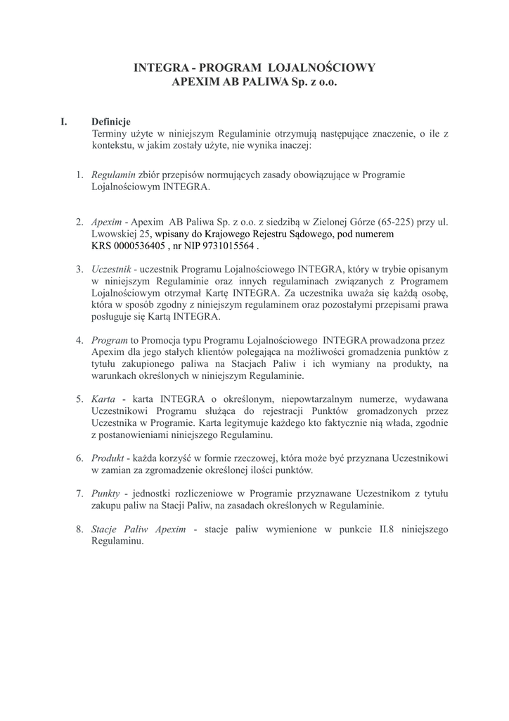 INTEGRA - PROGRAM LOJALNOŚCIOWY APEXIM AB PALIWA Sp. z o.o. I. Definicje Terminy użyte w niniejszym Regulaminie otrzymują następujące znaczenie, o ile z kontekstu, w jakim zostały użyte, nie wynika inaczej: 1. Regulamin zbiór przepisów normujących zasady obowiązujące w Programie Lojalnościowym INTEGRA. 2. Apexim - Apexim AB Paliwa Sp. z o.o. z siedzibą w Zielonej Górze (65-225) przy ul. Lwowskiej 25, wpisany do Krajowego Rejestru Sądowego, pod numerem KRS 0000536405 , nr NIP 9731015564 . 3. Uczestnik - uczestnik Programu Lojalnościowego INTEGRA, który w trybie opisanym w niniejszym Regulaminie oraz innych regulaminach związanych z Programem Lojalnościowym otrzymał Kartę INTEGRA. Za uczestnika uważa się każdą osobę, która w sposób zgodny z niniejszym regulaminem oraz pozostałymi przepisami prawa posługuje się Kartą INTEGRA. 4. Program to Promocja typu Programu Lojalnościowego INTEGRA prowadzona przez Apexim dla jego stałych klientów polegająca na możliwości gromadzenia punktów z tytułu zakupionego paliwa na Stacjach Paliw i ich wymiany na produkty, na warunkach określonych w niniejszym Regulaminie. 5. Karta - karta INTEGRA o określonym, niepowtarzalnym numerze, wydawana Uczestnikowi Programu służąca do rejestracji Punktów gromadzonych przez Uczestnika w Programie. Karta legitymuje każdego kto faktycznie nią włada, zgodnie z postanowieniami niniejszego Regulaminu. 6. Produkt - każda korzyść w formie rzeczowej, która może być przyznana Uczestnikowi w zamian za zgromadzenie określonej ilości punktów. 7. Punkty - jednostki rozliczeniowe w Programie przyznawane Uczestnikom z tytułu zakupu paliw na Stacji Paliw, na zasadach określonych w Regulaminie. 8. Stacje Paliw Apexim - stacje paliw wymienione w punkcie II.8 niniejszego Regulaminu. II. Zasady ogólne programu 1. Regulamin organizowanego przez Apexim Programu, przeznaczonego dla Klientów Apexim, jest dokumentem zawierającym wszystkie warunki uczestnictwa w tym Programie oraz ustalającym zasady obowiązujące pomiędzy Uczestnikiem Programu a firmą Apexim, będącą właścicielem i organizatorem Programu. 2. Przystąpienie do Programu jest dobrowolne. Przystępując do Programu Klient zawiera równocześnie umowę z Apexim. Poprzez zawarcie umowy obie strony przyjmują oraz akceptują warunki i zasady określone w niniejszym Regulaminie a także zobowiązują się do ich przestrzegania. Jeżeli Uczestnik naruszy warunki Regulaminu, może zostać wykluczony z uczestnictwa w Programie, ze skutkiem natychmiastowym i zablokowaniem lub odebraniem karty oraz unieważnieniem zgromadzonych przez Uczestnika Punktów. 3. Uczestnikami programu mogą być wyłącznie pełnoletnie osoby fizyczne, posiadające pełną zdolność do czynności prawnych. Pracownicy Apexim oraz Stacji Paliw Apexim nie mogą uczestniczyć w programie. 4. Apexim zastrzega sobie prawo dokonywania zmian Regulaminu, przy jednoczesnym powiadamianiu o tym Uczestników za pośrednictwem Stacji Paliw Apexim (w formie informacji pisemnych wywieszanych na terenie Stacji Paliw) oraz stron internetowych. 5. Uczestnik gromadzi Punkty za zakupy dokonane na uczestniczących w Programie Stacjach Paliw Apexim. Zgromadzone Punkty Uczestnik może zamienić na Produkty zgodnie z informacją o Produktach podaną do publicznej wiadomości poprzez jej udostępnienie na Stacjach Paliw biorących udziały w Programie. 6. Apexim może wyłączyć z poszczególnych Stacje Paliw Apexim z Programu, o czym powiadomi uczestników w sposób określony w punkcie 4 powyżej. Za zakup paliwa i dokonywanie innych zakupów w takich placówkach Apexim nie można uzyskać Punktów. 7. Program jest skierowany do wszystkich klientów i ma na celu zwiększenie sprzedaży oraz umocnienie kontaktów handlowych. 8. Stacjami Paliw Apexim uczestniczącymi w Programie będącym przedmiotem niniejszego Regulaminu są: − − − − Stacja Paliw nr 1, Osinów Dolny 40d, 74-520 Cedynia, Stacja Paliw nr 2, Osinów Dolny 51, 74-520 Cedynia, Stacja Paliw w Krzymowie, Krzymów 60, 74-506 Nawodna, Stacja Paliw nr 1, Sękowice 19A, 66-620 Gubin, − − − − − − Stacja Paliw nr 2, Sękowice 19B, 66-620 Gubin, Stacja Paliw nr 1, Plac Targowy 1, 68-132 Przewóz, Stacja Paliw nr 2, ul. Hutnicza 1a, 68-208 Łęknica, Stacja Paliw w Zasiekach, 68-343 Brody, Stacja Paliw Kopaczowie, Kopaczów 2,59-921 Sieniawka, Stacja Paliw w Sieniawce, ul. Świerczewskiego 5a, 59-921 Sieniawka. 9. Apexim jest uprawniony do modyfikacji listy Stacji Paliw Apexim, o której mowa w punkcie 8 powyżej na zasadach określonych w punkcie 4 powyżej. III. Warunki przystąpienia, Karta uczestnictwa 1. Osoba przystępuje do Programu po otrzymaniu Karty, stając się jednocześnie Uczestnikiem uprawnionym do udziału w Programie oraz do korzystania z Karty, służącej gromadzeniu Punktów. Osoba otrzymuje Kartę bez konieczności spełnienia żadnych dodatkowych wymogów, w szczególności bez konieczności podawania danych osobowych. 2. Karta jest wydawana na okaziciela. 3. Uczestnik rozpoczyna gromadzenie Punktów od momentu otrzymania Karty. 4. Karta stanowi własność Apexim . 5. Karty są przekazywane Klientom Apexim nieodpłatnie. 6. Karta nie jest kartą kredytową, bankomatową ani płatniczą. 7. Apexim ma prawo wydawać Karty o różnej szacie graficznej, w tym umieszczać na nich logo poszczególnych Partnerów Programu. IV. Uszkodzenie, zagubienie, zniszczenie, kradzieżsKarty. 1. W przypadku uszkodzenia, zagubienia lub kradzieży Karty należy o tym niezwłocznie powiadomić Apexim. Pracownicy Apexim podejmują dalsze działania w celu zablokowania Karty i wystawienia nowej wyłącznie po otrzymaniu zgłoszenia od Uczestnika. Uczestnik ma obowiązek osobistego zgłoszenia zgubienia, uszkodzenia lub kradzieży karty. Zgłoszenie następuje na wybranej przez Uczestnika stacji paliw Apexim objętych Programem. 2. Apexim nie ponosi odpowiedzialności za szkody wynikłe z zagubie