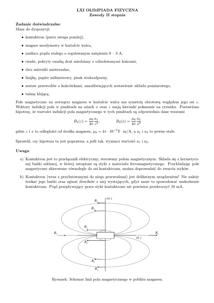 LXI OLIMPIADA FIZYCZNA Zawody II stopnia Zadanie doświadczalne Masz do dyspozycji: • kontaktron (patrz uwaga poniżej), • magnes neodymowy w kształcie walca, • zasilacz prądu stałego o regulowanym natężeniu 0 – 3 A, • cienki, pokryty emalią drut miedziany z odizolowanymi końcami, • dwa mierniki uniwersalne, • linijkę, papier milimetrowy, pisak wodoodporny, • zestaw przewodów z końcówkami, umożliwiających zestawienie układu pomiarowego, • taśmę klejącą. Pole magnetyczne na zewnątrz magnesu w kształcie walca ma symetrię obrotową względem jego osi z. Wektory indukcji pola w punktach na osiach x oraz z mają kierunki pokazanie na rysunku. Postawiono hipotezę, że wartości indukcji pola magnetycznego w tych punktach są odpowiednio dane wzorami B1 (z) = µ 0 a1 , 4π z 3 B2 (x) = µ 0 a2 4π x3 gdzie z i x to odległości od środka magnesu, µ0 = 4π · 10−7 T · m/A, a a1 i a2 to pewne stałe. Sprawdź, czy hipoteza ta jest poprawna, a jeśli tak, wyznacz wartości a1 i a2 . Uwaga: a) Kontaktron jest to przełącznik elektryczny, sterowany polem magnetycznym. Składa się z hermetycznej bańki szklanej, w której zatopione są styki z materiału ferromagnetycznego. Przykładając pole magnetyczne skierowane równolegle do osi kontaktronu, można doprowadzić do zwarcia styków. b) Kontaktron (wraz z przylutowanymi do niego przewodami) jest delikatnym urządzeniem! Nie należy ściskać jego bańki oraz zginać drucików z niej wystających, gdyż może to spowodować uszkodzenie kontaktronu. Prąd przepływający przez styki kontaktronu nie powinien przekroczyć 10 mA. B2 oś x B2 B2 B1 B1 oś z B2 B2 B2 Rysunek: Schemat linii pola magnetycznego w pobliżu magnesu. Rozwiązanie Rozwiązanie zadania opiera się na pomyśle pomiaru indukcji pola magnetycznego magnesu przy użyciu kontaktronu. Schemat proponowanego układu doświadczalnego do pomiaru pól na osiach x i z jest pokazany odpowiednio na rysunkach 1a) i 1b). Wykorzystując dostępny drut miedziany, na kontaktronie nawijamy a) A kontaktron magnes W b) kontaktron A magnes W Rysunek 1 cewkę. Do jej końców szeregowo podłączamy zasilacz prądu stałego i amperomierz. Dodatkowo, opór pomiędzy stykami kontaktronu mierzymy przy użyciu omomierza. Kontaktron przyklejamy do linijki, a magnes neodymowy umieszczamy na linijce w pewnej odległości od kontaktronu. Indukcja pola magnetycznego wzdłuż osi kontaktronu B będzie równa sumie Bm + Bc , gdzie Bm to indukcja pola od magnesu, a Bc to indukcja pola wytworzonego przez prąd w cewce, która jest równa Bc = µ0 nI, gdzie I to płynący przez cewkę prąd (wskazanie amperomierza), a n to liczba zwojów cewki na jednostkę długości. Oznaczmy przez Bkryt indukcję pola magnetycznego, która powoduje zwarcie styków kontaktronu. Wówczas jej wartość możemy wyznaczyć mierząc prąd Ikryt , jaki jest niezbędny do zwarcia styków przy nieobecności magnesu (moment zwarcia możemy łatwo wychwycić obserwując wskazanie omomierza). Wówczas Bkryt = µ0 nIkryt (1) Pomysł pomiaru indukcji pola magnetycznego wytwarzanego przez magnes opiera się na wyznaczeniu prądu I(r) niezbędnego do zwarcia styków kontaktronu dla różnych odległości r środka magnesu od kontaktronu mierzonej wzdłuż osi x lub z. Wtedy mamy, że µ0 nIkryt = Bkryt = µ0 nI(r) + Bm (r) (2) gdzie Bm (r) to składowa pola magnetycznego magnesu wzdłuż osi kontaktronu. Po prostym przekształceniu mamy µ 0 ai (3) µ0 n(Ikryt − I(r)) = Bm (r) = 4π r 3 gdzie i = 1, 2 odpowiada dwóm konfiguracjom położenia magnesu względem kontaktronu. Wykonując wykresy zależności Bm od 1/r 3 możemy sprawdzić, czy dla obu konfiguracji hipoteza postawiona w treści zadania jest prawdziwa. Dodatkowo, wartości współczynników a1 i a2 wyznaczymy dopasowując do danych doświadczalnych odpowiednie proste. W doświadczeniu przeprowadzanym przez recenzenta na kontaktron o długości 2, 0 ± 0, 1 cm nawinięto cewkę o 45 ± 2 zwojach, co dało n = 22, 5 ± 1, 5 zwoju na centymetr. W tym przypadku prąd niezbędny do zwarcia styków przy nieobecności magnesu był równy Ikryt = 0, 96 ± 0, 01A (jego wartość mierzono kilkukrotnie, aby zwiększyć dokładność wyniku). Następnie, dla każdej konfiguracji położenia magnesu i kontaktronu, wykonywano pomiary prądu zwierającego styki od odległości magnesu. Magnes umieszczano tak, aby składowa jego pola wzdłuż osi kontaktronu miała taki sam kierunek i zwrot, jak pole od cewki (co można było stwierdzić badając, czy prąd potrzebny do zwarcia styków w obecności magnesu jest większy bądź mniejszy od Ikryt ). Odległość magnesu od kontaktronu przyjmowano jako odległość środka magnesu od środka kontaktronu, co oczywiście powodowało pewien błąd z uwagi na rozmiary kontaktronu (błąd ten był szczególnie istotny dla pomiarów indukcji pola magnesu na osi z). Dla różnych odległości magnesu pomiar prądu I(r) przeprowadzano kilkukrotnie, każdorazowo przed pomiarem oddalając magnes od układu i wyłączając prąd płynący przez cewkę (aby uniknąć wpływu histerezy ferromagnetycznych styków). Wyniki pomiarów dla obu konfiguracji są przedstawione na rysunkach 2 i 3. Widzimy bardzo dobrą zgodność danych 2.5 B1 (mT) 2.0 1.5 1.0 0.5 0 0 5 10 15 3 20 25 3 1/z (1/dm ) Rysunek 2: Wykres pola B1 od 1/z 3 . 2.5 B2 (mT) 2.0 1.5 1.0 0.5 0 0 25 50 3 75 3 1/x (1/dm ) Rysunek 3: Wykres pola B2 od 1/x3 . doświadczalnych z hipotezą postawioną w treści zadania. Dopasowując proste otrzymano a1 = 1, 16 ± 0, 07 A · m2 , a2 = 0, 41 ± 0, 03 A · m2 (4) Na niepewność otrzymanych wielkości główny wpływ ma staranność wykonania pomiaru. Dodatkowo trzeba pamiętać, że rozmiary kontaktronu uniemożliwiają pomiar pola magnetycznego pochodzącego od magnesu w jednym punkcie, co również wpływa na błąd otrzymanego wyniku. Stosunek szukanych współczynników a1 /a2 = 2, 8 ± 0, 3. Wynik ten jest zgodn