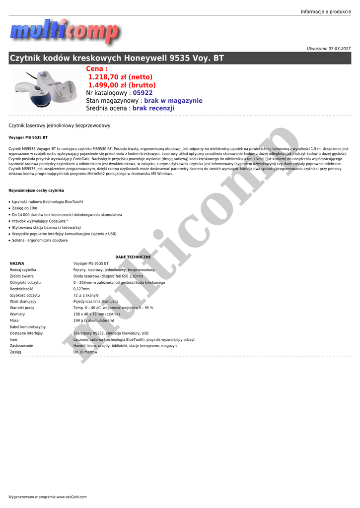 Informacje o produkcie Utworzono 07-03-2017 Czytnik kodów kreskowych Honeywell 9535 Voy. BT Cena : 1.218,70 zł (netto) 1.499,00 zł (brutto) Nr katalogowy : 05922 Stan magazynowy : brak w magazynie Średnia ocena : brak recenzji Czytnik laserowy jednoliniowy bezprzewodowy m p Voyager MS 9535 BT Czytnik MS9535 Voyager BT to następca czytnika MS9530 RF. Posiada trwałą, ergonomiczną obudowę. Jest odporny na wielokrotny upadek na powierzchnię betonową z wysokości 1.5 m. Urządzenie jest wyposażone w czujnik ruchu wykrywający pojawienie się przedmiotu z kodem kreskowym. Laserowy układ optyczny umożliwia skanowanie kodów z dużej odległości jak i odczyt kodów o dużej gęstości. Czytnik posiada przycisk wyzwalający CodeGate. Naciśnięcie przycisku powoduje wysłanie (drogą radiową) kodu kreskowego do odbiornika a ten z kolei (już kablem) do urządzenia współpracującego. Łączność radiowa pomiędzy czytnikiem a odbiornikiem jest dwukierunkowa, w związku, z czym użytkownik czytnika jest informowany (sygnałem dźwiękowym) czy dane zostały poprawnie odebrane. Czytnik MS9535 jest urządzeniem programowanym, dzięki czemu użytkownik może dostosować parametry skanera do swoich wymagań. Istnieją dwa sposoby programowania czytnika: przy pomocy zestawu kodów programujących lub programu MetroSet2 pracującego w środowisku MS Windows. Najważniejsze cechy czytnika Łączność radiowa (technologia BlueTooth) ● Zasięg do 10m ● Do 14 000 skanów bez konieczności doładowywania akumulatora ● Przycisk wyzwalający CodeGate™ ● Stylizowana stacja bazowa (z ładowarką) ● Wszystkie popularne interfejsy komunikacyjne (łącznie z USB) ● Solidna i ergonomiczna obudowa ti co ● DANE TECHNICZNE Voyager MS 9535 BT Rodzaj czytnika Ręczny, laserowy, jednoliniowy, bezprzewodowy Źródło światła Dioda laserowa (długość fali 650 ±10nm) Odległość odczytu 0 – 203mm w zależności od gęstości kodu kreskowego Rozdzielczość Szybkość odczytu Wzór skanujący Warunki pracy Wymiary ul NAZWA 0,127mm 72 ± 2 skany/s Pojedyncza linia skanująca Temp. 0 – 40 oC, wilgotność względna 5 – 95 % 198 x 40 x 78 mm (czytnik) Masa 199 g (z akumulatorem) - m Kabel komunikacyjny Dostępne interfejsy Szeregowy RS232, emulacja klawiatury, USB Inne Łączność radiowa (technologia BlueTooth), przycisk wyzwalający odczyt Zastosowanie Handel, biuro, urzędy, biblioteki, stacje benzynowe, magazyn Zasięg Do 10 metrów Wygenerowano w programie www.oscGold.com