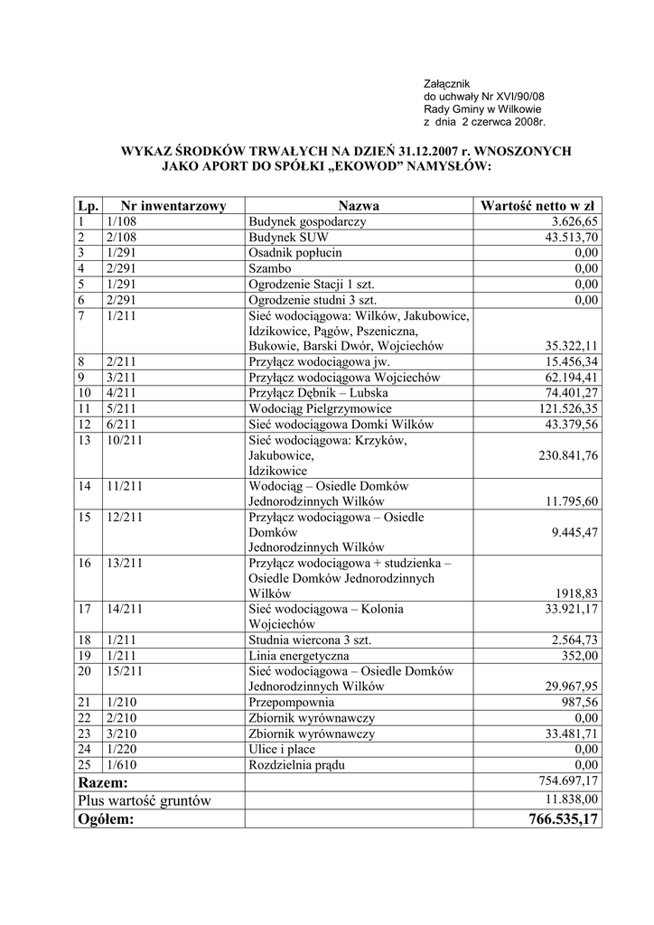 Załącznik do uchwały Nr XVI/90/08 Rady Gminy w Wilkowie z dnia 2 czerwca 2008r. WYKAZ ŚRODKÓW TRWAŁYCH NA DZIEŃ 31.12.2007 r. WNOSZONYCH JAKO APORT DO SPÓŁKI „EKOWOD” NAMYSŁÓW: Lp. 1 2 3 4 5 6 7 8 9 10 11 12 13 Nr inwentarzowy 1/108 2/108 1/291 2/291 1/291 2/291 1/211 2/211 3/211 4/211 5/211 6/211 10/211 14 11/211 15 12/211 16 13/211 17 14/211 18 19 20 1/211 1/211 15/211 21 22 23 24 25 1/210 2/210 3/210 1/220 1/610 Razem: Plus wartość gruntów Ogółem: Nazwa Budynek gospodarczy Budynek SUW Osadnik popłucin Szambo Ogrodzenie Stacji 1 szt. Ogrodzenie studni 3 szt. Sieć wodociągowa: Wilków, Jakubowice, Idzikowice, Pągów, Pszeniczna, Bukowie, Barski Dwór, Wojciechów Przyłącz wodociągowa jw. Przyłącz wodociągowa Wojciechów Przyłącz Dębnik – Lubska Wodociąg Pielgrzymowice Sieć wodociągowa Domki Wilków Sieć wodociągowa: Krzyków, Jakubowice, Idzikowice Wodociąg – Osiedle Domków Jednorodzinnych Wilków Przyłącz wodociągowa – Osiedle Domków Jednorodzinnych Wilków Przyłącz wodociągowa + studzienka – Osiedle Domków Jednorodzinnych Wilków Sieć wodociągowa – Kolonia Wojciechów Studnia wiercona 3 szt. Linia energetyczna Sieć wodociągowa – Osiedle Domków Jednorodzinnych Wilków Przepompownia Zbiornik wyrównawczy Zbiornik wyrównawczy Ulice i place Rozdzielnia prądu Wartość netto w zł 3.626,65 43.513,70 0,00 0,00 0,00 0,00 35.322,11 15.456,34 62.194,41 74.401,27 121.526,35 43.379,56 230.841,76 11.795,60 9.445,47 1918,83 33.921,17 2.564,73 352,00 29.967,95 987,56 0,00 33.481,71 0,00 0,00 754.697,17 11.838,00 766.535,17