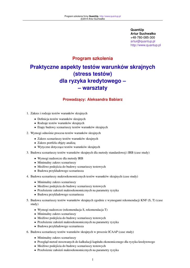 Program szkolenia firmy QuantUp, http://www.quantup.pl c 2014 Artur Suchwałko QuantUp Artur Suchwałko +48-780-085-300 [email protected] http://www.quantup.pl Program szkolenia Praktyczne aspekty testów warunków skrajnych (stress testów) dla ryzyka kredytowego – – warsztaty Prowadzacy: ˛ Aleksandra Babiarz 1. Zakres i rodzaje testów warunków skrajnych • Definicja testów warunków skrajnych • Rodzaje testów warunków skrajnych • Etapy budowy scenariuszy testów warunków skrajnych 2. Wymogi odnośnie procesu testów warunków skrajnych • Zakres scenariuszy testów warunków skrajnych • Zakres portfela obj˛ety analiza˛ • Wytyczne dotyczace ˛ testów warunków skrajnych 3. Budowa scenariuszy testów warunków skrajnych dla metody standardowej i IRB (case study) • • • • Wymogi nadzorcze dla metody IRB Minimalny zakres scenariuszy Możliwe podejścia do budowy scenariuszy testowych Budowa przykładowego scenariusza 4. Budowa scenariuszy makroekonomicznych testów warunków skrajnych (case study) • • • • Minimalny zakres scenariuszy Możliwe podejścia do budowy scenariuszy testowych Przełożenie założeń makroekonomicznych na parametry ryzyka Budowa przykładowego scenariusza 5. Budowa scenariuszy testów warunków skrajnych zgodnie z wymogami rekomendacji KNF (S, T) (case study) • • • • • Wymogi nadzorcze (rekomendacja S, rekomendacja T) Minimalny zakres scenariuszy Możliwe podejścia do budowy scenariuszy testowych Przełożenie założeń makroekonomicznych na parametry ryzyka Budowa przykładowego scenariusza 6. Budowa scenariuszy testów warunków skrajnych w procesie ICAAP (case study) • • • • Minimalny zakres scenariuszy Przeglad ˛ metod stosowanych do kalkulacji kapitału ekonomicznego dla ryzyka kredytowego Możliwe podejścia do budowy scenariuszy testowych Przełożenie założeń makroekonomicznych na parametry ryzyka 1 Program szkolenia firmy QuantUp, http://www.quantup.pl c 2014 Artur Suchwałko • Budowa przykładowego scenariusza 7. Proces raportowania wyników testów warunków skrajnych (case study) • • • • • Minimalny zakres raportu Prezentacja danych i założeń Wizualizacja wyników testów warunków skrajnych Komentarze do wyników testów warunków skrajnych Tworzenie przykładowego raportu 8. Audyt procesu testów warunków skrajnych (case study) • Na co zwrócić uwag˛e • Kompleksowa ocena programu testów warunków skrajnych 9. Zastosowanie testów warunków skrajnych (case study) • Wyznaczanie limitów kapitałowych • Alokacja kapitału 10. Jak opracować kompleksowy program testów warunków skrajnych? (case study) 2