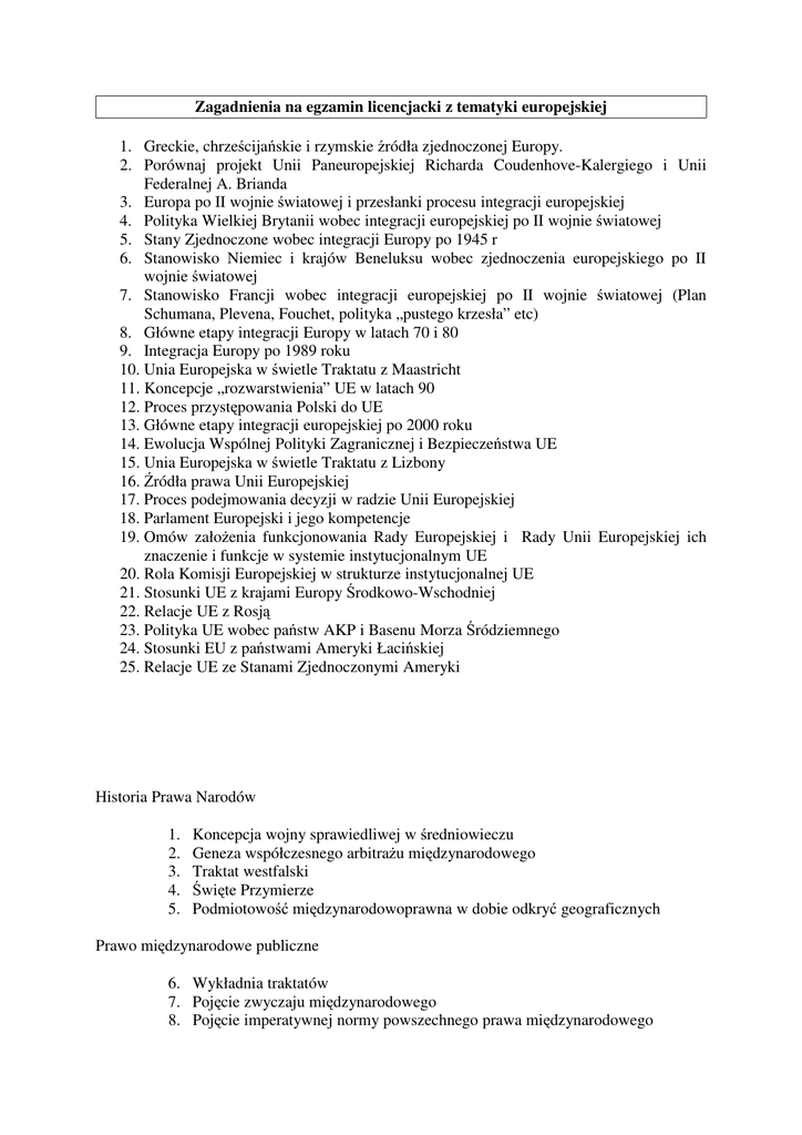 Zagadnienia na egzamin licencjacki z tematyki europejskiej 1. Greckie, chrześcijańskie i rzymskie źródła zjednoczonej Europy. 2. Porównaj projekt Unii Paneuropejskiej Richarda Coudenhove-Kalergiego i Unii Federalnej A. Brianda 3. Europa po II wojnie światowej i przesłanki procesu integracji europejskiej 4. Polityka Wielkiej Brytanii wobec integracji europejskiej po II wojnie światowej 5. Stany Zjednoczone wobec integracji Europy po 1945 r 6. Stanowisko Niemiec i krajów Beneluksu wobec zjednoczenia europejskiego po II wojnie światowej 7. Stanowisko Francji wobec integracji europejskiej po II wojnie światowej (Plan Schumana, Plevena, Fouchet, polityka „pustego krzesła” etc) 8. Główne etapy integracji Europy w latach 70 i 80 9. Integracja Europy po 1989 roku 10. Unia Europejska w świetle Traktatu z Maastricht 11. Koncepcje „rozwarstwienia” UE w latach 90 12. Proces przystępowania Polski do UE 13. Główne etapy integracji europejskiej po 2000 roku 14. Ewolucja Wspólnej Polityki Zagranicznej i Bezpieczeństwa UE 15. Unia Europejska w świetle Traktatu z Lizbony 16. Źródła prawa Unii Europejskiej 17. Proces podejmowania decyzji w radzie Unii Europejskiej 18. Parlament Europejski i jego kompetencje 19. Omów założenia funkcjonowania Rady Europejskiej i Rady Unii Europejskiej ich znaczenie i funkcje w systemie instytucjonalnym UE 20. Rola Komisji Europejskiej w strukturze instytucjonalnej UE 21. Stosunki UE z krajami Europy Środkowo-Wschodniej 22. Relacje UE z Rosją 23. Polityka UE wobec państw AKP i Basenu Morza Śródziemnego 24. Stosunki EU z państwami Ameryki Łacińskiej 25. Relacje UE ze Stanami Zjednoczonymi Ameryki Historia Prawa Narodów 1. 2. 3. 4. 5. Koncepcja wojny sprawiedliwej w średniowieczu Geneza współczesnego arbitrażu międzynarodowego Traktat westfalski Święte Przymierze Podmiotowość międzynarodowoprawna w dobie odkryć geograficznych Prawo międzynarodowe publiczne 6. Wykładnia traktatów 7. Pojęcie zwyczaju międzynarodowego 8. Pojęcie imperatywnej normy powszechnego prawa międzynarodowego 9. Status prawny przestrzeni lotniczej 10. Formy nabycia terytorium 11. Zasada samostanowienia narodów 12. Prawo do samoobrony 13. Pojęcie legalnego kombatanta w prawie międzynarodowym 14. Międzynarodowy Trybunał Karny – podstawa działania i zakres jurysdykcji 15. Środki odwetowe w prawie międzynarodowym 16. Immunitet jurysdykcyjny państwa 17. Fragmentacja prawa międzynarodowego 18. Podstawy jurysdykcji Międzynarodowego Trybunału Sprawiedliwości 19. Pojęcie agresji 20. Funkcje dyplomatyczne i konsularne Organizacje międzynarodowe 21. Pojęcie organizacji międzynarodowej 22. Teoria gier a organizacje międzynarodowe 23. Cele ONZ 24. Zgromadzenie Ogólne NZ 25. Rada Bezpieczeństwa NZ 26. Sekretariat ONZ 27. Rada ds. ogólnych WTO 28. Rada północnoatlantycka 29. Struktura wojskowa NATO 30. Rodzaje organizacji międzynarodowych Historia stosunków międzynarodowych 1. 2. 3. 4. 5. 6. 7. 8. 9. Polityka międzynarodowa (1815—1871). „Zbrojny pokój” w Europie (1871—1914). Jakie czynniki zdecydowały o wybuchu I wojny światowej? 14 punktów prezydenta Wilsona i ich znaczenie dla stanowienia pokoju i nowego porządku międzynarodowego po I wojnie światowej. I wojna światowa i geneza systemu Wersalsko-Waszyngtońskiego. Powstanie Ligi Narodów i jej rola w kształtowaniu stosunków międzynarodowych. Co nowego wniosła LN do polityki międzynarodowej? Rewizjonistyczny program niemieckiej polityki zagranicznej i główne cele strategii niemieckiej po dojściu Hitlera do władzy. Stosunki międzynarodowe w latach 1925—1936. System lokarneński i niepowodzenie koncepcji „zbiorowego bezpieczeństwa” w Europie. Polityka appeasementu wielkich mocarstw zachodnioeuropejskich i jej skutki w świetle kryzysu w europejskiej polityce międzynarodowej drugiej połowy lat 30. XX w. 10. Pakt Hitler-Stalin i geneza II wojny światowej. 11. Druga wojna światowa w dyplomacji mocarstw i narodziny systemu jałtańskopoczdamskiego. 12. Przyczyny i przebieg „zimnej wojny” (ideologia, geopolityka, ekonomia). 13. Uwarunkowania i postępy idei zjednoczenia „Europy Zachodniej” (1946—1992). 14. Przebieg i znaczenie procesu dekolonizacji. 15. Zniewolenie i wyzwolenie narodów Europy Środkowo-Wschodniej: 1945—1989. Ogólna problematyka stosunków międzynarodowych 1. System westfalski i jego znaczenie dla porządku międzynarodowego. 2. Główne cechy współczesnej globalizacji. 3. Przedstaw różnice pomiędzy pojęciem Polityka globalna, a geopolityka i polityka międzynarodowa. 4. Normy europejskiej społeczności międzynarodowej jako normy o charakterze uniwersalnym. 5. Układ hierarchiczny w stosunkach międzynarodowych i odzwierciedlające go kategorie państw. 6. Geneza doktryny bezpieczeństwa zbiorowego. 7. Uniwersalistyczne organizacje bezpieczeństwa międzynarodowego – ich główne cele i metody działania. 8. System dwubiegunowego a kształtowanie się sytuacji zimnowojennej. 9. Broń jądrowa jako instrument politycznego oddziaływania. 10. Przyczyny użycia przez Stany Zjednoczone broni atomowej w wojnie z Japonią. 11. Rola dekolonizacji w kształtowania się nowoczesnego sytemu międzynarodowego. 12. Wyścig zbrojeń nuklearnych i jego znaczenie w kontekście stosunków radziecko – amerykańskich 13. Procesy integracji międzynarodowej i najważniejsze regionalne ugrupowania integracyjne. 14. Koniec Zimnej Wojny a zmiana systemowa w polityce światowej. 15. Przyczyny przegranej Związku Sowieckiego w rywalizacji supermocarstw. 16. Stabilność współczesnego systemu międzynarodowego na tle systemu okresu Zimnej Wojny. 17. Rozwój globalizacji a rozpad systemu komunistycznego. 18. Przyczyny zakończenia się Zimnej Wojny. 19. Ataki terrorystyczne 11 września 2001 r. w Stanach Zjednoczonych i ich implikacje międzynarodowe. 20. Parametr siły i jego znaczenie w polityce międzynarodowej - różne sposoby 