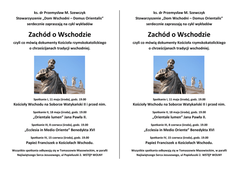 ks. dr Przemysław M. Szewczyk Stowarzyszenie „Dom Wschodni – Domus Orientalis” serdecznie zapraszają na cykl wykładów ks. dr Przemysław M. Szewczyk Stowarzyszenie „Dom Wschodni – Domus Orientalis” serdecznie zapraszają na cykl wykładów Zachód o Wschodzie Zachód o Wschodzie czyli co mówią dokumenty Kościoła rzymskokatolickiego o chrześcijanach tradycji wschodniej. czyli co mówią dokumenty Kościoła rzymskokatolickiego o chrześcijanach tradycji wschodniej. Spotkanie I, 11 maja (środa), godz. 19.00 Spotkanie I, 11 maja (środa), godz. 19.00 Kościoły Wschodu na Soborze Watykański II i przed nim. Kościoły Wschodu na Soborze Watykański II i przed nim. Spotkanie II, 18 maja (środa), godz. 19.00 Spotkanie II, 18 maja (środa), godz. 19.00 „Orientale lumen” Jana Pawła II. „Orientale lumen” Jana Pawła II. Spotkanie III, 8 czerwca (środa), godz. 19.00 Spotkanie III, 8 czerwca (środa), godz. 19.00 „Ecclesia in Medio Oriente” Benedykta XVI „Ecclesia in Medio Oriente” Benedykta XVI Spotkanie IV, 15 czerwca (środa), godz. 19.00 Spotkanie IV, 15 czerwca (środa), godz. 19.00 Papież Franciszek o Kościołach Wschodu. Papież Franciszek o Kościołach Wschodu. Wszystkie spotkania odbywają się w Tomaszowie Mazowieckim, w parafii Najświętszego Serca Jezusowego, ul Popiełuszki 2. WSTĘP WOLNY Wszystkie spotkania odbywają się w Tomaszowie Mazowieckim, w parafii Najświętszego Serca Jezusowego, ul Popiełuszki 2. WSTĘP WOLNY Chrześcijanie na Wschodzie i Zachodzie przez długie lata, a nawet przez długie wielki żyli albo odizolowani od siebie, albo we wzajemnej niechęci czy wręcz wrogości. Jedni nazwali siebie „ortodoksyjnymi” sugerując tym samym, że po drugiej stronie barykady są heretycy, drudzy podkreślali swoją „katolickość”, wobec której Kościoły o wielowiekowej tradycji, Kościoły Apostolskie, których teologowie do dziś karmią całe chrześcijaństwo miały skurczyć się do małych, lokalnych sekt. Chrześcijanie na Wschodzie i Zachodzie przez długie lata, a nawet przez długie wielki żyli albo odizolowani od siebie, albo we wzajemnej niechęci czy wręcz wrogości. Jedni nazwali siebie „ortodoksyjnymi” sugerując tym samym, że po drugiej stronie barykady są heretycy, drudzy podkreślali swoją „katolickość”, wobec której Kościoły o wielowiekowej tradycji, Kościoły Apostolskie, których teologowie do dziś karmią całe chrześcijaństwo miały skurczyć się do małych, lokalnych sekt. Skutki tych wielowiekowych podziałów niestety są widoczne cały czas, mimo że od kilku ładnych dekad w całym chrześcijaństwie Duch wzbudza wielkie pragnienie jedności i faktycznie dokonuje się zbliżenie między uczniami jednego Pana, którzy przez wieki albo się nie znali albo czuli do siebie niechęć. Wschodnie chrześcijaństwo jawi nam się chyba zbyt często jako obce i „nie-nasze”. Zbyt często o Kościele na Wschodzie mówimy per „oni”, a nie „my”. Skutki tych wielowiekowych podziałów niestety są widoczne cały czas, mimo że od kilku ładnych dekad w całym chrześcijaństwie Duch wzbudza wielkie pragnienie jedności i faktycznie dokonuje się zbliżenie między uczniami jednego Pana, którzy przez wieki albo się nie znali albo czuli do siebie niechęć. Wschodnie chrześcijaństwo jawi nam się chyba zbyt często jako obce i „nie-nasze”. Zbyt często o Kościele na Wschodzie mówimy per „oni”, a nie „my”. Warto zadać zatem sobie pytanie: jak dzisiaj Kościół rzymski, którego jesteśmy częścią, postrzega dziś chrześcijański Wschód. Dlatego wraz ze Stowarzyszeniem „Dom Wschodni – Domus Orientalis” zapraszam na cykl czterech spotkań, podczas których przyjrzymy się dokumentom i wypowiedziom Kościoła rzymskiego na temat chrześcijan tradycji wschodnich. Warto zadać zatem sobie pytanie: jak dzisiaj Kościół rzymski, którego jesteśmy częścią, postrzega dziś chrześcijański Wschód. Dlatego wraz ze Stowarzyszeniem „Dom Wschodni – Domus Orientalis” zapraszam na cykl czterech spotkań, podczas których przyjrzymy się dokumentom i wypowiedziom Kościoła rzymskiego na temat chrześcijan tradycji wschodnich. ks. dr Przemysław M. Szewczyk www.domwschodni.pl ks. dr Przemysław M. Szewczyk www.domwschodni.pl