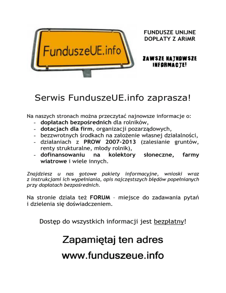 FUNDUSZE UNIJNE DOPŁATY Z ARiMR ZAWSZE NAJNOWSZE INFORMACJE! Serwis FunduszeUE.info zaprasza! Na naszych stronach moŜna przeczytać najnowsze informacje o: dopłatach bezpośrednich dla rolników, dotacjach dla firm, organizacji pozarządowych, bezzwrotnych środkach na załoŜenie własnej działalności, działaniach z PROW 2007-2013 (zalesianie gruntów, renty strukturalne, młody rolnik), - dofinansowaniu na kolektory słoneczne, farmy wiatrowe i wiele innych. - Znajdziesz u nas gotowe pakiety informacyjne, wnioski wraz z instrukcjami ich wypełniania, opis najczęstszych błędów popełnianych przy dopłatach bezpośrednich. Na stronie działa teŜ FORUM – miejsce do zadawania pytań i dzielenia się doświadczeniem. Dostęp do wszystkich informacji jest bezpłatny! Zapamiętaj ten adres www.funduszeue.info