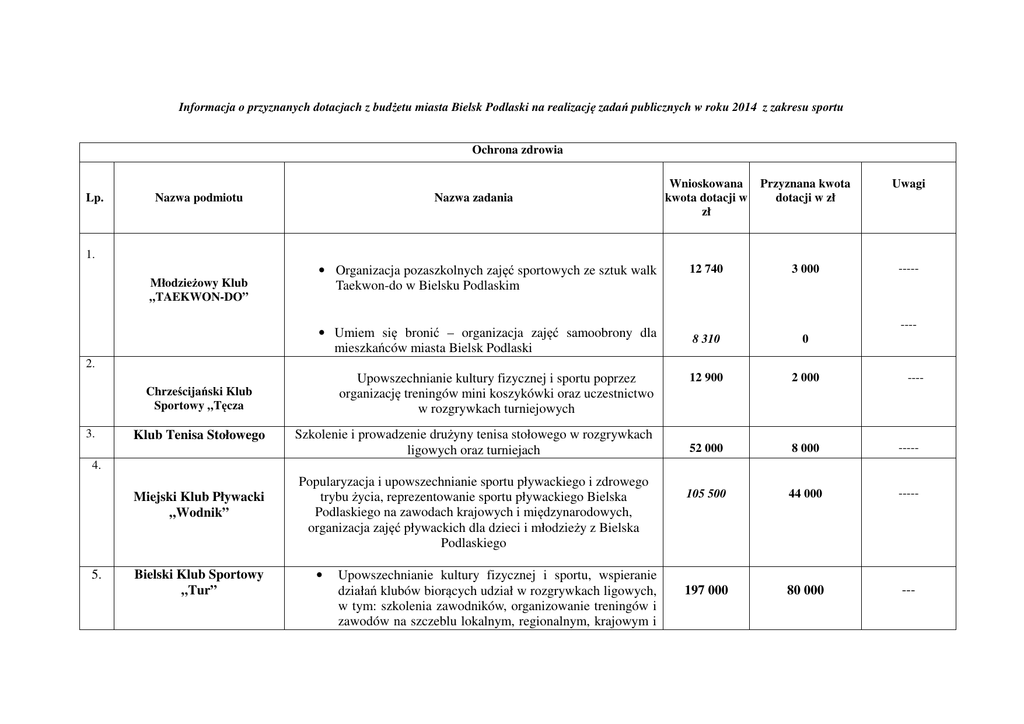 Informacja o przyznanych dotacjach z budżetu miasta Bielsk Podlaski na realizację zadań publicznych w roku 2014 z zakresu sportu Ochrona zdrowia Lp. Nazwa podmiotu Nazwa zadania Wnioskowana kwota dotacji w zł Przyznana kwota dotacji w zł Uwagi 12 740 3 000 ----- 8 310 0 12 900 2 000 52 000 8 000 ----- 105 500 44 000 ----- 197 000 80 000 --- 1. Młodzieżowy Klub „TAEKWON-DO” • Organizacja pozaszkolnych zajęć sportowych ze sztuk walk Taekwon-do w Bielsku Podlaskim • Umiem się bronić – organizacja zajęć samoobrony dla mieszkańców miasta Bielsk Podlaski ---- 2. Upowszechnianie kultury fizycznej i sportu poprzez organizację treningów mini koszykówki oraz uczestnictwo w rozgrywkach turniejowych Chrześcijański Klub Sportowy „Tęcza 3. Klub Tenisa Stołowego Szkolenie i prowadzenie drużyny tenisa stołowego w rozgrywkach ligowych oraz turniejach ---- 4. Miejski Klub Pływacki „Wodnik” 5. Bielski Klub Sportowy „Tur” Popularyzacja i upowszechnianie sportu pływackiego i zdrowego trybu życia, reprezentowanie sportu pływackiego Bielska Podlaskiego na zawodach krajowych i międzynarodowych, organizacja zajęć pływackich dla dzieci i młodzieży z Bielska Podlaskiego • Upowszechnianie kultury fizycznej i sportu, wspieranie działań klubów biorących udział w rozgrywkach ligowych, w tym: szkolenia zawodników, organizowanie treningów i zawodów na szczeblu lokalnym, regionalnym, krajowym i międzynarodowym poprzez przygotowanie zespołu w rozgrywkach ligowych –piłka nożna i udział • Sekcja koszykowa: Wspieranie rozwoju kultury fizycznej, sportu, wtym organizację szkoleń, imprez, zawodów, widowisk i rozgrywek sportowych w zakresie: upowszechniania kultury fizycznej i sportu poprzez wspieranie działań klubów biorących udział w rozgrywkach II ligi koszykówki męskiej, w tym: szkolenia zawodników, organizowanie treningów i zawodów na szczeblu krajowym 117 550 60 000