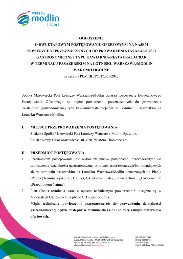 OGŁOSZENIE O DWUETAPOWYM POSTĘPOWANIU OFERTOWYM NA NAJEM POWIERZCHNI PRZEZNACZONYCH DO PROWADZENIA DZIAŁALNOŚCI GASTRONOMICZNEJ TYPU KAWIARNIA/RESTAURACJA/BAR W TERMINALU PASAŻERSKIM NA LOTNISKU WARSZAWA/MODLIN WARUNKI OGÓLNE nr sprawy PLM/BH/PO/TG/01/2012 Spółka Mazowiecki Port Lotniczy Warszawa-Modlin ogłasza rozpoczęcie Dwuetapowego Postępowania Ofertowego na najem powierzchni przeznaczonych do prowadzenia działalności gastronomicznej typu kawiarnia/restauracja/bar w Terminalu Pasażerskim na Lotnisku Warszawa/Modlin. I. MIEJSCE PRZEPROWADZENIA POSTĘPOWANIA Siedziba Spółki Mazowiecki Port Lotniczy Warszawa-Modlin Sp. z o.o. 05-102 Nowy Dwór Mazowiecki, ul. Gen. Wiktora Thommee 1a II. PRZEDMIOT POSTĘPOWANIA: 1. Przedmiotem postępowania jest wybór Najemców powierzchni przeznaczonych do prowadzenia działalności gastronomicznej typu kawiarnia/restauracja/bar, znajdujących się w terminalu pasażerskim na Lotnisku Warszawa/Modlin oznaczonych na Planie (Rzucie) terminala jako G1, G2, G3, G4 zwanych dalej „Powierzchnią”, „Lokalem” lub „Przedmiotem Najmu”. 2. Plan (Rzut) terminala wraz z opisem technicznym powierzchni* dostępne są w Materiałach Ofertowych na płycie CD – gastronomia. *Opis techniczny powierzchni przeznaczonych do prowadzenia działalności gastronomicznej będzie dostępny w terminie do 14 dni od daty zakupu materiałów ofertowych. III. ZASADY OGÓLNE 1. Postępowanie ofertowe przygotowuje i przeprowadza Spółka Mazowiecki Port Lotniczy Warszawa-Modlin zwana dalej Wynajmującym lub MPL. 2. Szczegółowe warunki i zasady prowadzenia niniejszego postępowania ofertowego zostały określone w Zaproszeniu, które dostępne jest w Materiałach Ofertowych na płycie CD-gastronomia. 3. Wszystkie koszty udziału oraz przygotowania oferty pokrywa Oferent. 4. Postępowanie Ofertowe zostanie przeprowadzone w dwóch etapach. 5. W postępowaniu ofertowym może wziąć udział każdy Podmiot prowadzący działalność gospodarczą, niezależnie od jego formy prawnej, miejsca rejestracji czy struktury własności, który spełni warunki określone w Zaproszeniu, o którym mowa w pkt. 2. 6. W niniejszym Ogłoszeniu określono tylko podstawowe warunki udziału w postępowaniu. 7. Z ubiegania się o udział w postepowaniu wyklucza się: a) podmioty, które w związku z wykonywaniem działalności wyrządziły szkodę swoim kontrahentom nie wywiązując się ze swoich zobowiązań lub wykonując je nienależycie jeżeli szkoda ta została stwierdzona orzeczeniem sądu, które uprawomocniło się w okresie 3 lat przed wszczęciem postępowania, b) podmioty, w odniesieniu do których wszczęto postępowanie upadłościowe lub ogłoszono upadłość, c) podmioty, które zalegają z uiszczaniem podatków, opłat oraz składek na ubezpieczenie społeczne, d) osoby fizyczne, a w przypadku pozostałych przedsiębiorców, członkowie organów zarządzających, którzy zostali prawomocnie skazani za przestępstwo przekupstwa, przestępstwo przeciw obrotowi gospodarczemu lub inne przestępstwo popełnione w celu osiągnięcia korzyści majątkowych. e) Oferentów, którzy złożyli niepełne (nie odpowiadające wymogom zawartym w Zaproszeniu) Oferty Wstępne. 8. f) Oferentów, którzy złożyli Oferty Wstępne po terminie wyznaczonym przez MPL g) Oferentów, którzy nie spełnią warunków udziału określonych Zaproszeniu. MPL wymaga złożenia stosownych oświadczeń w zakresie pkt. 7 lit. a-d, których wzór dostępny jest w Materiałach Ofertowych na płycie CD-Gastronomia. Złożenie oświadczenia nieprawdziwego wyklucza z postępowania, a po zawarciu umowy jest rażącym jej naruszeniem i stanowi podstawę do odstąpienia od umowy. 9. Postępowanie nie jest jawne i nie przewiduje się publicznego otwierania ofert oraz informowania o biorących udział w postępowaniu Oferentach. 10. Weryfikacji, oceny i wyboru ofert dokona Komisja powołana przez Zarząd MPL. 11. MPL zastrzega sobie prawo do: odwołania lub zmiany warunków zaproszenia, unieważnienia postępowania bez podawania przyczyn i może to zrobić w dowolnym czasie bez ponoszenia odpowiedzialności wobec oferentów, którzy złożyli oferty. 12. Dopuszcza się składanie ofert: a) na dowolną ilość powierzchni gastronomicznych, i/lub b) 13. złożenie oferty kompleksowej na wszystkie powierzchnie gastronomiczne. Nie dopuszcza się: a) wyłączności na sprzedaż jakichkolwiek produktów w jakiejkolwiek strefie funkcjonalnej Terminala, b) wynajmu łącznie wszystkich powierzchni handlowych i gastronomicznych jednemu Najemcy. 14. Oferty należy składać w dwóch wariantach: a) zakładając 6 letni okres trwania umowy, oraz b) zakładając 10 letni okres trwania umowy. 15. Preferowany przez MPL okres trwania umowy najmu wynosi 6 lat. IV. PIERWSZY ETAP POSTĘPOWANIA OFERTOWEGO Warunkiem przystąpienia do Pierwszego Etapu Postępowania jest: 1. Posiadanie doświadczenia w prowadzeniu działalności gastronomicznej minimum przez okres 3 lat przed datą składania ofert. 2. Złożenie następujących dokumentów: a) kserokopii (poświadczonej za zgodność z oryginałem) aktualnego odpisu z właściwego rejestru albo zaświadczenia o wpisie do ewidencji działalności gospodarczej, (wystawione nie wcześniej niż 6 miesięcy przed upływem terminu składania ofert), w przypadku osób fizycznych rozliczających się w formie spółki cywilnej - zaświadczenie o wpisie do ewidencji wspólników oraz aktualna umowa spółki cywilnej; b) kopii potwierdzonej za zgodność z oryginałem decyzji o nadaniu nr REGON; c) kopii potwierdzonej za zgodność z oryginałem decyzji o nadaniu nr NIP; e) podpisanego przez Oferenta pełnomocnictwa dla osób występujących w imieniu Oferenta do podpisania oferty i podejmowania zobowiązań, w przypadku gdy osoby te nie są ujęte w odpisie z właściwego rejestru lub ewidencji jako upoważnione do reprezentowania Oferenta; f) podpisane oświadczenia Oferenta zgodnie ze