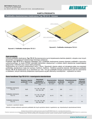 KARTA PRODUKTU Podkładka elastomerowa niezbrojona Typ TD 21 S - liniowa Rysunek 2. Podkładka niezbrojona TD 21 S Rysunek 1. Podkładka niezbrojona TD 21 S Opis produktu Liniowe podkładki niezbrojone Typ TD 21 S przeznaczone są do łożyskowania dachów płaskich, stropów oraz innych elementów wymagających elastycznego liniowego podparcia. Podkładki Typ TD 21 S to elementy składający się z podkładki niezbrojonej (zwanej rdzeniem podkładki z kauczuku wulkanizowanego na bazie EPDM) osłoniętej elementem elastycznym w postaci pianki elastycznej (wypełniającej) połączonej z rdzeniem przy użyciu taśmy krepowej. Wykonywane są w dwóch wysokościach 5mm i 10mm. Szerokość rdzenia zależy od obciążenia jakie ma przenieść podkładka, standardowo mają one wymiary: 5x25mm, 5x50mm, 10x50mm (przekrój rdzenia). Standardowo podkładki liniowe TD 21 S dostarczane są w odcinkach po 1mb. Ten typ podkładki liniowej przeznaczony jest do stosowania w obiektach, których elementy podpierane wykonywane są jako elementy monolityczne – wylewane na mokro. Dane handlowe Typ TD 21 S – rozwiązania standardowe Wymiary rdzenia podkładki ٭t x bE mm Szerokość podkładki z wypełnieniem b mm Dopuszczalne naprężenie 2 N / mm Podkładka niezbrojona TD 21 S 5x25 115, 150, 175, 200, 240, 300, 365 do 8 200 ± 2,1 5 Podkładka niezbrojona TD 21 S 5x50 115, 150, 175, 200, 240, 300, 365 do 15 750 ± 2,1 5 Podkładka niezbrojona TD 21 S 10x50 115, 150, 175, 200, 240, 300, 365 do 8 400 ± 5,6 10 Nazwa Nośność Przemieszczenie podkładki poziome kN / mb mm Grubość całkowita podkładki mm ٭wysokość x szerokość rdzenia UWAGA: Istnieje możliwość wykonania podkładek dla innych wymiarów rdzenia i wypełnienia, wg. indywidualnych zapotrzebowań klienta. Niniejsza karta produktowa została opracowana przez firmę BETOMAX Polska S.A. i pozostaje własnością firmy. Przedruk, kopiowanie oraz udostępnianie karty katalogowej w całości bądź części osobom do których nie jest kierowana, bez pisemnej zgody firmy BETOMAX Polska S.A. są zabronione. Podstawa prawna –Dz.U.Nr 24/1994 poz 83 z późniejszymi zmianami. Ustawa o prawie autorskim i prawach pokrewnych. Dane handlowe Typ TD 21 S – rozwiązania niestandardowe Na potrzeby indywidualne klienta jesteśmy w stanie zaprojektować podkładkę o innych wymiarach rdzenia np. w celu zwiększenia nośności podkładki liniowej. Szerokość wypełnienia może także być dostosowana do danej sytuacji montażowej na budowie. W tym celu należy dysponować wiedzą dotyczącą wymaganej nośności, przesuwu oraz szerokość całkowitą podkładki. Odporność ogniowa Liniowe podkładki elastomerowe niezbrojone Typ TD 21 S użyte jako złącza liniowe w budynkach budownictwa ogólnego i konstrukcjach przemysłowych spełniają kryteria odporności ogniowej REI 120, przy czym, przy doborze podkładek należy uwzględnić zasięg zniszczenia (degradacji) podkładek obliczony na podstawie prędkości zwęglania (degradacji) podanej w Tablicy 1 – Aprobata Techniczna AT-15-7634/2013 Zastosowanie produktu Liniowe podkładki niezbrojone przeznaczone są do podpierania elementów w budynkach budownictwa ogólnego i konstrukcjach przemysłowych. Oprócz podstawowego zadania jakim jest elastyczne podparcie elementów, charakteryzują się sprężystością, możliwością przeniesienia odkształceń kątowych oraz zapewniają równomierny rozkład naprężeń. Rysunek 3. Przykład sytuacji montażowej podkładki Typ TD 21 S Data wydania: 2014-10-15 Niniejsza karta produktowa została opracowana przez firmę BETOMAX Polska S.A. i pozostaje własnością firmy. Przedruk, kopiowanie oraz udostępnianie karty katalogowej w całości bądź części osobom do których nie jest kierowana, bez pisemnej zgody firmy BETOMAX Polska S.A. są zabronione. Podstawa prawna –Dz.U.Nr 24/1994 poz 83 z późniejszymi zmianami. Ustawa o prawie autorskim i prawach pokrewnych.