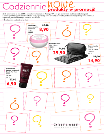 nowe Codziennie produkty w promocji! Zrób zamówienie za min. 50 PP z produktów ukazanych w Katalogu 10*, a w tym zamówieniu b´dziesz móg∏ skorzystaç z promocji! W kolejnych dniach w ofercie b´dà pojawiaç si´ nowe produkty. Odwiedzaj codziennie naszà stron´ www.oriflame.pl i sprawdzaj, co mo˝esz zdobyç nawet do 75% taniej! * Z wy∏àczeniem produktów z tej oferty 17,90 8,90 13638 PP 3 ? ? Nawil˝ajàcy balsam po goleniu South For Men 50 ml 21294 PP 2 17,90 6,90 ? ? ? ? Nawil˝ajàcy krem na dzieƒ Essentials 75 ml ? ? ? R´cznik Action 70 x 110 cm 18831 PP 5 74,00 29,90 ? Kosmetyczka Action 22 x 16 x 9 cm 18832 PP 2 39,00 14,90 ? ? ? ? ?