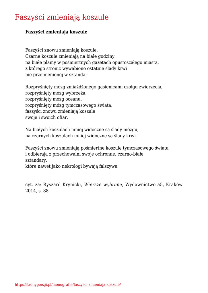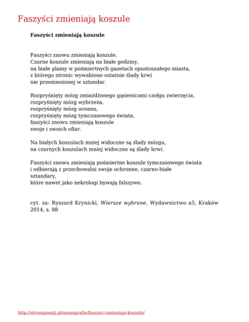 Faszyści zmieniają koszule Faszyści zmieniają koszule Faszyści znowu zmieniają koszule. Czarne koszule zmieniają na białe godziny, na białe plamy w pośmiertnych gazetach opustoszałego miasta, z którego stronic wywabiono ostatnie ślady krwi nie przemienionej w sztandar. Rozpryśnięty mózg zmiażdżonego gąsienicami czołgu zwierzęcia, rozpryśnięty mózg wybrzeża, rozpryśnięty mózg oceanu, rozpryśnięty mózg tymczasowego świata, faszyści znowu zmieniają koszule swoje i swoich ofiar. Na białych koszulach mniej widoczne są ślady mózgu, na czarnych koszulach mniej widoczne są ślady krwi. Faszyści znowu zmieniają pośmiertne koszule tymczasowego świata i odbierają z przechowalni swoje ochronne, czarno-białe sztandary, które nawet jako nekrologi bywają falszywe. cyt. za: Ryszard Krynicki, Wiersze wybrane, Wydawnictwo a5, Kraków 2014, s. 88 http://stronypoezji.pl/monografie/faszysci-zmieniaja-koszule/