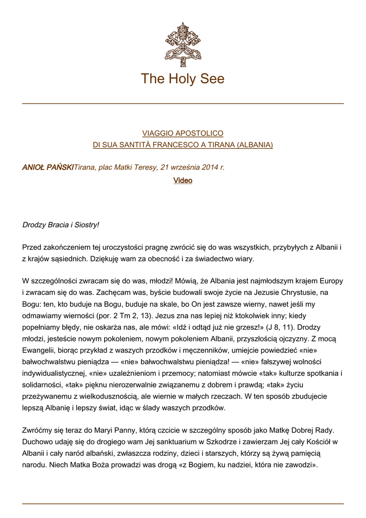 The Holy See VIAGGIO APOSTOLICO DI SUA SANTITÀ FRANCESCO A TIRANA (ALBANIA) ANIOŁ PAŃSKITirana, plac Matki Teresy, 21 września 2014 r. Video Drodzy Bracia i Siostry! Przed zakończeniem tej uroczystości pragnę zwrócić się do was wszystkich, przybyłych z Albanii i z krajów sąsiednich. Dziękuję wam za obecność i za świadectwo wiary. W szczególności zwracam się do was, młodzi! Mówią, że Albania jest najmłodszym krajem Europy i zwracam się do was. Zachęcam was, byście budowali swoje życie na Jezusie Chrystusie, na Bogu: ten, kto buduje na Bogu, buduje na skale, bo On jest zawsze wierny, nawet jeśli my odmawiamy wierności (por. 2 Tm 2, 13). Jezus zna nas lepiej niż ktokolwiek inny; kiedy popełniamy błędy, nie oskarża nas, ale mówi: «Idź i odtąd już nie grzesz!» (J 8, 11). Drodzy młodzi, jesteście nowym pokoleniem, nowym pokoleniem Albanii, przyszłością ojczyzny. Z mocą Ewangelii, biorąc przykład z waszych przodków i męczenników, umiejcie powiedzieć «nie» bałwochwalstwu pieniądza — «nie» bałwochwalstwu pieniądza! — «nie» fałszywej wolności indywidualistycznej, «nie» uzależnieniom i przemocy; natomiast mówcie «tak» kulturze spotkania i solidarności, «tak» pięknu nierozerwalnie związanemu z dobrem i prawdą; «tak» życiu przeżywanemu z wielkodusznością, ale wiernie w małych rzeczach. W ten sposób zbudujecie lepszą Albanię i lepszy świat, idąc w ślady waszych przodków. Zwróćmy się teraz do Maryi Panny, którą czcicie w szczególny sposób jako Matkę Dobrej Rady. Duchowo udaję się do drogiego wam Jej sanktuarium w Szkodrze i zawierzam Jej cały Kościół w Albanii i cały naród albański, zwłaszcza rodziny, dzieci i starszych, którzy są żywą pamięcią narodu. Niech Matka Boża prowadzi was drogą «z Bogiem, ku nadziei, która nie zawodzi». 2 © Copyright - Libreria Editrice Vaticana