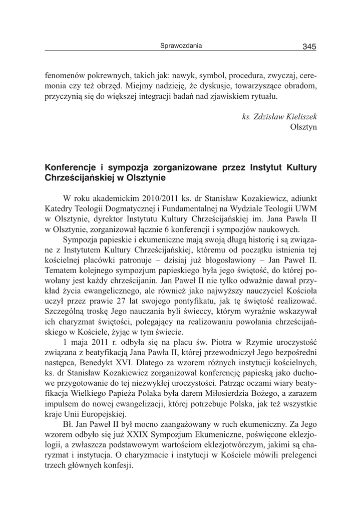 Sprawozdania 345 Studia Warmińskie 48 (2011) fenomenów pokrewnych, takich jak: nawyk, symbol, procedura, zwyczaj, ceremonia czy te¿ obrzêd. Miejmy nadziejê, ¿e dyskusje, towarzysz¹ce obradom, przyczyni¹ siê do wiêkszej integracji badañ nad zjawiskiem rytua³u. ks. Zdzis³aw Kieliszek Olsztyn Konferencje i sympozja zorganizowane przez Instytut Kultury Chrześcijańskiej w Olsztynie W roku akademickim 2010/2011 ks. dr Stanis³aw Kozakiewicz, adiunkt Katedry Teologii Dogmatycznej i Fundamentalnej na Wydziale Teologii UWM w Olsztynie, dyrektor Instytutu Kultury Chrzecijañskiej im. Jana Paw³a II w Olsztynie, zorganizowa³ ³¹cznie 6 konferencji i sympozjów naukowych. Sympozja papieskie i ekumeniczne maj¹ swoj¹ d³ug¹ historiê i s¹ zwi¹zane z Instytutem Kultury Chrzecijañskiej, któremu od pocz¹tku istnienia tej kocielnej placówki patronuje dzisiaj ju¿ b³ogos³awiony Jan Pawe³ II. Tematem kolejnego sympozjum papieskiego by³a jego wiêtoæ, do której powo³any jest ka¿dy chrzecijanin. Jan Pawe³ II nie tylko odwa¿nie dawa³ przyk³ad ¿ycia ewangelicznego, ale równie¿ jako najwy¿szy nauczyciel Kocio³a uczy³ przez prawie 27 lat swojego pontyfikatu, jak tê wiêtoæ realizowaæ. Szczególn¹ troskê Jego nauczania byli wieccy, którym wyranie wskazywa³ ich charyzmat wiêtoci, polegaj¹cy na realizowaniu powo³ania chrzecijañskiego w Kociele, ¿yj¹c w tym wiecie. 1 maja 2011 r. odby³a siê na placu w. Piotra w Rzymie uroczystoæ zwi¹zana z beatyfikacj¹ Jana Paw³a II, której przewodniczy³ Jego bezporedni nastêpca, Benedykt XVI. Dlatego za wzorem ró¿nych instytucji kocielnych, ks. dr Stanis³aw Kozakiewicz zorganizowa³ konferencjê papiesk¹ jako duchowe przygotowanie do tej niezwyk³ej uroczystoci. Patrz¹c oczami wiary beatyfikacja Wielkiego Papie¿a Polaka by³a darem Mi³osierdzia Bo¿ego, a zarazem impulsem do nowej ewangelizacji, której potrzebuje Polska, jak te¿ wszystkie kraje Unii Europejskiej. B³. Jan Pawe³ II by³ mocno zaanga¿owany w ruch ekumeniczny. Za Jego wzorem odby³o siê ju¿ XXIX Sympozjum Ekumeniczne, powiêcone eklezjologii, a zw³aszcza podstawowym wartociom eklezjotwórczym, jakimi s¹ charyzmat i instytucja. O charyzmacie i instytucji w Kociele mówili prelegenci trzech g³ównych konfesji. 346 Sprawozdania Historia Wa¿nym wydarzeniem w historii Instytutu Kultury Chrzecijañskiej s¹ Warmiñskie Dni Duszpasterskie, które od pocz¹tku by³y prowadzone przez tê instytucjê kocieln¹ i zwi¹zane s¹ z problematyk¹ pastoraln¹. Ostatnie Dni Duszpasterskie by³y powiêcone ludziom Eucharystii. Prelegenci przybli¿ali sylwetki wiêtych, b³ogos³awionych i kandydatów na o³tarze, którzy w swoim ¿yciu i powo³aniu chrzecijañskim, bêd¹c cz³onkami Kocio³a jako duchowni i wieccy katolicy, byli ludmi Eucharystii, a tak¿e prowadzili intensywne ¿ycie eucharystyczne i do takiego ¿ycia zachêcali duchownych i wieckich katolików. Ide¹, która przywieca³a organizatorom spotkañ by³a dba³oæ o formacjê katolików wieckich, a tak¿e o ich czynn¹ obecnoæ w ¿yciu Kocio³a. Poni¿ej zamieszczono zestawienie zbiorcze odbytych spotkañ. 1. XXI Sympozjum Papieskie Jan Pawe³ II odwaga wiêtoci Termin: 18 padziernika 2010 r. Miejsce: sala konferencyjna Instytutu Kultury Chrzecijañskiej (Olsztyn, ul. Kopernika 47); Wyst¹pienia: ks. dr Zdzis³aw Kieliszek Dlaczego wiêtoæ jest odwag¹?; mgr Joanna Piotrowska Jan Pawe³ II o wiêtoci wieckiego katolika. 2. XXVII Warmiñskie Dni Duszpasterskie Ludzie Eucharystii w komunii z Bogiem Termin: 1214 listopada 2010 r. Miejsce: sala konferencyjna Instytutu Kultury Chrzecijañskiej; Wyst¹pienia: ks. dr Stanis³aw Kozakiewicz Co znaczy s³owo communio w jêzyku Kocio³a?; dr Urszula Niemiro Jan Pawe³ II Cz³owiekiem Eucharystii; dr Jan Ch³osta ks. Walenty Barczewski ¯ycie eucharystyczne inspiracj¹ w pracy duszpasterskiej i kulturalnej; mgr Maria Surynowicz Eucharystia w ¿yciu i twórczoci poetyckiej Marii Zientary-Malewskiej; prof. dr hab. Zenona Rondomañska Feliks Nowowiejski Inspiracje eucharystyczne w twórczoci kompozytorskiej; Joanna i Jaros³aw Korzeniewscy Eucharystia w ¿yciu b³. ks. Jerzego Popie³uszki odczytana przez katolickich ma³¿onków; prof. dr hab. W³odzimierz Bednarski S³uga Bo¿y Jerzy Ciesielski wzorem wspó³czesnego mê¿czyzny, ¿yj¹cego Eucharysti¹; ks. mgr lic. Wojs³aw Czupryñski S³uga Bo¿y ks. Franciszek Blachnicki Eucharystia miejscem urzeczywistniania i budowania Kocio³a; mgr Maria ¯ebrowska B³. Marianna Biernacka Eucharystia moc¹ do ofiarnej mi³oci; mgr Joanna Piotrowska w. Joanna Beretta Molla wzorem wspó³czesnej kobiety, ¿yj¹cej Eucharysti¹; dr Iwona Lipka B³. Karol de Foucauld ¯ycie Eucharysti¹ na pustyni; mgr Wanda Anusiak B³. Matka Teresa z Kalkuty ¯yæ Eucharysti¹ i byæ Chlebem dla najbiedniejszych. Sprawozdania 347 Studia Warmińskie 48 (2011) 3. Ewangelia w mediach Termin: 19 listopada 2010 r. Miejsce: sala konferencyjna Instytutu Kultury Chrzecijañskiej; Wyst¹pienia: red. Miros³aw Rogalski Historia audycji religijnych w Polskim Radio Olsztyn; abp senior Edmund Piszcz 20 lat niedzielnych homilii w Radio Olsztyn refleksja i ocena przedsiêwziêcia; red. Zenon Z³akowski Tematyka rozmów podejmowanych w audycjach religijnych o dzia³aniu i wspó³dzia³aniu w Kociele duchownych i wieckich; Tomasz Nakielski Rola Internetu w przekazie wartoci religijnych. 4. Religia i wiara Termin: 21 marca 2011 r. Miejsce: sala konferencyjna Instytutu Kultury Chrzecijañskiej; Wyst¹pienia: ks. dr Karol Jasiñski Wiara i religia z perspektywy filozofii; ks. dr hab. Zdzis³aw ¯ywica, prof. UWM Wiara i religia w Biblii; ks. dr Stanis³aw Kozakiewicz Religijnoæ bez wiary jako zjawisko wspó³czesnej kultury. 5. XXIX Sympozjum ekumeniczne Charyzmat i instytucja w Kociele Termin: 11 kwietnia 2011 r. Miejsce: sala konferencyjna Instytutu Kultury Chrzecijañskiej; Wyst¹pienia: ks. dr Roman P³oñski Charyzmat i instytucja w Kociele w