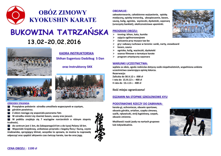 OBÓZ ZIMOWY KYOKUSHIN KARATE BUKOWINA TATRZAŃSKA 13.02-20.02.2016 KADRA INSTRUKTORSKA Shihan Eugeniusz Dadzibug 5 Dan oraz Instruktorzy SKK OBEJMUJE: zakwaterowanie, całodzienne wyżywienie, opiekę medyczną, opiekę trenerską, ubezpieczenie, basen, saunę, kulig, ognisko, wycieczki, dyskoteki, sayonarę (uroczysty bankiet), okolicznościowe upominki. PROGRAM OBOZU: trening: kihon, kata, kumite zajęcia ogólnorozwojowe ćwiczenia przy muzyce tae-bo gry i zabawy ruchowe w terenie: sanki, narty, snowboard basen, sauna ognisko, kulig, wycieczki, dyskoteki seanse filmowe o tematyce karate program artystyczny sayonara WARUNKI UCZESTNICTWA: wpłata za obóz, zgoda rodziców-dotyczy osób niepełnoletnich, wypełniona ankieta uczestnictwa zawierająca opinię lekarza. Rezerwacja: Zaliczka do 30.X.12 r. -300 zł I rata do 15.XI.12 r. - 400 zł II rata do 15.I.13 r. - 400 zł Ilość miejsc ograniczona! EGZAMIN NA STOPNIE SZKOLENIOWE KYU OŚRODEK STASINDA Przepiękne położenie ośrodka umożliwia wypoczynek w czystym, górskim powietrzu. Z okien rozciąga się wspaniała panorama Tatr. W ośrodku mieści się również basen, sauny oraz jacuzzi. W pobliżu znajduje się 7 wyciągów narciarskich o różnym stopniu trudności, do centrum jest 1 km, do Zakopanego14 km a do Łysej Polany 10 km. Wspaniałe krajobrazy, unikatowa przyroda z bogatą florą i fauną, czyste środowisko, sprzyjający klimat, wszystko to sprawia, że można tu naprawdę odpocząć oraz spędzić aktywnie czas ćwicząc karate, tae-bo oraz jogę. CENA OBOZU : 1100 zł PODSTAWOWE RZECZY DO ZABRANIA: karate-gi, ochraniacze, obuwie sportowe, obuwie górskie, ortalion, czapka zimowa, szalik, rękawiczki, strój kąpielowy, czepek, obuwie zmienne. Możliwość nauki jazdy na nartach grupowo lub indywidualnie.