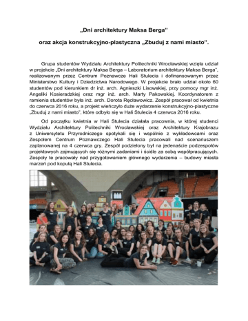 „Dni architektury Maksa Berga” oraz akcja konstrukcyjno-plastyczna „Zbuduj z nami miasto”. Grupa studentów Wydziału Architektury Politechniki Wrocławskiej wzięła udział w projekcie „Dni architektury Maksa Berga – Laboratorium architektury Maksa Berga”, realizowanym przez Centrum Poznawcze Hali Stulecia i dofinansowanym przez Ministerstwo Kultury i Dziedzictwa Narodowego. W projekcie brało udział około 60 studentów pod kierunkiem dr inż. arch. Agnieszki Lisowskiej, przy pomocy mgr inż. Angeliki Kosieradzkiej oraz mgr inż. arch. Marty Pakowskiej. Koordynatorem z ramienia studentów była inż. arch. Dorota Ręcławowicz. Zespół pracował od kwietnia do czerwca 2016 roku, a projekt wieńczyło duże wydarzenie konstrukcyjno-plastyczne „Zbuduj z nami miasto”, które odbyło się w Hali Stulecia 4 czerwca 2016 roku. Od początku kwietnia w Hali Stulecia działała pracownia, w której studenci Wydziału Architektury Politechniki Wrocławskiej oraz Architektury Krajobrazu z Uniwersytetu Przyrodniczego spotykali się i wspólnie z wykładowcami oraz Zespołem Centrum Poznawczego Hali Stulecia pracowali nad scenariuszem zaplanowanej na 4 czerwca gry. Zespół podzielony był na jedenaście podzespołów projektowych zajmujących się różnymi zadaniami i ściśle za sobą współpracujących. Zespoły te pracowały nad przygotowaniem głównego wydarzenia – budowy miasta marzeń pod kopułą Hali Stulecia. Studenci przeprowadzili badania postaci Maksa Berga, przeanalizowali jego poglądy na przestrzeń miejską oraz jego projekty i realizacje. Ponadto wgłębili się w temat modernizmu wrocławskiego oraz światowego. Musieli zastanowić się nad strukturą i rozwojem miasta, jego przenikających się struktur, zależności oraz wielowymiarowości planowania miejskich przestrzeni. Łącząc swoje wnioski z poglądami Berga przygotowali i zrealizowali plan miasta marzeń, który finalnie powstał w Hali Stulecia w skali 1:10. Stworzyli także „miejskie prawo budowlane”, określające główne zasady projektowe dla obiektów w poszczególnych dzielnicach. Zostały zaprojektowane i wykonane przykładowe budowle miejskie - ciąg kamieniczek staromiejskich. Wzorcowe obiekty stworzyły także zaproszone do współpracy koła naukowe: Studenckie Koło Naukowe Gospodarki Przestrzennej oraz nowopowstałe Koło Naukowe „Mural”. Zbudowano bramę do miasta oraz scenografię wydarzenia – obudowę strefy wykładów i wypoczynku, scenę, wieże informacyjne oraz „ściany” „Małej szkoły architektury”, w której każdy mógł zasięgnąć konsultacji dotyczących swojego projektu czy posłuchać mini wykładów o najciekawszych budowlach świata, przygotowanych również przez odpowiednią grupę studencką. Ważnym elementem było rozpoznanie społecznego wymiaru miasta, zależności między ludźmi, konieczności współpracy sąsiedzkiej pomiędzy „budowniczymi”, tego, że miasto to nie tyko budynki, ale przed wszystkim ludzie, którzy w nim mieszkają, pracują, którzy go tworzą. Grupa studencka przygotowała reguły gry dla uczestników mające ich zmobilizować do nawiązywania bliższych relacji z innymi,, pomocy sąsiedzkiej i podejmowania wspólnych inicjatyw. Zadania były tak ułożone, że „budowniczowie” musieli dostosować się do już zastanych obiektów, ale także dokończyć, te nieukończone, czy „wyremontować” lub przebudować uszkodzone, dostosowując swoje koncepcje do pomysłów poprzedników. Ponadto od początku trwania projektu studenci przygotowali, prowadzili i stale koordynowali fanpage oraz wydarzenia na facebooku. Publikowali posty, nagrywali filmiki, organizowali konkursy w mediach społecznościowych. Opracowali wszelkie materiały graficzne, tj.: ulotki, karty do gry, mapy, plakaty informacyjne na wydarzenia, szyldy, oraz banery, piktogramy, dyplomy, oraz inne materiały potrzebne w przeprowadzeniu projektu i organizacji gry. Jedna z grup zajmowała się pozyskiwaniem materiałów do budowy miasta. Osobna grupa przygotowała i przeprowadziła w ramach projektu cykl warsztatów przygotowujących do budowy miasta marzeń dla młodzieży i seniorów. Kolejna opracowała i zorganizowała grę rodzinną na terenie Hali Stulecia oraz na obszarze wokół, zapoznającą uczestników z samym obiektem, postacią Maksa Berga oraz jego architekturą. Przewidziano dwa warianty gry: łatwiejszy, dla rodzin z dziećmi, rozgrywał się w budynku Hali Stulecia oraz trudniejszy o dłuższym dystansie do pokonania, gdzie na odkrycie czekały tajemnice wrocławskich Terenów Wystawowych, osiedla WuWa oraz innych, znajdujących się w sąsiedztwie Hali Stulecia obiektów. Nie zabrakło emocjonujących zadań, jak np. pokonanie wielkiego labiryntu, który powstał dla graczy w kuluarach Hali Stulecia. 4 czerwca w Hali Stulecia odbył się finał projektu - akcja „Zbuduj z nami miasto!” mająca charakter gry opartej na scenariuszu, włączającym elementy wiedzy o architekturze oraz mieście, jako złożonym organizmie zarówno przestrzennokrajobrazowym jak i kulturowo-społecznym. Projekt realizował ideę Maksa Berga, by Hala Stulecia pełniła rolę „katedry demokracji”, jednoczącej pod swoim dachem ludzi w różnym wieku – od „maluchów” w wózkach, aż po seniorów, którzy wspólnie zaangażowali się w wielkie wydarzenie konstrukcyjno -artystyczne. W dniu imprezy mierząca ponad 2000 m2 płyta Hali Stulecia zamieniła się w gigantyczną mapę miasta, inspirowanego projektami Maksa Berga i opracowaną przez studentów architektury. Każdy z uczestników zabawy losował działkę lub kwartał, gdzie następnie budował budynek według własnego projektu, konsultowanego w „szkole projektowej”, z materiałów plastycznych wydawanych przez Magazyn Materiałów Budowlanych. Jednym z wydarzeń towarzyszących były wykłady specjalnych gości – architektów, deweloperów, projektantów oraz naukowców, którzy