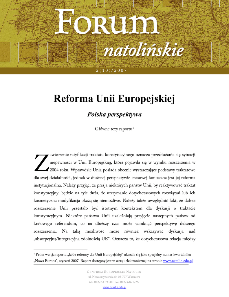 1 2(10)/2007 Reforma Unii Europejskiej Polska perspektywa Główne tezy raportu 1 Z awieszenie ratyfikacji traktatu konstytucyjnego oznacza przedłużanie się sytuacji niepewności w Unii Europejskiej, która pojawiła się w wyniku rozszerzenia w 2004 roku. Wprawdzie Unia posiada obecnie wystarczające podstawy traktatowe dla swej działalności, jednak w dłuższej perspektywie czasowej konieczna jest jej reforma instytucjonalna. Należy przyjąć, że presja niektórych państw Unii, by reaktywować traktat konstytucyjny, będzie na tyle duża, że utrzymanie dotychczasowych rozwiązań lub ich kosmetyczna modyfikacja okażą się niemożliwe. Należy także uwzględnić fakt, że dalsze rozszerzenie Unii przestało być istotnym kontekstem dla dyskusji o traktacie konstytucyjnym. Niektóre państwa Unii uzależniają przyjęcie następnych państw od krajowego referendum, co na dłuższy czas może zamknąć perspektywę dalszego rozszerzenia. Na taką możliwość może również wskazywać dyskusja nad „absorpcyjną/integracyjną zdolnością UE”. Oznacza to, że dotychczasowa relacja między 1 Pełna wersja raportu „Jakie reformy dla Unii Europejskiej” ukazała się jako specjalny numer kwartalnika „Nowa Europa”, styczeń 2007. Raport dostępny jest w wersji elektronicznej na stronie www.natolin.edu.pl CENTRUM EUROPEJSKIE NATOLIN ul. Nowoursynowska 84 02-797 Warszawa tel: 48 22 54 59 800· fax: 48 22 646 12 99 www.natolin.edu.pl 2 rozszerzeniem i pogłębieniem Unii, która stanowiła główną oś debat przed 2004 rokiem, przestała być wyznacznikiem dla dyskusji nad traktatem konstytucyjnym. Nie tylko reformy instytucjonalne zdecydują o kształcie Unii; w dużej mierze zdecyduje o tym również przegląd unijnego budżetu oraz polityk, które są finansowane z niego. Trzeba pamiętać, że debata nad dalszym losem traktatu może zbiec się w 2008/2009 roku ze średnioterminowym przeglądem budżetu Unii. Dlatego kwestie budżetowe będą determinować do pewnego stopnia stanowiska w debacie konstytucyjnej, tym bardziej że przygotowanie do przeglądu budżetu już się rozpoczęły zarówno w krajach członkowskich jak i w Komisji Europejskiej. Dla Polski, która jest beneficjentem tzw. starych polityk Unii (tj. polityka rolna i spójności) przegląd o takim charakterze będzie szczególnie ważny. W tej sytuacji priorytetem Polski powinno być podjęcie próby rozwiązania jednego, zasadniczego problemu – sposobu podejmowania decyzji w Radzie. Można także podjąć dyskusję nad uściśleniem pewnych reform, jak relacja między Komisją i Parlamentem, rola Ministra Spraw Zagranicznych czy szersza definicja klauzuli solidarności. I. Postawy społeczne w Polsce wobec idei eurokonstytucji Polacy w większości pozytywnie podchodzą do idei europejskiej konstytucji, którą rozumieją jako jednolitą i trwałą podstawę prawną dla funkcjonowania rozszerzonej Unii Europejskiej (68%). Trudno jednak uznać to poparcie za równoznaczne z poparcie dla traktatu konstytucyjnego, którego treść Polacy znają bardzo słabo. Podobnie jak obywatele innych krajów członkowskich Polacy umiarkowanie interesują się problemem reformy unijnych instytucji (czyli pierwszą częścią traktatu konstytucyjnego). O wiele więcej uwagi przyciągają sprawy związane z konkretnymi politykami Unii i ich dalszą ewolucją – np: subwencje, bezpieczeństwo, energetyka, migracje, ekologia, walka z bezrobociem, etc. CENTRUM EUROPEJSKIE NATOLIN ul. Nowoursynowska 84 02-797 Warszawa tel: 48 22 54 59 800· fax: 48 22 646 12 99 www.natolin.edu.pl 3 Polacy zgadzają się z postulatem usprawnienia struktur organizujących współpracę państw Unii, z drugiej jednak strony obawiają się osłabienia niezależności Polski i dominacji silniejszych państw. Zapewne dlatego wśród propozycji zmian instytucjonalnych zawartych w traktacie najmniej entuzjazmu w Polsce budzi propozycja zmniejszenia liczby komisarzy, powołanie Ministra Spraw Zagranicznych oraz Przewodniczącego Rady Europejskiej. Oceniając perspektywy rozwiązania kwestii traktatu konstytucyjnego Polacy są w większości umiarkowani i nastawieni koncyliacyjnie – każda ze stron powinna trochę ustąpić (60%). Uważają także, że nie należy spowalniać dotychczasowego tempa integracji (56%). Zapewne to umiarkowane stanowisko sprawia, że w większości Polacy oczekują, iż przy dalszych trudnościach z ratyfikacją traktatu należy ponownie usiąść do stołu negocjacyjnego, by uzgodnić nowy tekst eurokonstytucji (44% za, 22% przeciw). W przypadku rozpisania w Polsce referendum w sprawie obecnego traktatu konstytucyjnego należy założyć, że bardzo trudno będzie zmobilizować wyborców tak, aby uczestnictwo w referendum przekroczyło wymagane 50%. Nie jest też wcale rozstrzygnięte, czy liczba zwolenników traktatu byłaby większa od jego przeciwników. > Więcej na ten temat zob. Tomasz Żukowski, „Jak traktujemy eurotraktat? Sondaże opinii o stosunku Polaków do eurotraktatu” – specjalny numer „Nowej Europy” http://www.natolin.edu.pl/publikacje_ne.html II. Możliwe scenariusze rozwiązywania problemu traktatu konstytucyjnego W obecnej sytuacja za nierealistyczne należy uznać przyjęcie traktatu konstytucyjnego w formie zaakceptowanej w 2004 roku. Możliwość przyjęcia traktatu przez część państw członkowskich i stworzenie bardziej ścisłego kręgu integracji w mniejszym gronie także należy uznać za mało prawdopodobną. W grę wchodzą trzy scenariusze. Pierwszy scenariusz zakłada opracowanie mini traktatu, który de facto byłby bardzo zbliżony do pierwszej części traktatu konstytucyjnego, a więc również zawierałby niekorzystne dla Polski rozwiązania instytucjonalne dotyczące podziału głosów w Radzie. Mini traktat nie posiadałby prawdopodobnie preambuły, CENTRUM EUROPEJSKIE NATOLIN ul. Nowoursynowska 84 02-797 Warszawa tel: 48 22 54 59 800· fax: 48 22 646 12 99 www.nato