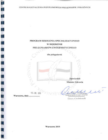 CENTRUM KSZTAŁCENIA PODYPLOMOWEGO PIELĘGNIAREK I POŁOŻNYCH PROGRAM PRZYGOTOWANY PRZEZ ZESPÓŁ PROGRAMOWY W SKŁADZIE1 1. dr n. biol. Dorota Talarska – Przewodnicząca Zespołu; Pracownia Pielęgniarstwa Społecznego Wydział Nauk o Zdrowiu, Uniwersytet Medyczny im. Karola Marcinkowskiego w Poznaniu 2. dr n. med. Bożena Baczewska – Katedra Interny z Zakładem Pielęgniarstwa Internistycznego Wydział Nauk o Zdrowiu, Uniwersytet Medyczny w Lublinie 3. dr n. med. Beata Kropornicka – Katedra Interny z Zakładem Pielęgniarstwa Internistycznego Wydział Nauk o Zdrowiu, Uniwersytet Medyczny w Lublinie 4. lek. med. Andrzej Kucia – Klinika Chorób Wewnętrznych Szpital Wojskowy w Krakowie Osoby współpracujące: 1. dr hab. n. zdr. Barbara Ślusarska – Katedra Onkologii i Środowiskowej Opieki Zdrowotnej Wydział Nauk o Zdrowiu, Uniwersytet Medyczny w Lublinie (Moduł II) 2. dr n. med. Izabella Uchmanowicz – Zakład Pielęgniarstwa Internistycznego, Katedra Pielęgniarstwa Klinicznego Wydział Nauk o Zdrowiu, Uniwersytet Medyczny im. Piastów Śląskich we Wrocławiu (Moduł II) 3. dr n. med. Grażyna Kobus – Zakład Medycyny Klinicznej Wydział Nauk o Zdrowiu, Uniwersytet Medyczny w Białymstoku (Moduł V) 4. mgr Krystyna Reperowska – Klinika Nefrologii, Transplantacji Nerek i Nadciśnienia Tętniczego, Instytut ”Pomnik – Centrum Zdrowia Dziecka” w Warszawie (Moduł V) 5. dr n. med. Beata Hornik – Zakład Pielęgniarstwa Internistycznego Katedra Chorób Wewnętrznych Wydział Nauk o Zdrowiu, Śląski Uniwersytet Medyczny w Katowicach (Moduł VI) 6. mgr Anna Ignaczak – Oddział Kliniczny Diabetologii i Gastroenterologii Ogólnej i Onkologicznej Uniwersytecki Szpital Kliniczny nr 1 im. N. Barlickiego w Łodzi; Katedra Nauczania Pielęgniarstwa, Zakład Nauczania Pielęgniarstwa z Pracowniami Praktycznymi, Uniwersytet Medyczny w Łodzi (Moduł VI) 7. dr n. med. Regina Lorencowicz – Katedra i Zakład Pielęgniarstwa Neurologicznego Wydział Nauk o Zdrowiu, Uniwersytet Medyczny w Lublinie (Moduł IX) 8. dr n. med. Katarzyna Snarska – Zakład Medycyny Klinicznej Wydział Nauk o Zdrowiu, Uniwersytet Medyczny w Białymstoku (Moduł IX) RECENZENCI PROGRAMU 1. dr n. med. Teresa Gabryś – Specjalistyczny Gabinet Rehabilitacji Medycznej w Krakowie; Zakład Pielęgniarstwa Internistycznego i Środowiskowego, Instytut Pielęgniarstwa i Położnictwa Wydział Nauk o Zdrowiu, Uniwersytet Jagielloński Collegium Medicum 2. dr n. med. Marek Stopiński – Konsultant Wojewódzki w dziedzinie chorób wewnętrznych Samodzielny Publiczny Specjalistyczny Szpital Zachodni im. Jana Pawła II w Grodzisku Mazowieckim 1 Powołany Zarządzeniem Dyrektora Centrum Kształcenia Podyplomowego Pielęgniarek i Położnych Nr 70/13 z dnia 20 listopada 2013 r. w sprawie powołania Zespołu do spraw Opracowania Programu Kształcenia Podyplomowego Pielęgniarek i Położnych. str. 2 CENTRUM KSZTAŁCENIA PODYPLOMOWEGO PIELĘGNIAREK I POŁOŻNYCH PROGRAM MODUŁU I PRZYGOTOWANY PRZEZ ZESPÓŁ PROGRAMOWY W SKŁADZIE2: 1. dr n. med. Grażyna Rogala-Pawelczyk – Przewodnicząca Zespołu; Katedra 2. 3. 4. 5. 6. 7. 8. i Zakład Zarządzania w Pielęgniarstwie, Uniwersytet Medyczny w Lublinie; Prezes Naczelnej Rady Pielęgniarek i Położnych dr n. med. Anita Gębska-Kuczerowska – Studium Zdrowia Publicznego, Narodowy Instytut Zdrowia Publicznego – Państwowy Zakład Higieny w Warszawie mgr Jadwiga Klukow – Katedra i Zakład Zarządzania w Pielęgniarstwie, Uniwersytet Medyczny w Lublinie mgr piel. Izabela Kucharska – Departament Zapobiegania oraz Zwalczania Zakażeń i Chorób Zakaźnych u Ludzi, Główny Inspektorat Sanitarny w Warszawie mgr Teresa Kuziara – Komisja Nauki, Kształcenia i Rozwoju Zawodowego, Naczelna Izba Pielęgniarek i Położnych, Wiceprezes Naczelnej Rady Pielęgniarek i Położnych prof. nadzw. dr hab. n. hum. Ewa Wilczek-Rużyczka – Katedra Psychologii Zdrowia, Krakowska Akademia im. Andrzeja Frycza Modrzewskiego w Krakowie dr Beata Witkowska-Maksimczuk – Zakład Filozofii, Wydział Administracji i Nauk Społecznych Politechniki Warszawskiej dr n. o zdr. Grażyna Wójcik – Zakład Pielęgniarstwa Społecznego, Wydział Nauki o Zdrowiu, Warszawski Uniwersytet Medyczny Prezes Polskiego Towarzystwa Pielęgniarskiego RECENZENT PROGRAMU dr hab. n. hum. Maria Kózka, prof. UJ – Konsultant Krajowy w dziedzinie pielęgniarstwa, Zakład Pielęgniarstwa Klinicznego, Instytut Pielęgniarstwa i Położnictwa Wydział Nauk o Zdrowiu, Uniwersytet Jagielloński Collegium Medicum 2 Powołany Zarządzeniem Dyrektora Centrum Kształcenia Podyplomowego Pielęgniarek i Położnych Nr 60/13 z dnia 12 listopada 2013 r. w sprawie powołania Zespołu do spraw Opracowania Programu Kształcenia Podyplomowego Pielęgniarek i Położnych. str. 3 CENTRUM KSZTAŁCENIA PODYPLOMOWEGO PIELĘGNIAREK I POŁOŻNYCH 1. ZAŁOŻENIA ORGANIZACYJNO-PROGRAMOWE Rodzaj kształcenia Szkolenie specjalizacyjne jest to rodzaj kształcenia, który zgodnie z ustawą z dnia 15 lipca 2011r. o zawodach pielęgniarki i położnej (Dz. U. z 2014 r., poz. 1435, z późn. zm.) ma na celu uzyskanie przez pielęgniarkę lub położną specjalistycznej wiedzy i umiejętności w określonej dziedzinie pielęgniarstwa lub dziedzinie mającej zastosowanie w ochronie zdrowia oraz tytułu specjalisty w tej dziedzinie. Efekty kształcenia wskazane w programie szkolenia specjalizacyjnego w dziedzinie pielęgniarstwa internistycznego, dla pielęgniarek są dla organizatora i uczestnika kształcenia obowiązkowym elementem programu. Osiągnięcie wskazanych efektów kształcenia gwarantuje, że każdy uczestnik szkolenia specjalizacyjnego będzie posiadać takie same kwalifikacje, niezależnie od miejsca ukończenia kształcenia, podmiotu organizującego kształcenie oraz systemu kształcenia. Cel kształcenia Celem kształcenia jest aktualizowanie wiedzy i umiejętności dotyczących pielęgniarstwa internistycznego. Uzyskanie t