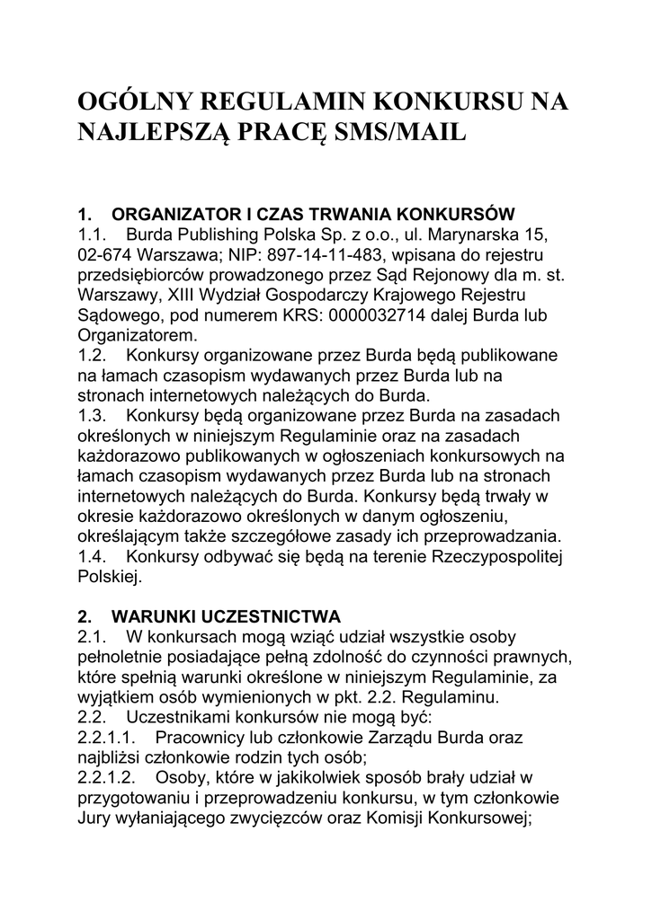 OGÓLNY REGULAMIN KONKURSU NA NAJLEPSZĄ PRACĘ SMS/MAIL 1. ORGANIZATOR I CZAS TRWANIA KONKURSÓW 1.1. Burda Publishing Polska Sp. z o.o., ul. Marynarska 15, 02-674 Warszawa; NIP: 897-14-11-483, wpisana do rejestru przedsiębiorców prowadzonego przez Sąd Rejonowy dla m. st. Warszawy, XIII Wydział Gospodarczy Krajowego Rejestru Sądowego, pod numerem KRS: 0000032714 dalej Burda lub Organizatorem. 1.2. Konkursy organizowane przez Burda będą publikowane na łamach czasopism wydawanych przez Burda lub na stronach internetowych należących do Burda. 1.3. Konkursy będą organizowane przez Burda na zasadach określonych w niniejszym Regulaminie oraz na zasadach każdorazowo publikowanych w ogłoszeniach konkursowych na łamach czasopism wydawanych przez Burda lub na stronach internetowych należących do Burda. Konkursy będą trwały w okresie każdorazowo określonych w danym ogłoszeniu, określającym także szczegółowe zasady ich przeprowadzania. 1.4. Konkursy odbywać się będą na terenie Rzeczypospolitej Polskiej. 2. WARUNKI UCZESTNICTWA 2.1. W konkursach mogą wziąć udział wszystkie osoby pełnoletnie posiadające pełną zdolność do czynności prawnych, które spełnią warunki określone w niniejszym Regulaminie, za wyjątkiem osób wymienionych w pkt. 2.2. Regulaminu. 2.2. Uczestnikami konkursów nie mogą być: 2.2.1.1. Pracownicy lub członkowie Zarządu Burda oraz najbliżsi członkowie rodzin tych osób; 2.2.1.2. Osoby, które w jakikolwiek sposób brały udział w przygotowaniu i przeprowadzeniu konkursu, w tym członkowie Jury wyłaniającego zwycięzców oraz Komisji Konkursowej; 2.3. Aby wziąć udział w konkursie należy wysłać za pośrednictwem wiadomości sms/mail prawidłowe zgłoszenie wraz z odpowiedzią (pracą konkursową) na zadane w danym ogłoszeniu konkursowym zadanie/pytanie. 2.4. Treść każdego SMS-a, wysłanego przez uczestników konkursu nie może zawierać polskich znaków, tj.: ą, ę, ć, ł, ń, ó, ś, ż, ź, dź, dż. 2.5. Całe zgłoszenie sms/mail powinno zawierać do 160 znaków. 2.6. Wiadomości SMS/mail związane z konkursem będą odbierane przez automatyczny system, który określa datę odbioru wiadomości w formacie SMS/mail przez wskazanie czasu według zegara Burda. Dane zarejestrowane przez automatyczny system odbioru są rozstrzygające dla ustalenia Danych Osobowych i ich przypisania do poszczególnych numerów komórkowych. 2.7. Uczestnicy mogą wysłać dowolną ilość SMS-ów/maili, przy czym jeden SMS/mail będzie traktowany jako jedno zgłoszenie w konkursie. Każdy uczestnik może wygrać maksymalnie jedną nagrodę. 2.8. Osoby, które spełnią wszystkie warunki określone w Regulaminie oraz w treści danego ogłoszenia konkursowego i wyślą zgłoszenie SMS/mail o prawidłowej treści, wezmą udział w konkursie. 3. PRZYSTĄPIENIE DO KONKURSU 3.1. Każda z osób (poza wymienionymi w pkt. 2.2 powyżej) może wziąć udział w konkursie poprzez wysłanie w okresie trwania konkursu wiadomości SMS/mail, o treści każdorazowo wskazanej w ogłoszeniu o konkursie pod numer wskazany w treści ogłoszenia. 3.2. Poszczególnym konkursom publikowanym w każdym z czasopism wydawanych przez Burda i/lub na stronach internetowych, których właścicielem jest Burda, będą przypisane różne treści wiadomości SMS/mail, każdorazowo wskazane w ogłoszeniu konkursowym. 3.3. Koszt wysłania jednego SMS-a pod numer, który określony jest w ogłoszeniu, wskazany będzie w tym samym ogłoszeniu, np. dla numeru 72550 to 2zł netto (2,46 zł brutto) we wszystkich polskich sieciach telefonii komórkowej. Podmiotem realizującym dodatkowe świadczenie będzie każdorazowo wskazany podmiot w danym ogłoszeniu konkursowym. 3.4. Przez wysłanie SMS-a/maila pod numer wskazany w punkcie 3.1 powyżej uczestnik akceptuje treść Regulaminu oraz warunki konkursu opublikowane w treści ogłoszenia konkursu i zobowiązuje się stosować warunki i zasady określone w w/w ogłoszeniu oraz w Regulaminie dla przeprowadzenia konkursu, którego niniejszy Regulamin dotyczy. 3.5. Po zakończeniu każdego z konkursu specjalnie powołane Jury, w skład którego wejdą przedstawiciele Organizatora, wyłoni laureatów danego konkursu biorąc pod uwagę wymogi określone w niniejszym Regulaminie oraz w zgłoszeniu konkursowym, w tym oryginalność, wyjątkowość, kreatywność, ciekawość oraz poprawność językową i merytoryczną odpowiedzi na zadanie konkursowe. 3.6. Zgłoszenia konkursowe niepełne lub nieprawidłowo wypełnione nie będą brały udziału w konkursie. 3.7. Organizator nie ponosi odpowiedzialności za brak możliwości dokonania zgłoszenia spowodowany przez operatora sieci komórkowej. 3.8. Organizator skontaktuje się ze zwycięzcami telefonicznie na numer, z którego dokonano zgłoszenia do konkursu, lub mailowo, na adres mailowy z którego przysłano zgłoszenie, z informacją o wygranej do 60 dni od zakończeniu trwania danego konkursu, w celu otrzymania od uczestników danych osobowych i teleadresowych, które będą przetwarzane wyłącznie w zakresie określonym w pkt. 7.3 poniżej. 3.9. W przypadku, gdy Organizator nie będzie się mógł skontaktować z potencjalnym laureatem po wykonaniu 3 próbnych połączeń w odstępach 15 min. lub zwycięzca nie zgłosi się do Organizatora w wyznaczonym w treści SMS/maila terminie, nagroda przechodzi na kolejnego potencjalnego laureata. W przypadku trzykrotnego nie powodzenia ww. procedury nagroda przechodzi na własność Organizatora. 3.10. Wyniki konkursu, w tym imiona i nazwiska laureatów i/lub miejscowość zamieszkania, mogą zostać opublikowane przez Organizatora w czasopiśmie i/lub na stronie internetowej, w których zamieszczono ogłoszenie konkursowe, w terminie do 60 dni od zakończenia danego konkursu. 3.11. Regulamin oraz ogłoszenie o konkursie są jedynymi dokumentami określającymi zasady konkursów, chyba, że wprost z Regulaminu lub ogłoszenia konkursowego