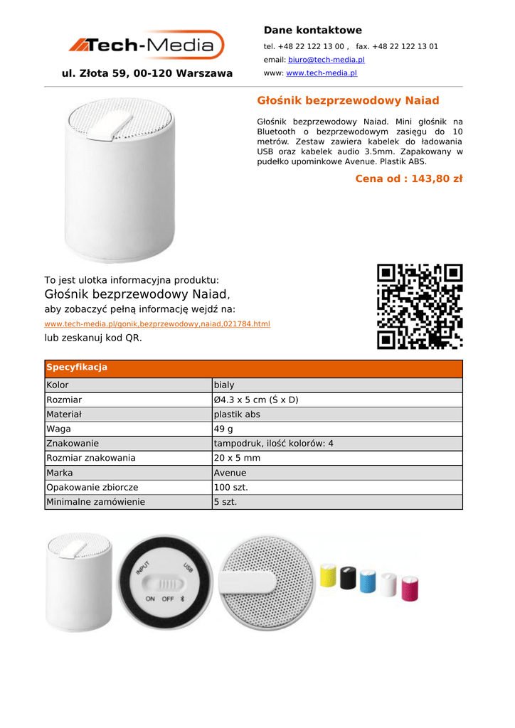 Dane kontaktowe tel. +48 22 122 13 00 , fax. +48 22 122 13 01 email: [email protected] ul. Złota 59, 00-120 Warszawa www: www.tech-media.pl Głośnik bezprzewodowy Naiad Głośnik bezprzewodowy Naiad. Mini głośnik na Bluetooth o bezprzewodowym zasięgu do 10 metrów. Zestaw zawiera kabelek do ładowania USB oraz kabelek audio 3.5mm. Zapakowany w pudełko upominkowe Avenue. Plastik ABS. Cena od : 143,80 zł To jest ulotka informacyjna produktu: Głośnik bezprzewodowy Naiad , aby zobaczyć pełną informację wejdź na: www.tech-media.pl/gonik,bezprzewodowy,naiad,021784.html lub zeskanuj kod QR. Specyfikacja Kolor bialy Rozmiar Ø4.3 x 5 cm (Ś x D) Materiał plastik abs Waga 49 g Znakowanie tampodruk, ilość kolorów: 4 Rozmiar znakowania 20 x 5 mm Marka Avenue Opakowanie zbiorcze 100 szt. Minimalne zamówienie 5 szt.