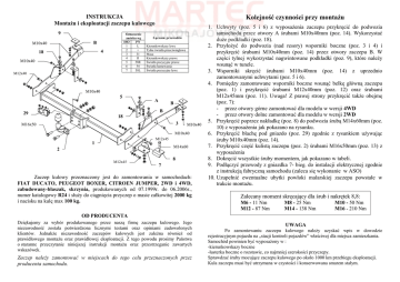 INSTRUKCJA MontaŜu i eksploatacji zaczepu kulowego 9 Oznaczenie zacisku wg ISO PN 1 L 2 + 3 31 4 R 5 58R 6 54 7 58L B M10x40 4 18 M10x40 M12x40 Kolejność czynności przy montaŜu Łączenie przewodów Kierunkowskazy lewe Tylne światła przeciwmgłowe Masa Kierunkowskazy prawe Światła pozycyjne prawe Światła hamowania Światła pozycyjne lewe M10x40 5 A B B 29 18 3 M16x50 M10x40 M10x40 M12x45 1 M14x60 2 M12x45 8 7 Zaczep kulowy przeznaczony jest do zamontowania w samochodach: FIAT DUCATO, PEUGEOT BOXER, CITROEN JUMPER, 2WD i 4WD, zabudowany-blaszak, skrzynia, produkowanych od 07.1999r. do 06.2006r., numer katalogowy R24 i słuŜy do ciągnięcia przyczep o masie całkowitej 2000 kg i nacisku na kulę max 100 kg. 1. Uchwyty (poz. 5 i 6) z wyposaŜenia zaczepu przykręcić do podwozia samochodu przez otwory A śrubami M10x40mm (poz. 14). Wykorzystać duŜe podkładki (poz. 18). 2. PrzyłoŜyć do podwozia (nad resory) wsporniki boczne (poz. 3 i 4) i przykręcić śrubami M10x40mm (poz. 14) przez otwory zaczepu B. W części tylnej wykorzystać nagwintowane podkładki (poz. 9), które naleŜy wsunąć w tunele. 3. Wsporniki skręcić śrubami M10x40mm (poz. 14) z uprzednio zamontowanymi uchwytami (poz. 5 i 6). 4. Pomiędzy zamontowane wsporniki boczne wsunąć belkę główną zaczepu (poz. 1) i przykręcić śrubami M12x40mm (poz. 12) oraz śrubami M12x45mm (poz. 11). Uwaga! Z prawej strony przykręcić takŜe obejmę (poz. 7): - przez otwory górne zamontować dla modelu w wersji 4WD - przez otwory dolne zamontować dla modelu w wersji 2WD 5. Przykręcić poprzez nakładkę (poz. 8) do podwozia śrubą M14x60mm (poz. 10) z wyposaŜenia jak pokazano na rysunku. 6. Przykręcić blachę pod gniazdo (poz. 29) zgodnie z rysunkiem uŜywając śruby M10x40mm (poz. 14). 7. Przykręcić część kulistą zaczepu (poz. 2) śrubami M16x50mm (poz. 13) z wyposaŜenia 8. Dokręcić wszystkie śruby momentem, jak pokazano w tabeli. 9. Podłączyć przewody z gniazdka 7- bieg. do instalacji elektrycznej zgodnie z instrukcją fabryczną samochodu (zaleca się wykonanie w ASO) 10. Uzupełnić ewentualne ubytki powłoki malarskiej zaczepu powstałe w trakcie montaŜu. Zalecany moment skręcający dla śrub i nakrętek 8,8: M6 - 11 Nm M12 - 87 Nm M8 - 25 Nm M14 - 138 Nm M10 - 50 Nm M16 - 210 Nm OD PRODUCENTA Dziękujemy za wybór produkowanego przez naszą firmę zaczepu kulowego. Jego niezawodność została potwierdzona licznymi testami oraz opiniami zadowolonych klientów. JednakŜe niezawodność zaczepów kulowych jest zaleŜna równieŜ od prawidłowego montaŜu oraz prawidłowej eksploatacji. Z tego powodu prosimy Państwa o staranne przeczytanie niniejszej instrukcji montaŜu oraz przestrzeganie zawartych wskazówek. Zaczep naleŜy zamontować w miejscach do tego celu przeznaczonych przez producenta samochodu. UWAGA Po zamontowaniu zaczepu kulowego naleŜy uzyskać wpis w dowodzie rejestracyjnym pojazdu na „stacji kontroli pojazdów” właściwej dla miejsca zamieszkania. Samochód powinien być wyposaŜony w : -kierunkowskazy boczne -lusterka boczne o rozstawie, co najmniej szerokości przyczepy. Sprawdzać śruby mocujące zaczepu kulowego po około 1000 km przebiegu eksploatacji. Kula zaczepu musi być utrzymana w czystości i konserwowana smarem stałym. PPUH AUTO-HAK S.J. WyposaŜenie zaczepu: Produkcja Haków Holowniczych Henryk & Zbigniew Nejman 76-200 SŁUPSK ul. Słoneczna 16K tel/fax (059) 8-414-414; 8-414-413 E-mail: [email protected] www. autohak.com.pl Zaczep kulowy bez wyposaŜenia elektrycznego Klasa: A50-X Nr kat. R24 Przeznaczony do zamontowania w samochodach: Dane techniczne: Wartość siły D : 12,48 kN maksymalna masa przyczepy: 2000 kg maksymalny nacisk na kulę: 100 kg FIAT DUCATO, PEUGEOT BOXER CITROEN JUMPER Typ: 2WD i 4WD, zabudowany-blaszak, skrzynia produkowanych od 07.1999r. do 06.2006r. Numer homologacji zgodnie z wytycznymi regulaminu EKG/ONZ 55.01: E20-55R-01 1026 KARTA GWARANCYJNA Producent udziela gwarancji niniejszą kartą gwarancyjną na okres 24 miesięcy licząc od dnia zakupu zaczepu kulowego do samochodu: FIAT DUCATO, PEUGEOT BOXER CITROEN JUMPER 2WD i 4WD, zabudowany-blaszak, skrzynia produkowanych od 07.1999r. do 06.2006r. Data produkcji .............................. Data zakupu....................................... Zakres gwarancji obejmuje wyłącznie wady jakościowe wynikające z winy producenta. Gwarancja nie obejmuje natomiast uszkodzeń zawinionych przez nabywcę, wynikających z niewłaściwego montaŜu, uŜytkowania lub konserwacji, uszkodzeń mechanicznych, normalnego zuŜycia podczas eksploatacji itp. Gwarancja udzielona na zakupiony towar nie wyłącza, nie ogranicza ani nie zawiesza uprawnień kupującego wynikających z niezgodności towaru z umową. Reklamacje naleŜy zgłaszać w punkcie sprzedaŜy, składając jednocześnie kartę gwarancyjną. Usunięcie "wady" następuje po stwierdzeniu przez punkt sprzedaŜy wspólnie z producentem słuszności złoŜonej reklamacji. Reklamacja powinna być załatwiona w ciągu 14 dni od dnia uznania reklamacji. Karta gwarancyjna jest niewaŜna jeŜeli nie jest wypełniona i podpisana. Data zgłoszenia reklamacji: ................................................................... INFORMACJA WSTĘPNA Zaczep kulowy jest skonstruowany zgodnie z zasadami bezpieczeństwa ruchu drogowego. Zaczep kulowy jest elementem wpływającym na bezpieczeństwo jazdy i moŜe zostać zainstalowany wyłącznie przez personel wyspecjalizowany. Niedopuszczalne jest dokonywanie jakichkolwiek zmian w konstrukcji zaczepu. Powoduje to wygaśniecie dopuszczenia do stosowania. W przypadku obecności masy izolacyjnej lub osłony podwozia w miejscu przylegania zaczepu, naleŜy ją usunąć. Nieosłonięte miejsca karoserii oraz wywiercone otwory naleŜy pomalować farbą antykorozyjną. Informacjami wiąŜącymi odnośnie wartości obciąŜeń są dane podawane przez producenta samochodu, względnie wartości maksymalnej m