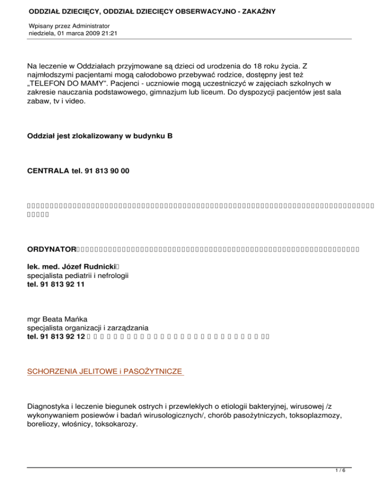 ODDZIAŁ DZIECIĘCY, ODDZIAŁ DZIECIĘCY OBSERWACYJNO - ZAKAŹNY Wpisany przez Administrator niedziela, 01 marca 2009 21:21 Na leczenie w Oddziałach przyjmowane są dzieci od urodzenia do 18 roku życia. Z najmłodszymi pacjentami mogą całodobowo przebywać rodzice, dostępny jest też „TELEFON DO MAMY”. Pacjenci - uczniowie mogą uczestniczyć w zajęciach szkolnych w zakresie nauczania podstawowego, gimnazjum lub liceum. Do dyspozycji pacjentów jest sala zabaw, tv i video. Oddział jest zlokalizowany w budynku B CENTRALA tel. 91 813 90 00 ORDYNATOR lek. med. Józef Rudnicki specjalista pediatrii i nefrologii tel. 91 813 92 11 mgr Beata Mańka specjalista organizacji i zarządzania tel. 91 813 92 12 SCHORZENIA JELITOWE i PASOŻYTNICZE Diagnostyka i leczenie biegunek ostrych i przewlekłych o etiologii bakteryjnej, wirusowej /z wykonywaniem posiewów i badań wirusologicznych/, chorób pasożytniczych, toksoplazmozy, boreliozy, włośnicy, toksokarozy. 1/6 ODDZIAŁ DZIECIĘCY, ODDZIAŁ DZIECIĘCY OBSERWACYJNO - ZAKAŹNY Wpisany przez Administrator niedziela, 01 marca 2009 21:21 GABINET LEKARSKI tel. 91 813 92 15 lek. med. Krystyna Piusińska - Zbyszyńska specjalista pediatrii lek. med. Agata Gidzgier specjalista pediatrii DYŻURKA PIELĘGNIAREK tel. 91 813 92 13 SCHORZENIA NEFROLOGICZNE i NEUROINFEKCJE Diagnostyka i leczenie chorób układu moczowego / moczenie monosymptomatyczne, wady, zaburzenia mikcji, zakażenia układu moczowego/. Prowadzone jest także leczenie posocznic, neuroinfekcji bakteryjnych, zakażeń wirusowych, neuroboreliozy, polineuropatii zwłaszcza Guillaine – Barre, leczenie zakażeń układu oddechowego oraz wstępna diagnostyka astmy oskrzelowej, diagnostyka niejasnych stanów gorączkowych, diagnostyka i leczenie chorób wysypkowych, monitoring zakażenia HIV u noworodków urodzonych z matek HIV (+) oraz profilaktyka zakażenia i leczenie. Istnieje możliwość pogłębionej diagnostyki obrazowej: USG serca, RTG, KT, NMR z angio CT, Angiografia cyfrowa, EEG. GABINET LEKARSKI tel. 91 813 92 16 lek. med. Józef Rudnicki specjalista pediatrii i nefrologii lek. med. Lucyna Idus specjalista pediatrii 2/6 ODDZIAŁ DZIECIĘCY, ODDZIAŁ DZIECIĘCY OBSERWACYJNO - ZAKAŹNY Wpisany przez Administrator niedziela, 01 marca 2009 21:21 DYŻURKA PIELĘGNIAREK tel. 91 813 92 14 SCHORZENIA HEPATOLOGICZNE Diagnostyka i leczenie chorób wątroby o etiologii wirusowej autoimmunologicznej, hiperbilirubinemii, cholestazy, guzów wątroby/ bąblowce / oraz biopsje wątroby / badania metodą PCR oznaczanie p/ciał p. tkankowych HBV, HCV, EBV, CMV, HSV/, leczenie Interferonem. GABINET LEKARSKI tel. 91 813 92 17 lek. med. Regina Szydłowska specjalista pediatrii lek. med. Elżbieta Głaz specjalista pediatrii lek. med. Joanna Łasecka-Zadrożna DYŻURKA PIELĘGNIAREK tel. 91 813 92 19 PORADNIE DZIECIĘCE Przy Oddziałach dziecięcych funkcjonują Poradnie i Gabinety konsultacyjne, w których przyjmują pacjentów lekarze z oddziałów szpitalnych. Do Poradni wymagane jest skierowanie od lekarza POZ /rodzinnego/, opieką są objęci chorzy od noworodka do 18 lat. Wysoką jakość usług medycznych gwarantują specjaliści o sprawdzonych umiejętnościach fachowych i doświadczeniu zawodowym. 3/6 ODDZIAŁ DZIECIĘCY, ODDZIAŁ DZIECIĘCY OBSERWACYJNO - ZAKAŹNY Wpisany przez Administrator niedziela, 01 marca 2009 21:21 REJESTRACJA tel. 91 813 92 08 PORADNIA HEPATOLOGICZNA Porady w zakresie chorób wątroby od noworodka do 18 lat, leczenie Interferonem i innymi lekami przeciwwirusowymi, przygotowanie pacjentów do przeszczepu wątroby i opieka po przeszczepie. *wtorek, godz. 8.30 – 12.00 lek. med. Elżbieta Głaz *środa, godz. 8.30 – 12.00 lek. med. Józef Rudnicki PORADNIA NEFROLOGICZNA *wtorek, godz. 12.00 – 14.00 lek. med. Józef Rudnicki PORADNIA PARAZYTOLOGICZNA *poniedziałek, godz. 11.00 – 14.00 lek. med. Agata Gidzgier *czwartek, godz. 11.00 – 14.00 lek. med. Krystyna Piusińska - Zbyszyńska GABINET KONSULTACYJNY d/s NABYTYCH NIEDOBORÓW IMMUNOLOGICZNYCH Monitorowanie zakażeń noworodków urodzonych z matek HIV(+), monitorowanie dzieci narażonych na zakażenia HIV /przypadkowe zakłucia igłą/, dzieci zakażone HIV/AIDS WIZYTY W GABINECIE PO UZGODNIENIU Z LEKARZEM lek. med. Agata Gidzgier tel. 91 813 92 15 4/6 ODDZIAŁ DZIECIĘCY, ODDZIAŁ DZIECIĘCY OBSERWACYJNO - ZAKAŹNY Wpisany przez Administrator niedziela, 01 marca 2009 21:21 GABINET KONSULTACYJNY ds. SZCZEPIEŃ OCHRONNYCH *wtorek, godz. 14.00 – 18.00 lek. med. Lucyna Idus PUNKT PRZYJĘĆ DO ODDZIAŁÓW DZIECIĘCYCH - Budynek B tel. 91 813 92 01 *PRZYJĘCIA ODBYWAJĄ SIĘ PRZEZ CAŁĄ DOBĘ *PRZYJMOWANE SĄ DZIECI CHORE ZE SKIEROWANIEM ORAZ BEZ SKIEROWANIA *W PRZYPADKACH NAGŁYCH ZAGRAŻAJĄCYCH ŻYCIU DZIECKA Pielęgniarka koordynująca Ewa Żolik Uwaga! PRZENIESIENIE ODDZIAŁU KARDIOLOGII DZIECIĘCEJ ORAZ PORADNI KARDIOLOGICZNEJ DLA DZIECI Z dniem 1 października 2015 roku Oddział Kardiologii Dziecięcej oraz Poradnia Kardiologiczna dla Dzieci zostają przeniesione z Samodzielnego Publicznego Wojewódzkiego Szpitala Zespolonego przy ul. Arkońskiej 4 do Samodzielnego Publicznego Specjalistycznego Zakładu Opieki Zdrowotnej „ZDROJE” przy ul. Mącznej 4 w Szczecinie. Nowy Oddział Kardiologii Dziecięcej będzie mieścił się na parterze pawilonu nr 17, natomiast Poradnia Kardiologii Dziecięcej będzie mieściła się na parterze pawilonu 19 (wejście G) w SPS ZOZ „ZDROJE” przy ul. Mącznej 4. 5/6 ODDZIAŁ DZIECIĘCY, ODDZIAŁ DZIECIĘCY OBSERWACYJNO - ZAKAŹNY Wpisany przez Administrator niedziela, 01 marca 2009 21:21 Kontakt: 91 88 06 583 - sekretariat, 91 88 06 574 - dyżurka pielęgniarek, 91 88 06 586 - gabinet ordynatora, 91 88 06 576 - gabinet lekarski, 91 88-06-562 - poradnia kardiologiczna. 6/6