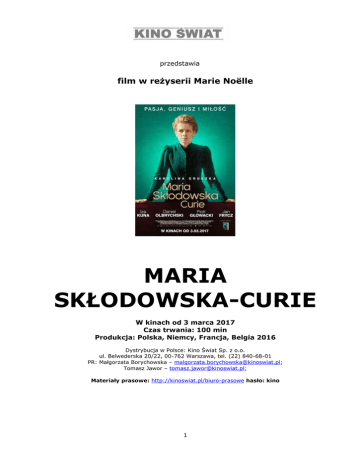 przedstawia film w reżyserii Marie Noёlle MARIA SKŁODOWSKA-CURIE W kinach od 3 marca 2017 Czas trwania: 100 min Produkcja: Polska, Niemcy, Francja, Belgia 2016 Dystrybucja w Polsce: Kino Świat Sp. z o.o. ul. Belwederska 20/22, 00-762 Warszawa, tel. (22) 840-68-01 PR: Małgorzata Borychowska – [email protected]; Tomasz Jawor – [email protected]; Materiały prasowe: http://kinoswiat.pl/biuro-prasowe hasło: kino 1 OBSADA MARIA SKŁODOWSKA-CURIE – KAROLINA GRUSZKA PIOTR CURIE – CHARLES BERLING BRONISŁAWA SKŁODOWSKA – IZA KUNA EMILE AMAGAT – DANIEL OLBRYCHSKI PAUL LANGEVIN – ARIEH WORTHALTER ALBERT EINSTEIN – PIOTR GŁOWACKI ERNEST SOLVAY – JAN FRYCZ DZIEKAN – ARTUR DZIURMAN EUGENE CURIE – ANDRE WILMS ANDRE DEBIERNE – MALIK ZIDI JEANNE LANGEVIN – MARIE DENERNAUD GUSTAVE TERY – SAMUEL FINZI AUGUST GYLDENSTOPLE – SABIN TAMBREA STUDENTKA – KLARA BIELAWKA IRENA CURIE (9 LAT) – SASHA CRAPANZANO IRENA CURIE (15 LAT) – ROSE MONTRON EWA CURIE (7 LAT) – ADELE SCHMITT EWA CURIE (2 LATA) – EMMA POKROMSKA ORAZ WENANTY NOSUL, MARIOLA BRYCHT, PAWEŁ KLESZCZ, JAKUB KOTYŃSKI, KRZYSZTOF BOCHENEK, KSAWERY SZLENKIER I INNI TWÓRCY FILMU REŻYSERIA – MARIE NOЁLLE SCENARIUSZ – MARIE NOЁLLE, ANDREA STOLL ZDJĘCIA – MICHAŁ ENGLERT SCENOGRAFIA – EDUARD KRAJEWSKI / EWA SKOCZKOWSKA MUZYKA – BRUNO COULAIS KOSTIUMY –CHRISTOPHE PIDRE, FLORENCE SCHOLTES, MAŁGORZATA ZACHARSKA MONTAŻ – LENKA FILLNEROVA, HANS HORN, MARIE NOЁLLE, ISABELLE RATHERY CHARAKTERYZACJA – WALDERMAR POKROMSKI, MIRA WOJTCZAK KIEROWNICTWO PRODUKCJI – JANUSZ B. CZECH, THOMAS ROMMEL PRODUCENT – MARIE NOЁLLE, MIKOŁAJ POKROMSKI, RALF ZIMMERMANN KOPRODUCENT – BETTINA REITZ, IZABELA HELBIN, BŁAŻEJ MODER, LOTHAR SCHUBERT, BIRGIT ROTHORL, JOSEPH VILSMAIER, SEBASTIAN SCHELENZ, OLIVIER RAUSIN, MATTHIEU CHABAUD, ANDREA SCHUBERT, BRIGITTE FAURE PRODUKCJA – POKROMSKI STUDIO, P’ARTISAN FILM DYSTRYBUCJA W POLSCE – KINO ŚWIAT 2 KRÓTKO O FILMIE „Maria Skłodowska-Curie” to wystawna, międzynarodowa koprodukcja o życiu słynnej polskiej noblistki. Historia niezwykłej kobiety, która nie wahała się iść za głosem serca, a dzięki inteligencji, wiedzy i nieprzeciętnym umiejętnościom zdołała przekonać do siebie świat nauki, od zawsze zdominowany przez mężczyzn. To również niepowtarzalna podróż w czasie do Paryża z przełomu wieków – miasta sztuki i odkryć, które zmieniały świat. W roli tytułowej w filmie wystąpiła Karolina Gruszka. Partnerują jej m.in. Iza Kuna w roli Bronisławy Skłodowskiej – siostry noblistki, Piotr Głowacki jako Albert Einstein, Jan Frycz jako Ernest Solvay – założyciel Międzynarodowego Instytutu Fizyki oraz Daniel Olbrychski jako Emile Amagat – zagorzały przeciwnik Marii. Światowa premiera filmu „Maria Skłodowska-Curie” odbyła się w ramach Międzynarodowego Festiwalu Filmowego w Toronto. W listopadzie 2016 obraz znalazł się w prestiżowym Konkursie Głównym Międzynarodowego Festiwalu Sztuki Autorów Zdjęć Filmowych – Camerimage. Natomiast 20 stycznia 2017 zastał uhonorowany najważniejszymi niemieckimi nagrodami filmowymi – Bavarian Film Awards – za najlepszą reżyserię i najlepszą scenografię. Fot. Witold Bączyk „Maria Skłodowska-Curie” to wierna faktom opowieść o niesamowitym życiu odkrywczyni dwóch pierwiastków – polonu i radu, ale także portret Skłodowskiej, jakiej nie znaliśmy – czułej matki, kochającej żony, kobiety charyzmatycznej, zdecydowanej, choć pełnej dylematów i sprzeczności. Była pierwszą kobietą, która zdobyła Nagrodę Nobla i do tej pory pozostaje jedyną kobietą wyróżnioną dwukrotnie tą nagrodą. Jako pierwsza w Europie uzyskała tytuł doktora, a w 1906 roku przyznano jej profesurę i równocześnie objęła własną katedrę na paryskiej Sorbonie, co we Francji było wydarzeniem bez precedensu. 3 Jednak droga do sławy wiodła ścieżką pełną wyzwań i wyrzeczeń. By wypełnić misję dla ludzkości, Skłodowska musiała zmierzyć się z samotnością w obcym kraju i nieoczekiwaną śmiercią męża. A także bronić swych racji w świecie naukowym zdominowanym przez mężczyzn. Z emocjonującej i pełnej zwrotów akcji batalii, wyszła jednak zwycięsko, jako osoba godna naśladowania, zasługująca na podziw i wybitna pod każdym względem. Stała się najbardziej wpływową kobietą swoich czasów. O której Albert Einstein miał powiedzieć, że ze wszystkich ludzi sukcesu, tylko ona jedna nie zmieniała się pod wpływem sławy. „Maria Skłodowska-Curie” to pierwszy tak intymny portret tej niezwykłej kobiety. Będzie to opowieść o jej smutkach i radościach, chwilach triumfu, jak i porażkach nie tylko w świecie nauki, ale przede wszystkim w jej życiu prywatnym i rodzinnym. To przez ten pryzmat chcemy ukazać nieznaną dotąd twarz naszej bohaterki. – Mikołaj Pokromski, producent filmu. Chciałabym, żeby ten film pokazał niewidoczną zza pomnikowej fasady kobietę z krwi i kości; Polkę, która musiała opuścić ukochaną ojczyznę, żeby móc poświęcić się nauce; osobę targaną sprzecznościami i dylematami, ale nigdy nietracącą z oczu celu. Moim celem jest przybliżenie widzom nieznanej do tej pory, ludzkiej twarzy tej bohaterki. Chciałabym, żebyśmy po obejrzeniu tego filmu zapamiętali Marię Skłodowską-Curie nie tylko jako kobiecą ikonę nauki, czy Polkę znaną na całym świecie, lecz przede wszystkim jako inspirującą, silną kobietą – jednostkę wybitną pod każdym względem, zasługującą na podziw i godną naśladowania. – Marie Noëlle, reżyserka. Producentem jest Pokromski Studio, firma, która ma na swoim koncie europejskie koprodukcje, m.in. polsko-niemiecki projekt „Zimowy ojciec” (2011). Koproducentami są: P’Artisan Filmproduktion (Niemcy) i Sepia Production (Francja). Projekt został dofinansowany przez Polski Instytut Sztuki Filmowej, regionalny fundusz filmowy z Krakowa: