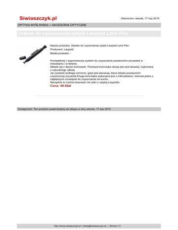Siwiaszczyk.pl Utworzono: wtorek, 17 luty 2015 OPTYKA MYŚLIWSKA > AKCESORIA OPTYCZNE Zestaw do czyszczenia optyki Leupold Lens Pen Nazwa produktu: Zestaw do czyszczenia optyki Leupold Lens Pen Producent: Leupold Model produktu: Kompaktowy i ergonomiczny system do czyszczenia powierzchni soczewek w mieszkaniu i w terenie. Składa się z dwoch końcowek. Pierwsza końcowka ukryta jest pod skuwką i wykonana z naturalnego włosia. Jej czystość podlega ochronie, gdyż jest pierwszą, ktora dotyka powierzchni czyszczonej soczewki.Druga końcowka wykonana jest z mikrowłokna i stanowi jedne z najlepszych rozwiązań do czyszczenia na sucho. Narzędzie to można stosować nie tylko z optyką Leupolda. Cena: 49.00zł Dostępność: Ten produkt został dodany do sklepu w dniu wtorek, 17 luty 2015 http://www.siwiaszczyk.pl | [email protected] | | Strona 1/1
