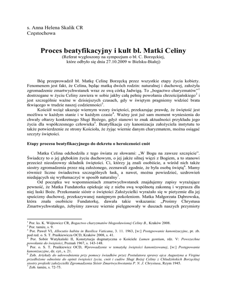 s. Anna Helena Skalik CR Częstochowa Proces beatyfikacyjny i kult bł. Matki Celiny (Referat wygłoszony na sympozjum o bł. C. Borzęckiej, które odbyło się dnia 27.10.2009 w Bielsku-Białej) Bóg przeprowadził bł. Matkę Celinę Borzęcką przez wszystkie etapy życia kobiety. Fenomenem jest fakt, że Celina, będąc matką dwóch rodzin: naturalnej i duchowej, założyła zgromadzenie zmartwychwstanek wraz ze swą córką Jadwigą. To „bogactwo charyzmatów” 1 dostrzegane w życiu Celiny zawiera w sobie jakby całą pełnię powołania chrześcijańskiego 2 i jest szczególnie ważne w dzisiejszych czasach, gdy w świętym pragniemy widzieć brata tkwiącego w trudzie naszej codzienności3. Kościół wciąż ukazuje wiernym wzory świętości, przekazując prawdę, że świętość jest możliwa w każdym stanie i w każdym czasie4. Ważny jest już sam moment wyniesienia do chwały ołtarzy konkretnego Sługi Bożego, gdyż stanowi to znak aktualności przykładu jego życia dla współczesnego człowieka5. Beatyfikacja czy kanonizacja założyciela instytutu to także potwierdzenie ze strony Kościoła, że żyjąc wiernie danym charyzmatem, można osiągać szczyty świętości. Etapy procesu beatyfikacyjnego do dekretu o heroiczności cnót Matka Celina odchodziła z tego świata ze słowami: „W Bogu na zawsze szczęście”. Świadczy to o jej głębokim życiu duchowym, o jej jakże silnej więzi z Bogiem, a to stanowi przecież nieodzowny składnik świętości. Ci, którzy ją znali osobiście, a wśród nich także siostry zgromadzenia przez nią założonego, zeznawali zgodnie, że była osobą świętą 6. Mamy również liczne świadectwa szczególnych łask, a nawet, można powiedzieć, uzdrowień niedających się wytłumaczyć w sposób naturalny7. Od początku we wspomnieniach zmartwychwstanek znajdujemy zapisy wyrażające pewność, że Matka Fundatorka opiekuje się z nieba swą wspólnotą zakonną i wyprasza dla niej łaski Boże. Przekonanie sióstr o świętości Założycielki wyrażało się w pietyzmie dla jej spuścizny duchowej, przekazywanej następnym pokoleniom. Matka Małgorzata Dąbrowska, która znała osobiście Fundatorkę, dawała takie wskazania: „Prośmy Chrystusa Zmartwychwstałego, żebyśmy zawsze wiernie pielęgnowały w duszach naszych przymioty 1 Por. ks. K. Wójtowicz CR, Bogactwo charyzmatów błogosławionej Celiny B., Kraków 2008. Por. tamże, s. 9. 3 Por. Paweł VI, Allocutio habita in Basilica Vaticana, 3. 11. 1963, [w:] Postępowanie kanonizacyjne, pr. zb. pod red. o. S. T. Praśkiewicza OCD, Kraków 2008, s. 41. 4 Por. Sobór Watykański II, Konstytucja dogmatyczna o Kościele Lumen gentium, rdz. V: Powszechne powołanie do świętości, Poznań 1967, s. 143-148. 5 Por. o. S. T. Praśkiewicz OCD, Wprowadzenie w tematykę świętości kanonizowanej, [w:] Postępowanie kanonizacyjne, dz. cyt., s. 21. 6 Zob. Artykuły do udowodnienia przy pomocy świadków przez Postulatora sprawy ojca Augustyna a Virgine przedłożone odnośnie do opinii świętości życia, cnót i cudów Sługi Bożej Celiny z Chludzińskich Borzęckiej siostry profeski założycielki Zgromadzenia Sióstr Zmartwychwstania P. N. J. Chrystusa, Rzym 1945. 7 Zob. tamże, s. 72-75. 2 2 cechujące świątobliwą naszą Matkę jako prawdziwe jej córki, a przez to przyśpieszyły chwilę jej uwielbienia, o ile to będzie wolą Bożą”8. S. Helena Kowalewska, przekazując do Archiwum Generalnego listy otrzymane od Matki Celiny, napisała: „Gdyby kiedyś myślano o beatyfikacji Matki Fundatorki, to te listy do mnie rzucają światło na tę mulier fortis, na jej przepaścistą głębokość duszy i cierpienia, tak cicho niesionego”9. Wszystko, co mogło świadczyć o świętości Celiny i Jadwigi, było skrzętnie zbierane, także dowody ich orędownictwa u tronu Bożego. Z miłości do Matek Fundatorek – Celiny i Jadwigi wyrosło również pragnienie ich córek duchowych, by mieć je blisko siebie. Taka bliskość Matek zaistniała od 22 listopada 1937 r., gdy przeniesiono ich doczesne szczątki ze wspólnego grobowca zakonnego na cmentarzu kęckim do specjalnie przygotowanej krypty pod kaplicą klasztoru Zmartwychwstanek w Kętach 10. Rozpoczęcie procesu beatyfikacyjnego obydwu Matek nastąpiło na wyraźną zachętę papieża Piusa XII, wyrażoną w czasie audiencji prywatnej udzielonej przełożonej generalnej matce Teresie Kalkstein 8 stycznia 1942 r.11. Matka Teresa tak wspominała w 1964 r. to wydarzenie: „Wielka to łaska, że uczyniłyśmy ten akt z posłuszeństwa dla Namiestnika Chrystusowego”12. Zasadniczo proces informacyjny Matki Celiny ze względu na miejsce jej śmierci powinien rozpocząć się w diecezji krakowskiej, ale Ojciec Święty udzielił przywileju, by procesy obydwu Matek prowadzono w Rzymie13. Po odpowiednich przygotowaniach otwarcie procesu informacyjnego Sługi Bożej Matki Celiny nastąpiło 31 października 1944 r. Postulatorem sprawy dekretem Stolicy Świętej został mianowany ojciec Augustyn a Virgine14 z zakonu trynitarzy15. Warto w tym miejscu zauważyć, że przed laty o. Kajetan Popławski z tego samego zakonu ochrzcił Celinę w kościele w Babinowcu16. W 1946 r. powołano odpowiednie trybunały do przeprowadzenia procesu informacyjnego w Krakowie i Chicago17. Zamknięcie procesu informacyjnego nastąpiło w Rzymie 16 marca 194918. Zgodnie z wymogami procesu zostały zebrane zeznania świadków i zbadane pisma Sługi Bożej Matki Celiny. W 1949 r. specjalna komisja przeprowadziła w Kętach proces De non cultu19. Ponieważ wynik procesu wstępnego był korzystny, dlatego całość akt i dowodów zebrana w formie Positio super causa introductione została przekazana do Kongregacji Obrzędów. Kolejnym ważnym etapem procesu – pomijając mniejsze procedury – była zgoda papieża Pawła VI na rozpoczęcie procesu apostolskiego, którą wyraził w dekrecie z dnia 10 8 Cyt. za: s. B. Żulińska CR, Matka Ma