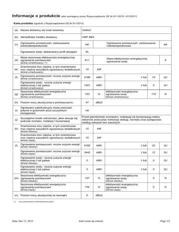 Informacje o produkcie jako wymagany przez Rozporządzenie UE Nr 811/2013 i 813/2013 Karta produktu (zgodnie z Rozporządzeniem UE Nr 811/2013) (a) Nazwa dostawcy lub znak towarowy Vaillant (b) Identyfikator modelu dostawcy VWF 88/4 (c) Ogrzewanie pomieszczeń: zastosowania średniotemperaturowe tak Ogrzewanie wody: deklarowany profil obciążeń XL Klasa sezonowej efektywności energetycznej (d) ogrzewania pomieszczeń Ogrzewanie pomieszczeń: zastosowania niskotemperaturowe Klasa efektywności energetycznej ogrzewania wody A++ (klimat umiarkowany), (*) Znamionowa moc cieplna, w tym znamionowa (e) moc cieplna wszystkich ogrzewaczy dodatkowych tak A 10 kW 5189 kWh i/ lub 19 GJ 1521 kWh i/ lub 0 GJ 153 % 110 % (klimat umiarkowany) (f) Ogrzewanie pomieszczeń: roczne zużycie energii (klimat umiarkowany) Ogrzewanie wody: roczne zużycie energii elektrycznej i/ lub paliwa (klimat umiarkowany) Sezonowa efektywność energetyczna (g) ogrzewania pomieszczeń (klimat umiarkowany) (klimat umiarkowany) (h) Poziom mocy akustycznej w pomieszczeniu (i) Ogrzewacz wielofunkcyjny może pracować jedynie w godzinach poza szczytowym obciążeniem (j) Szczególne środki ostrożności, jakie stosuje się podczas montażu, instalacji i konserwacji efektywność energetyczna ogrzewania wody 47 dB(A) nie Przed jakimkolwiek montażem, instalacją lub konserwacją należy starannie przeczytać instrukcje obsługi, montażu oraz postępować według wskazań tam zawartych. Znamionowa moc cieplna, w tym znamionowa (k) moc cieplna wszystkich ogrzewaczy dodatkowych 10 kW 10 kW 6160 kWh i/ lub 22 GJ 3442 kWh i/ lub 12 GJ 0 kWh i/ lub 0 GJ 0 kWh i/ lub 0 GJ 157 % 0 % 0 % (klimat chłodny) Znamionowa moc cieplna, w tym znamionowa moc cieplna wszystkich ogrzewaczy dodatkowych (klimat ciepły) (l) Ogrzewanie pomieszczeń: roczne zużycie energii (klimat chłodny) Ogrzewanie pomieszczeń: roczne zużycie energii (klimat ciepły) Ogrzewanie wody: roczne zużycie energii elektrycznej i/ lub paliwa (klimat chłodny) Ogrzewanie wody: roczne zużycie energii elektrycznej i/ lub paliwa (klimat ciepły) Sezonowa efektywność energetyczna (m) ogrzewania pomieszczeń (klimat chłodny) Sezonowa efektywność energetyczna ogrzewania pomieszczeń (klimat chłodny) 154 % (klimat ciepły) (n) Poziom mocy akustycznej na zewnątrz (*) efektywność energetyczna ogrzewania wody efektywność energetyczna ogrzewania wody (klimat ciepły) 0 dB(A) przy zastosowaniu średniotemperaturowym Data: Dec 17, 2015 treść może się zmienić Page 1/3 Wymagania informacji o produkcie (zgodnie z Rozporządzeniem UE Nr 813/2013) Model VWF 88/4 Pompa ciepła typu powietrze/ woda nie Niskotemperaturowa pompa ciepła nie Pompa ciepła woda/ woda nie Wyposażony w ogrzewacz dodatkowy tak Pompa ciepła solanka/ woda tak Ogrzewacz wielofunkcyjny z pompa ciepła tak Parametr Znamionowa moc cieplna (*) Symbol Wartość Prated 10 Jednostka kW Deklarowana wydajność grzewcza przy częściowym obciążeniu w temperaturze pomieszczenia 20 °C i temperaturze zewnętrznej Tj Parametr Symbol Sezonowa efektywność energetyczna ogrzewania pomieszczeń ɳs Wartość Jednostka 153 % Deklarowany wskaźnik efektywności lub wskaźnik zużycia energii pierwotnej przy częściowym obciążeniu w temperaturze pomieszczenia 20 °C i temperaturze zewnętrznej Tj Tj = -7 °C Pdh 9,0 kW Tj = -7 °C COPd 3,5 - Tj = +2 °C Pdh 8,9 kW Tj = +2 °C COPd 4,0 - Tj = +7 °C Pdh 8,9 kW Tj = +7 °C COPd 4,4 - Tj = +12 °C Pdh 8,9 kW Tj = +12 °C COPd 4,9 - Tj = temperatura dwuwartościowa Pdh 9,0 kW Tj = temperatura dwuwartościowa COPd 3,5 - Tj = graniczna temperatura robocza Pdh 9,0 kW Tj = graniczna temperatura robocza COPd 3,3 - Dla pomp ciepła powietrze/ woda: Tj = -15 °C (jeżeli TOL < -20 °C) Pdh 9,0 kW Dla pomp ciepła powietrze/ woda: Tj = -15 °C (jeżeli TOL < -20 °C) COPd 3,1 - temperatura dwuwartościowa Tbiv -7 °C Dla pomp ciepła powietrze/ woda: Graniczna temperatura robocza TOL 0,0 °C Wydajność w okresie cyklu w interwale dla ogrzewania Pcych 0,0 kW Efektywność energetyczna cyklu COPcyc 0 - Współczynnik strat (**) Cdh 0,0 - Graniczna temperatura robocza dla podgrzewania wody WTOL 65 °C Psup 1,1 kW Pobór mocy w trybach innych niż aktywny Dodatkowy ogrzewacz Tryb wyłączenia POFF 0,004 kW Znamionowa moc cieplna (*) Tryb wyłączonego termostatu PTO 0,007 kW Rodzaj pobieranej energii Pobór mocy w stanie czuwania PSB 0,007 kW W trybie wyłączonej grzałki karteru PCK 0,000 kW elektryczność Pozostałe parametry mieszany Regulacja wydajności Poziom mocy akustycznej w pomieszczeniu/ na zewnątrz LWA 47/ 0 dB Emisja tlenków azotu NOx 0 mg/ kWh Dla pomp ciepła powietrze/ woda: Znamionowy przepływ powietrza, na zewnątrz - 1 m³/h Dla pomp ciepła solanka/ woda Znamionowe natężenie przepływu solanki lub wody, zewnętrzny wymiennik ciepła - 1 m³/h efektywność energetyczna ogrzewania wody ɳwh 110 % Dzienne zużycie paliwa Qfuel 0,000 kWh Dla wielofunkcyjnego ogrzewacza z pompą ciepła: Deklarowany profil obciążeń Dzienne zużycie energii elektrycznej Dane kontaktowe Data: Dec 17, 2015 XL Qelec 7,104 kWh Vaillant, Vaillant GmbHBerghauser Str. 4042859 RemscheidGermany treść może się zmienić Page 2/3 Szczególne środki ostrożności, jakie stosuje się podczas montażu, instalacji lub konserwacji ogrzewacza; istotne informacje dotyczące demontażu, recyklingu i/ lub usuwania pod koniec przydatności do użycia (*) (**) Przed jakimkolwiek montażem, instalacją lub konserwacją należy starannie przeczytać instrukcje obsługi, montażu oraz postępować według wskazań tam zawartych. Przed demontażem, recyklingiem i/ lub usuwaniem pod koniec przydatności do użycia należy starannie przeczytać instrukcje obsługi, montażu oraz postępować według wskazań tam zawartych. W przypadku ogrzewaczy pomieszczeń z pompą ciepła i wielofunkcyjnych ogrzewaczy z pompą ciepła znamionowa moc cieplna Prated jest równa obciążeniu obliczeniowe