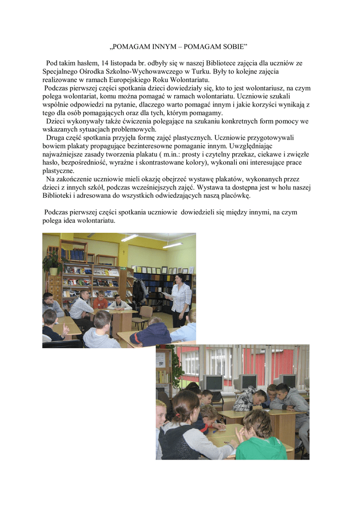 „POMAGAM INNYM – POMAGAM SOBIE” Pod takim hasłem, 14 listopada br. odbyły się w naszej Bibliotece zajęcia dla uczniów ze Specjalnego Ośrodka Szkolno-Wychowawczego w Turku. Były to kolejne zajęcia realizowane w ramach Europejskiego Roku Wolontariatu. Podczas pierwszej części spotkania dzieci dowiedziały się, kto to jest wolontariusz, na czym polega wolontariat, komu można pomagać w ramach wolontariatu. Uczniowie szukali wspólnie odpowiedzi na pytanie, dlaczego warto pomagać innym i jakie korzyści wynikają z tego dla osób pomagających oraz dla tych, którym pomagamy. Dzieci wykonywały także ćwiczenia polegające na szukaniu konkretnych form pomocy we wskazanych sytuacjach problemowych. Druga część spotkania przyjęła formę zajęć plastycznych. Uczniowie przygotowywali bowiem plakaty propagujące bezinteresowne pomaganie innym. Uwzględniając najważniejsze zasady tworzenia plakatu ( m.in.: prosty i czytelny przekaz, ciekawe i zwięzłe hasło, bezpośredniość, wyraźne i skontrastowane kolory), wykonali oni interesujące prace plastyczne. Na zakończenie uczniowie mieli okazję obejrzeć wystawę plakatów, wykonanych przez dzieci z innych szkół, podczas wcześniejszych zajęć. Wystawa ta dostępna jest w holu naszej Biblioteki i adresowana do wszystkich odwiedzających naszą placówkę. Podczas pierwszej części spotkania uczniowie dowiedzieli się między innymi, na czym polega idea wolontariatu. Potem zaczęła się aktywna praca twórcza A oto efekty pracy młodych artystów