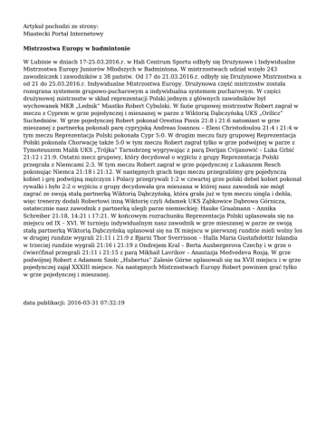 Artykuł pochodzi ze strony: Miastecki Portal Internetowy Mistrzostwa Europy w badmintonie W Lubinie w dniach 17-25.03.2016.r. w Hali Centrum Sportu odbyły się Drużynowe i Indywidualne Mistrzostwa Europy Juniorów Młodszych w Badmintona. W mistrzostwach udział wzięło 243 zawodniczek i zawodników z 38 państw. Od 17 do 21.03.2016.r. odbyły się Drużynowe Mistrzostwa a od 21 do 25.03.2016.r. Indywidualne Mistrzostwa Europy. Drużynowa część mistrzostw została rozegrana systemem grupowo-pucharowym a indywidualna systemem pucharowym. W części drużynowej mistrzostw w skład reprezentacji Polski jednym z głównych zawodników był wychowanek MKB „Lednik” Miastko Robert Cybulski. W fazie grupowej mistrzostw Robert zagrał w meczu z Cyprem w grze pojedynczej i mieszanej w parze z Wiktorią Dąbczyńską UKS „Orilicz” Suchedniów. W grze pojedynczej Robert pokonał Orestisa Pissis 21:8 i 21:6 natomiast w grze mieszanej z partnerką pokonali parę cypryjską Andreas Ioannou – Eleni Christodoulou 21:4 i 21:4 w tym meczu Reprezentacja Polski pokonała Cypr 5:0. W drugim meczu fazy grupowej Reprezentacja Polski pokonała Chorwację także 5:0 w tym meczu Robert zagrał tylko w grze podwójnej w parze z Tymoteuszem Malik UKS „Trójka” Tarnobrzeg wygrywając z parą Dorijan Cvijanowić – Luka Grbić 21:12 i 21:9. Ostatni mecz grupowy, który decydował o wyjściu z grupy Reprezentacja Polski przegrała z Niemcami 2:3. W tym meczu Robert zagrał w grze pojedynczej z Lukaszem Resch pokonując Niemca 21:18 i 21:12. W następnych grach tego meczu przegraliśmy grę pojedynczą kobiet i grę podwójną mężczyzn i Polacy przegrywali 1:2 w czwartej grze polski debel kobiet pokonał rywalki i było 2:2 o wyjściu z grupy decydowała gra mieszana w której nasz zawodnik nie mógł zagrać ze swoją stałą partnerką Wiktorią Dąbczyńską, która grała już w tym meczu singla i debla, więc trenerzy dodali Robertowi inną Wiktorię czyli Adamek UKS Ząbkowice Dąbrowa Górnicza, ostatecznie nasz zawodnik z partnerką ulegli parze niemieckiej: Hauke Graalmann – Annika Schreiber 21:18, 14:21 i 17:21. W końcowym rozrachunku Reprezentacja Polski uplasowała się na miejscu od IX – XVI. W turnieju indywidualnym nasz zawodnik w grze mieszanej w parze ze swoją stałą partnerką Wiktorią Dąbczyńską uplasował się na IX miejscu w pierwszej rundzie mieli wolny los w drugiej rundzie wygrali 21:11 i 21:9 z Bjarni Thor Sverrisson – Halla Maria Gustafsdottir Islandia w trzeciej rundzie wygrali 21:16 i 21:19 z Ondrejem Kral – Berta Ausbergerova Czechy i w grze o ćwierćfinał przegrali 21:11 i 21:15 z parą Mikhaił Lavrikov – Anastazja Medvedeva Rosją. W grze podwójnej Robert z Adamem Szolc „Hubertus” Zalesie Górne uplasowali się na XVII miejscu i w grze pojedynczej zajął XXXIII miejsce. Na następnych Mistrzostwach Europy Robert powinien grać tylko w grze pojedynczej i mieszanej. data publikacji: 2016-03-31 07:32:19