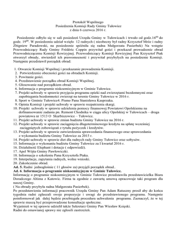 Protokół Wspólnego Posiedzenia Komisji Rady Gminy Tułowice z dnia 6 czerwca 2016 r. Posiedzenie odbyło się w sali posiedzeń Urzędu Gminy w Tułowicach i trwało od godz.1600 do godz. 1900. W posiedzeniu udział wzięło 12 radnych ( nieobecny był radny Krzysztof Mróz i radny Zbigniew Paradowski, na posiedzenie spóźniła się radna Małgorzata Pasierbek) Na wstępie Przewodniczący Rady Gminy Frédéric Coppin przywitał gości i przekazał prowadzenie obrad Przewodniczącemu Komisji Rewizyjnej. Przewodniczący Komisji Rewizyjnej Pan Krzysztof Ptak otworzył obrady, stwierdził ich prawomocność i przywitał przybyłych na posiedzenie Komisji. Następnie przedstawił porządek obrad: 1. Otwarcie Komisji Wspólnej i przekazanie prowadzenia Komisji. 2. Potwierdzenie obecności gości na obradach Komisji. 3. Powitanie gości. 4. Przedstawienie porządku obrad Komisji Wspólnej. 5. Głosowanie nad porządkiem obrad. 6. Informacja o programie niskoemisyjnym w Gminie Tułowice. 7. Projekt uchwały w sprawie przyjęcia programu opieki nad zwierzętami bezdomnymi oraz zapobiegania bezdomności zwierząt na terenie Gminy Tułowice w 2016 r. 8. Sport w Gminie Tułowice4. Pismo Pana Stanisława Kasprzaka. 9. Opinia Komisji i projekt uchwały w sprawie rozpatrzenia skargi. 10. Projekt uchwały w sprawie udzielenia pomocy finansowej Powiatowi Opolskiemu na dofinansowanie zadania pn. Remont Chodnika w ciągu ulicy Opolskiej w Tułowicach – droga powiatowa nr 1513 O Skarbiszowice – Tułowice. 11. Projekt uchwały w sprawie zmian budżetu Gminy Tułowice na 2016 r. 12. Projekt uchwały w sprawie zaciągnięcia długoterminowego kredytu na spłatę wcześniej zaciągniętych zobowiązań z tytułu pożyczek i kredytów. 13. Projekt uchwały w sprawie zatwierdzenia sprawozdania finansowego oraz sprawozdania z wykonania budżetu Gminy Tułowice za 2015 r. 14. Projekt uchwały w sprawie diet dla radnych rady Gminy Tułowice oraz sołtysów. 15. Informacja o wykonaniu budżetu Gminy Tułowice za I kwartał 2016 r. 16. Działalność Elephant i dotacje ( odpowiedź). 17. Apel Wójta Gminy Pawłowiczki. 18. Informacja o szkoleniu Pana Krzysztofa Ptaka. 19. Interpelacje, zapytania radnych, wolne wnioski. 20. Zakończenie obrad. Ad. 5. Radni jednogłośnie ( 11 głosów za) przyjęli porządek obrad.. Ad. 6. Informacja o programie niskoemisyjnym w Gminie Tułowice. Informację o programie niskoemisyjnym w Gminie Tułowice przedstawiła przedstawicielka Biura Doradczego Altima z Katowic. Firma ta zgodnie z zawartą umową opracowuje taki program dla naszej Gminy. ( Na obrady przybyła radna Małgorzata Pasierbek). Po przedstawieniu informacji pracownik Urzędu Gminy Pan Adam Ratuszny prosił aby do końca tygodnia radni zgłaszali swoje propozycje i uwagi do przedstawionego programu. Następnie poinformował jak dalej będzie przebiegała procedura uchwalenia programu. Zaznaczył, że w tej sprawie muszą być przeprowadzone konsultacje społeczne. Wyjaśnień w tej sprawie udzielił także Sekretarz Gminy Pan Wiesław Księski. Radni do omawianej sprawy nie zgłosili zastrzeżeń. Ad.7. Projekt uchwały w sprawie przyjęcia programu opieki nad zwierzętami bezdomnymi oraz zapobiegania bezdomności zwierząt na terenie Gminy Tułowice w 2016 r. Sprawę omówiła pracownica Urzędu Gminy Tułowice Pani Aleksandra Franciszków. Radni do omawianego projektu uchwały nie zgłosili zastrzeżeń. Ad. 8. Sport w Gminie Tułowice4. Pismo Pana Stanisława Kasprzaka. Pan Stanisław Kasprzak przedstawił swoje uwagi i propozycje dotyczące finansowania sportu w Gminnym Zespole Szkół w Tułowicach oraz o zagrożeniach jakie mogą z tego wyniknąć. Zwrócił się do Rady Gminy o pomoc w utworzeniu w GZSZ klas sportowych. Pan Stanisław Kasprzak poinformował o organizowanych w szkole imprezach sportowych i o osiągnieciach uczniów w zakresie sportu. Radni w wyniku dyskusji stwierdzili, że nikt do tej pory nie zgłaszał takich problemów i stwierdzili, że w tej sprawie swoje stanowisko powinna zająć dyrekcja szkoły. Przerwa. Ad. 9. Opinia Komisji i projekt uchwały w sprawie rozpatrzenia skargi. Komisja przedyskutowała sprawę . Ad.10. Projekt uchwały w sprawie udzielenia pomocy finansowej Powiatowi Opolskiemu na dofinansowanie zadania pn. Remont Chodnika w ciągu ulicy Opolskiej w Tułowicach – droga powiatowa nr 1513 O Skarbiszowice – Tułowice. Skarbnik Gminy Pani Bożena Gąska szczegółowo omówiła przedłożony projekt uchwały oraz udzieliła wyjaśnień na pytania radnych. Wójt Gminy także udzielił wyjaśnień na pytania radnych. Radni do przedłożonego projektu uchwały nie zgłosili zastrzeżeń. Ad.11. Projekt uchwały w sprawie zmian budżetu Gminy Tułowice na 2016 r. oraz Ad.12. Projekt uchwały w sprawie zaciągnięcia długoterminowego kredytu na spłatę wcześniej zaciągniętych zobowiązań z tytułu pożyczek i kredytów. Skarbnik Gminy Pani Bożena Gąska szczegółowo omówiła przedłożone projekty uchwał oraz udzieliła wyjaśnień na pytania radnych. Radni do przedłożonych projektów uchwał nie zgłosili zastrzeżeń. Ad.13. Projekt uchwały w sprawie zatwierdzenia sprawozdania finansowego oraz sprawozdania z wykonania budżetu Gminy Tułowice za 2015 r. Skarbnik Gminy Pani Bożena Gąska szczegółowo omówiła przedłożony projekt uchwały oraz udzieliła wyjaśnień na pytania radnych. Wójt Gminy także udzielił wyjaśnień na pytania radnych. Radni do przedłożonego projektu uchwały nie zgłosili zastrzeżeń. Ad.14. Projekt uchwały w sprawie diet dla radnych rady Gminy Tułowice oraz sołtysów. Wyjaśnień w tej sprawie udzielił Sekretarz Gminy Pan Wiesław Księski. Głos w tej sprawie zabrał także Pan Wójt. Radni do przedłożonego projektu uchwały nie zgłosili zastrzeżeń Ad.15. Informacja o wykonaniu budżetu Gminy Tułowice za I kwartał 2016 r. Skarbnik Gminy Pani Bożena Gąska omówiła przedłożone sprawozdanie. Radni do przedło