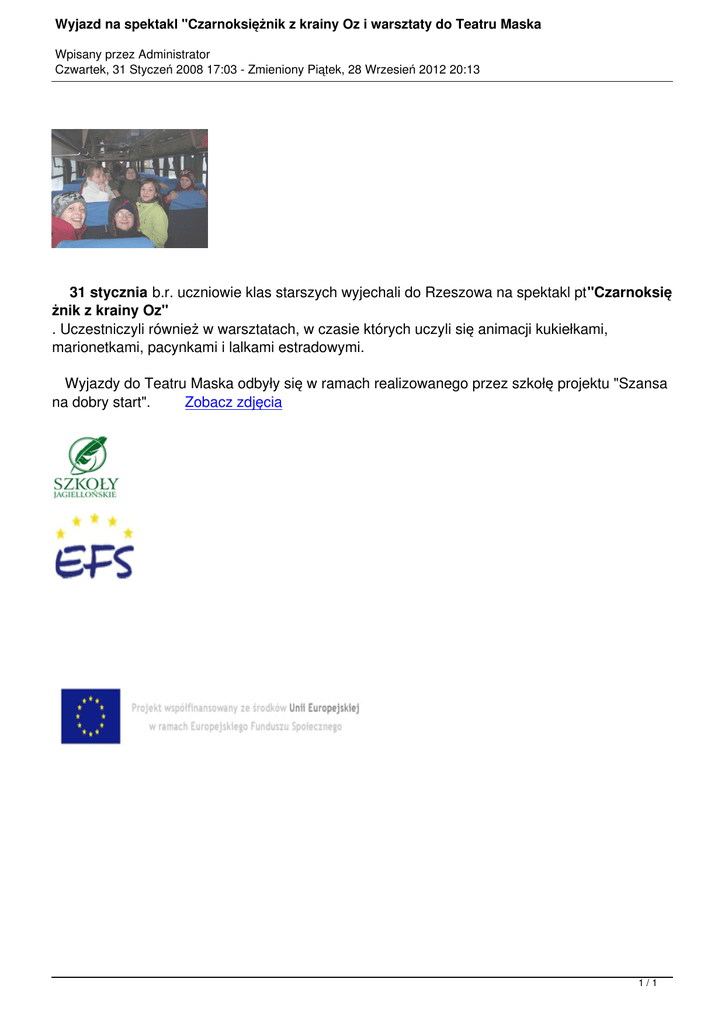 Wyjazd na spektakl "Czarnoksiężnik z krainy Oz i warsztaty do Teatru Maska Wpisany przez Administrator Czwartek, 31 Styczeń 2008 17:03 - Zmieniony Piątek, 28 Wrzesień 2012 20:13 31 stycznia b.r. uczniowie klas starszych wyjechali do Rzeszowa na spektakl pt"Czarnoksię żnik z krainy Oz" . Uczestniczyli również w warsztatach, w czasie których uczyli się animacji kukiełkami, marionetkami, pacynkami i lalkami estradowymi. Wyjazdy do Teatru Maska odbyły się w ramach realizowanego przez szkołę projektu "Szansa na dobry start". Zobacz zdjęcia 1/1