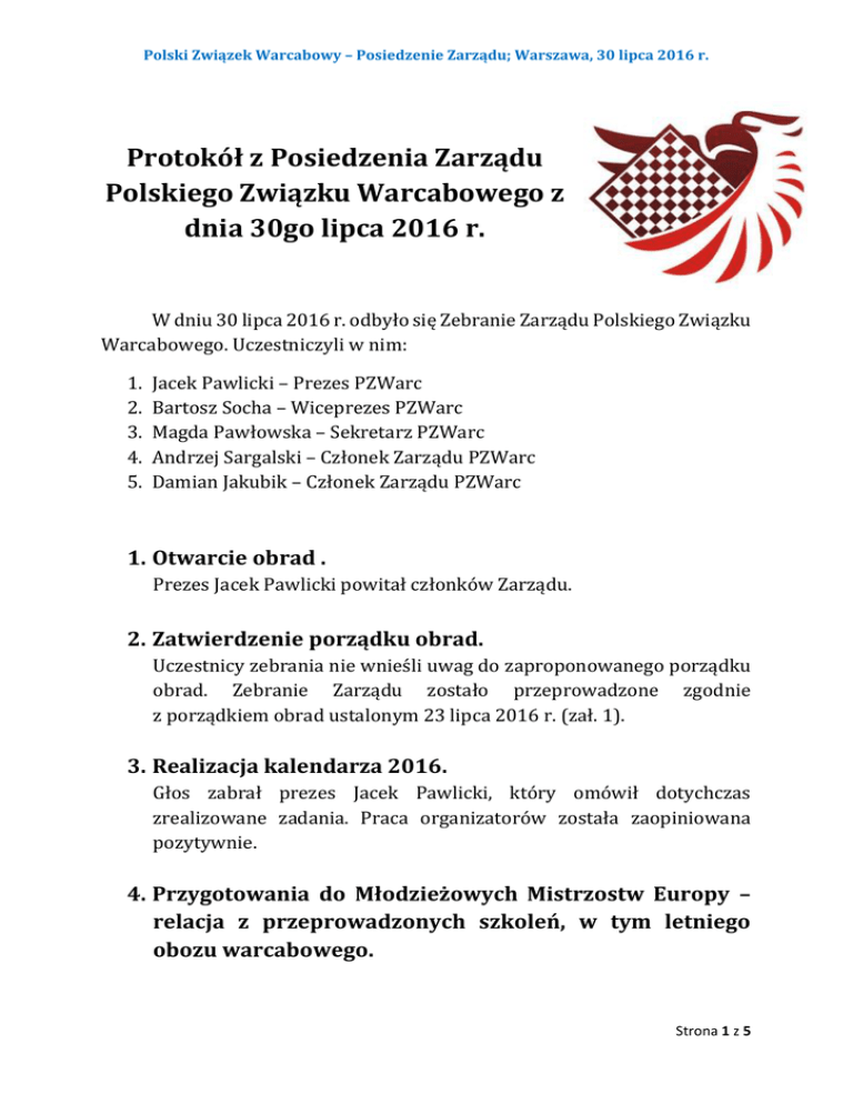 Polski Związek Warcabowy – Posiedzenie Zarządu; Warszawa, 30 lipca 2016 r. Protokół z Posiedzenia Zarządu Polskiego Związku Warcabowego z dnia 30go lipca 2016 r. W dniu 30 lipca 2016 r. odbyło się Zebranie Zarządu Polskiego Związku Warcabowego. Uczestniczyli w nim: 1. 2. 3. 4. 5. Jacek Pawlicki – Prezes PZWarc Bartosz Socha – Wiceprezes PZWarc Magda Pawłowska – Sekretarz PZWarc Andrzej Sargalski – Członek Zarządu PZWarc Damian Jakubik – Członek Zarządu PZWarc 1. Otwarcie obrad . Prezes Jacek Pawlicki powitał członków Zarządu. 2. Zatwierdzenie porządku obrad. Uczestnicy zebrania nie wnieśli uwag do zaproponowanego porządku obrad. Zebranie Zarządu zostało przeprowadzone zgodnie z porządkiem obrad ustalonym 23 lipca 2016 r. (zał. 1). 3. Realizacja kalendarza 2016. Głos zabrał prezes Jacek Pawlicki, który omówił dotychczas zrealizowane zadania. Praca organizatorów została zaopiniowana pozytywnie. 4. Przygotowania do Młodzieżowych Mistrzostw Europy – relacja z przeprowadzonych szkoleń, w tym letniego obozu warcabowego. Strona 1 z 5 Polski Związek Warcabowy – Posiedzenie Zarządu; Warszawa, 30 lipca 2016 r. Członek Zarządu, Damian Jakubik, przedstawił relację z Letniego Obozu Warcabowego, który odbył się w Więcborku. Podczas tego obozu zajęcia warcabowe prowadzili: N. Sadowska, E. Watutin, D. Jakubik oraz D. Reszka. Był to pilotażowy program, który został bardzo dobrze przyjęty przez uczestników oraz opiekunów. Zarząd planuje drugą edycję obozu w Więcborku, tygodniową, która odbędzie się tuż po zakończeniu roku szkolnego 2016/2017. Szkolenie będzie skierowane zarówno dla początkujących jak i dla zaawansowanych zawodników. Podsumowując przygotowania kadry do Młodzieżowych Mistrzostw Europy należy zaznaczyć, iż osoby ze starszych grup wiekowych chętnie biorą udział w imprezach seniorskich, w tym międzynarodowych, dzięki czemu zdobywają cenne doświadczenie. 5. Przygotowania do meczu o Mistrzostwo Świata Kobiet. Omówione zostały dotychczasowe ustalenia dotyczące wydarzenia. 6. Przygotowania do turnieju Polish Open – podział obowiązków. Omówiona została sytuacja finansowa turnieju. Prezes Jacek Pawlicki przedstawił podział obowiązków związanych z turniejem. 7. Przygotowania do pozostałych turniejów warcabowych, w tym Młodzieżowych Mistrzostw Świata, Drużynowych Mistrzostw Europy. Temat został omówiony przez Prezesa, Jacka Pawlickiego, oraz Członka Zarządu, Damiana Jakubika. Przedstawione zostały założenia co do uczestnictwa Reprezentantów Polski w MMŚ. Kadra będzie ustalona po MME. Planuje się, iż w Młodzieżowych Mistrzostwach Świata dofinansowany będzie udział 8 reprezentantów. Prawo uczestnictwa w turnieju będzie miało 24 zawodników (po 3 w każdej kategorii). Ustalona została kadra seniorska, która weźmie udział w Drużynowych Mistrzostwach Europy. Strona 2 z 5 Polski Związek Warcabowy – Posiedzenie Zarządu; Warszawa, 30 lipca 2016 r. 8. Projekt kalendarza 2017 – dyskusja. Sekretarz, Magda Pawłowska, przedstawiła otrzymane oferty organizacji turniejów w roku 2017. Prezes, Jacek Pawlicki, zobligował się do przygotowania kalendarza na rok 2017. Wnioski ofertowe nie zostały zaopiniowane. 9. Dyskusja na temat przygotowań do OOM 2017. Głos zabrał Wiceprezes, Bartosz Socha, który poinformował Zarząd, iż przyszłoroczna Ogólnopolska Olimpiada Młodzieży odbędzie się w Drzonkowie w dniach 24-28 kwietnia. Będzie ona zorganizowana przez Lubuską Federację Sportu. Zaproponowano aby zwiększyć ilość zawodników w poszczególnych grupach wiekowych (dziewczęta oraz chłopcy 8-10 oraz 11-13) oraz trenerów i zmniejszyć ilość sędziów obsługujących turniej. Złożenie stosownego wniosku zostało zlecone Wiceprezesowi, Bartoszowi Socha. 10. Przygotowania do Młodzieżowych Mistrzostw Świata (Dąbki, 2017). Prezes, Jacek Pawlicki, omówił ogólne warunki oraz zadania związane z turniejem. 11. Powołanie Komisarza Kolegium Sędziowskiego. Wiceprezes, Bartosz Socha, przedstawił kandydatów, którzy zgłosili chęć pełnienia tej funkcji. Byli to: Konrad Bieżyca, Mirosław Grabski, Jan Gnutek raz Sylwester Flisikowski. Głosowanie miało przebieg dwuetapowy: każdy z członków Zarządu wybrał spośród kandydatów 2 osoby. Największe poparcie uzyskali: Mirosław Grabski oraz Sylwester Flisikowski. Następnie przegłosowana została uchwała w sprawie powołania Komisarza Kolegium Sędziów. Uchwała nr 16/07/19 z dn. 30.07.2016 r. w sprawie powołania Komisarza Kolegium Sędziów. Głosowało 5 członków Zarządu: Za Mirosławem Grabskim – 1 głos, za Sylwestrem Flisikowskim – 3 głosy, wstrzymujący się – 1 głos – Zarząd PZWarc przyjął uchwałę. Strona 3 z 5 Polski Związek Warcabowy – Posiedzenie Zarządu; Warszawa, 30 lipca 2016 r. Na Komisarza Kolegium Sędziów powołano Sylwestra Flisikowskiego. 12. Ustalenia dotyczące zwołania Nadzwyczajnego WZD w sprawie nowego statutu. Sekretarz, Magda Pawłowska, przedstawiła propozycję porządku planowanego NWZD. Uchwała nr 16/07/20 z dn. 30.07.2016 r. w sprawie zwołania Nadzwyczajnego Walnego Zgromadzenia Delegatów Polskiego Związku Warcabowego w dniu 12 listopada 2016 (sobota) w Gnieźnie. Głosowało 5 członków Zarządu – Zarząd PZWarc przyjął jednogłośnie uchwałę. Porządek obrad Nadzwyczajnego Walnego Zgromadzenia Delegatów Polskiego Związku Warcabowego 1. Otwarcie obrad Nadzwyczajnego Walnego Zgromadzenia Delegatów Polskiego Związku Warcabowego. 2. Wybór Przewodniczącego Nadzwyczajnego Walnego Zgromadzenia Delegatów Polskiego Związku Warcabowego. 3. Stwierdzenie prawidłowości zwołania Nadzwyczajnego Walnego Zgromadzenia i jego zdolności do podejmowania uchwał. 4. Przyjęcie porządku obrad. 5. Powołanie Komisji Skrutacyjnej. 6. Omówienie głównych założeń nowego statutu. 7. Dyskusja nad nowym statutem. 8. Głosowanie w sprawie 