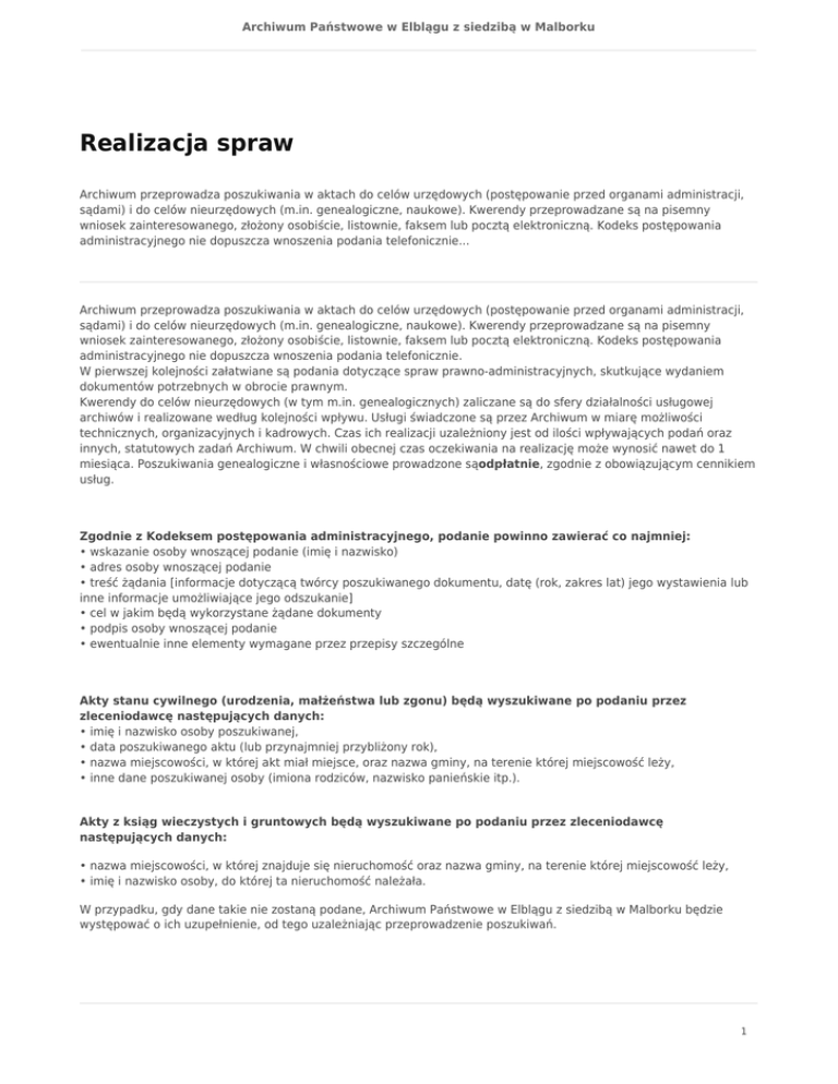 Realizacja spraw - Archiwum Państwowe w Elblągu z siedzibą w